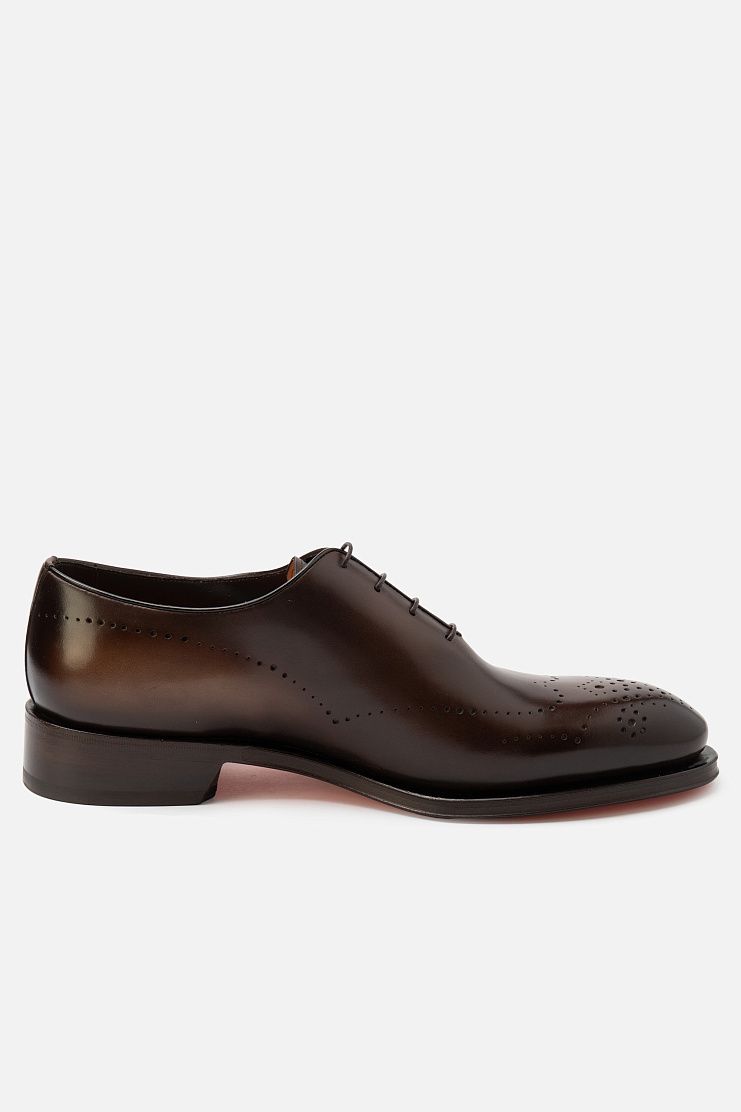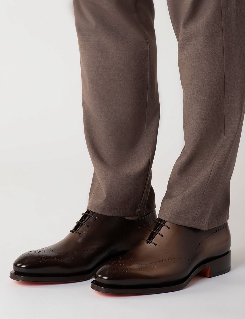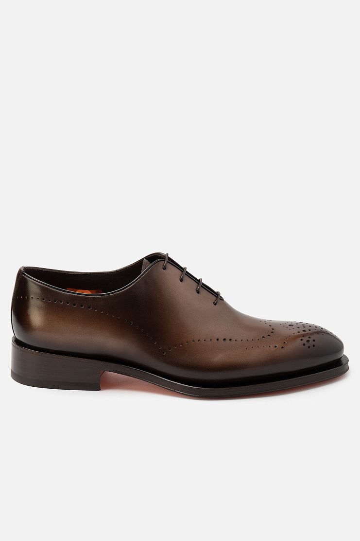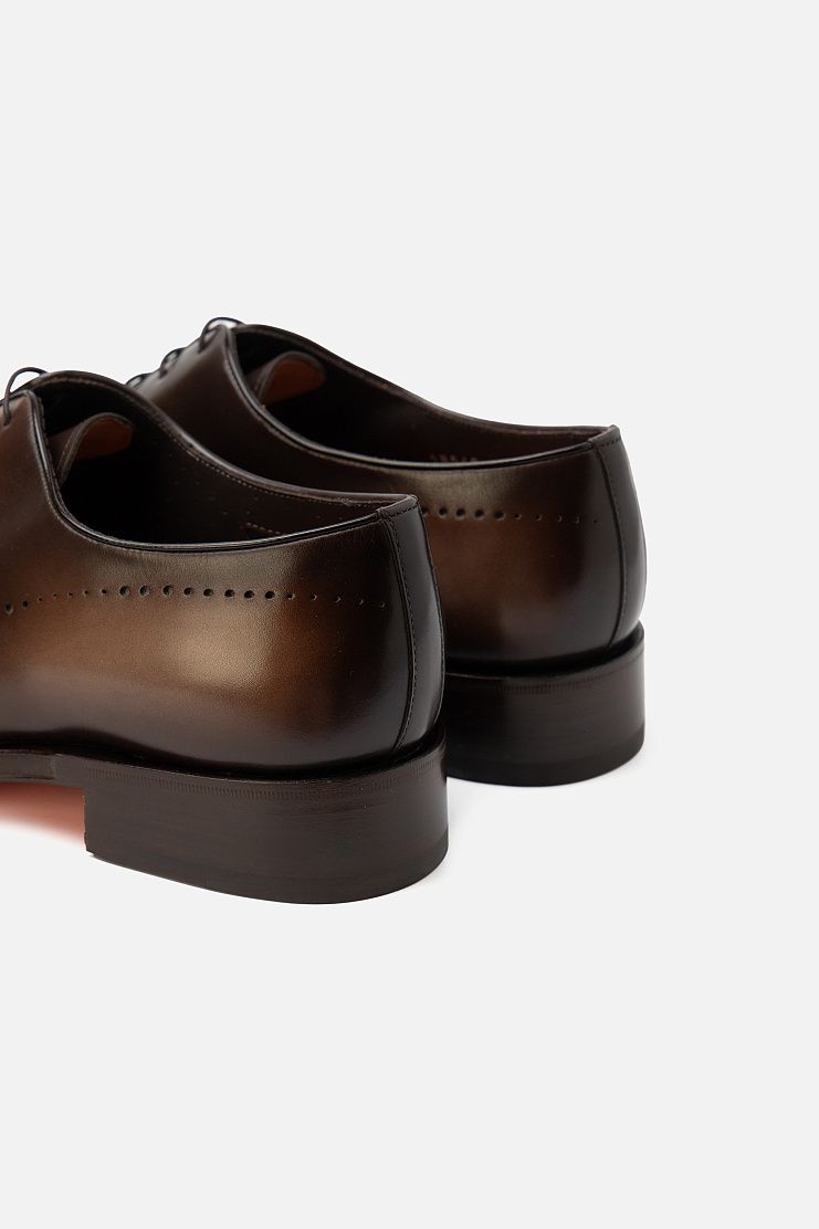 Туфли с закрытой шнуровкой выполнили из гладкой, отполированной до блеска телячьей кожи с брогированием. Чтобы получить эффект патины, пару окрасили в фирменной технике velatura.