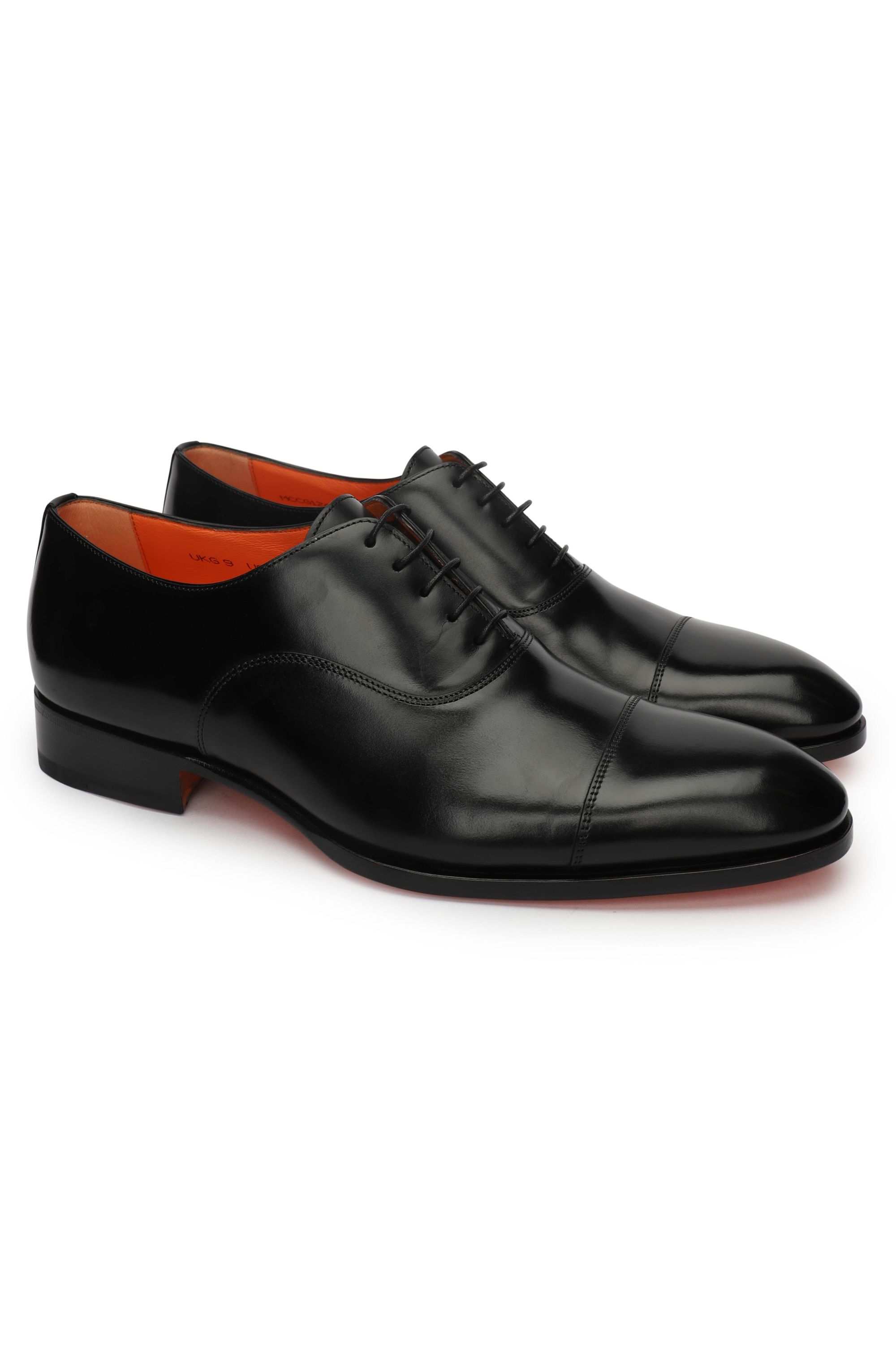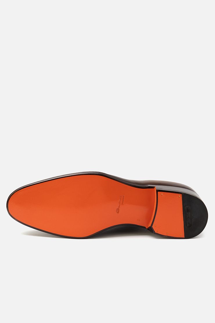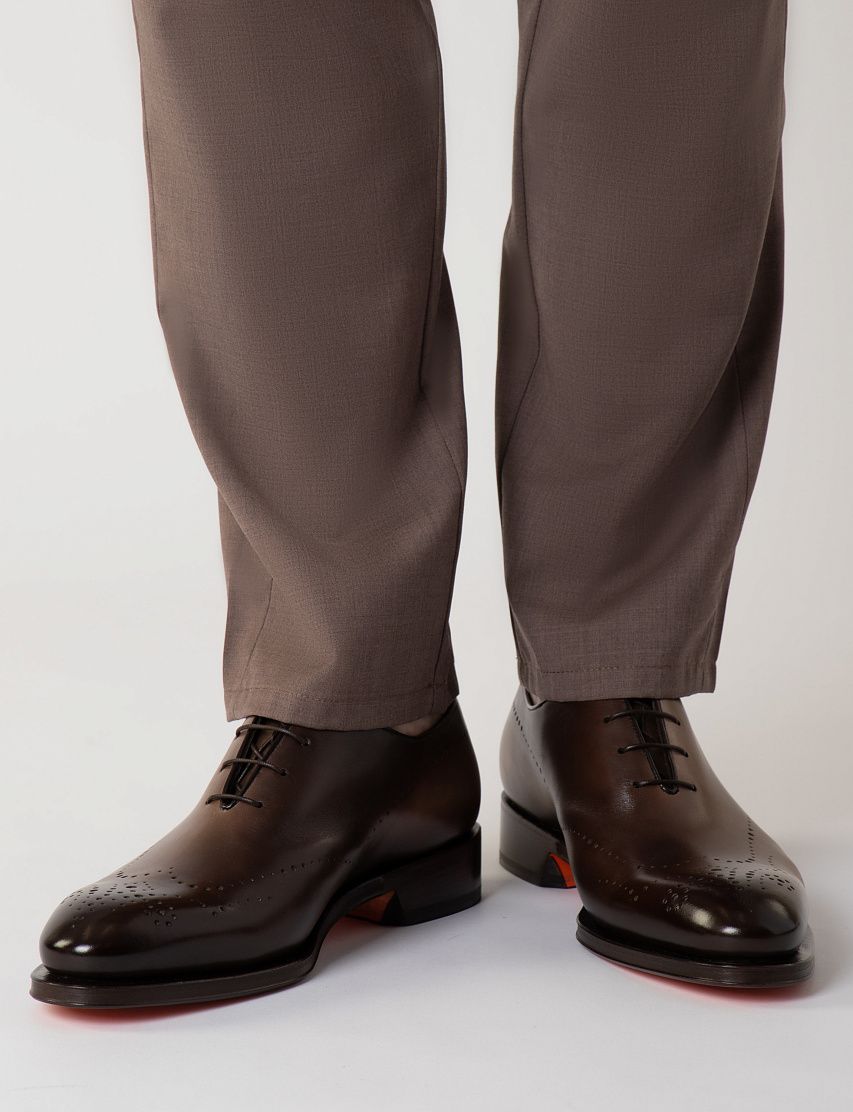 Туфли с закрытой шнуровкой выполнили из гладкой, отполированной до блеска телячьей кожи с брогированием. Чтобы получить эффект патины, пару окрасили в фирменной технике velatura.