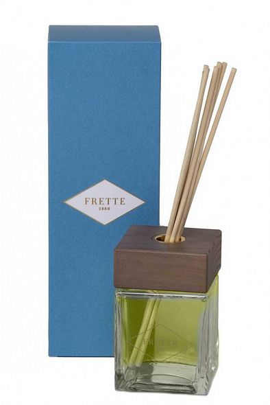 Аромат представлен в стеклянном флаконе с логотипом Frette и крышкой с отверстием для ароматической палочки.