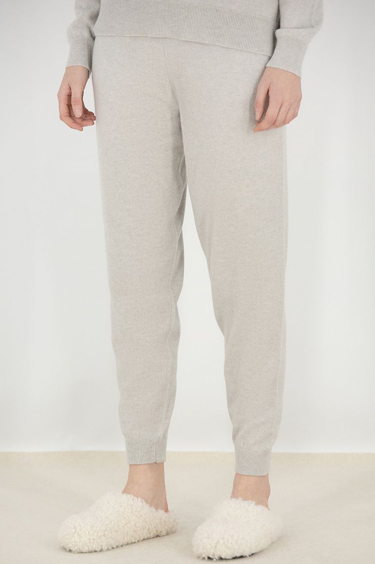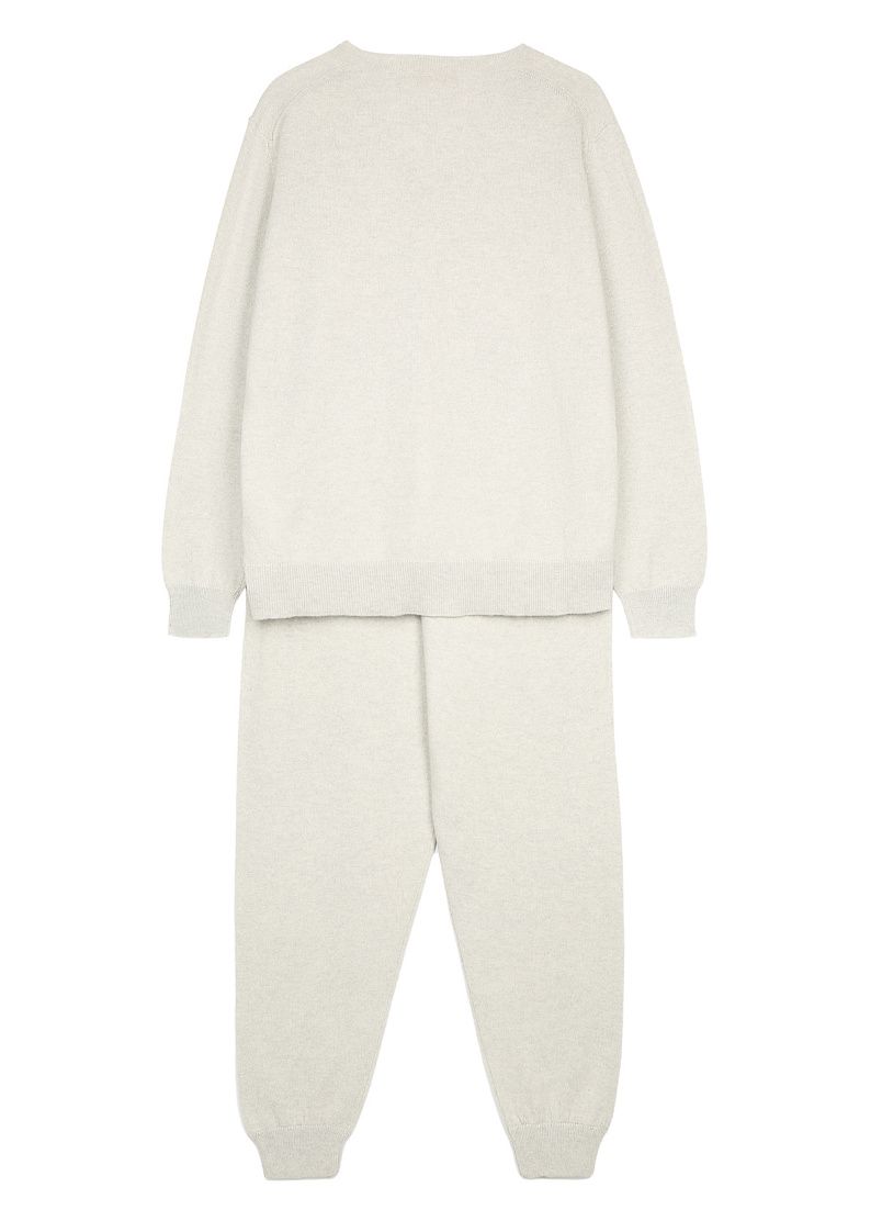 Кашемировый костюм серого цвета создан для комфортного домашнего отдыха. Джемпер с длинными рукавами и V-образным вырезом. Брюки свободного кроя с манжетами на щиколотках.