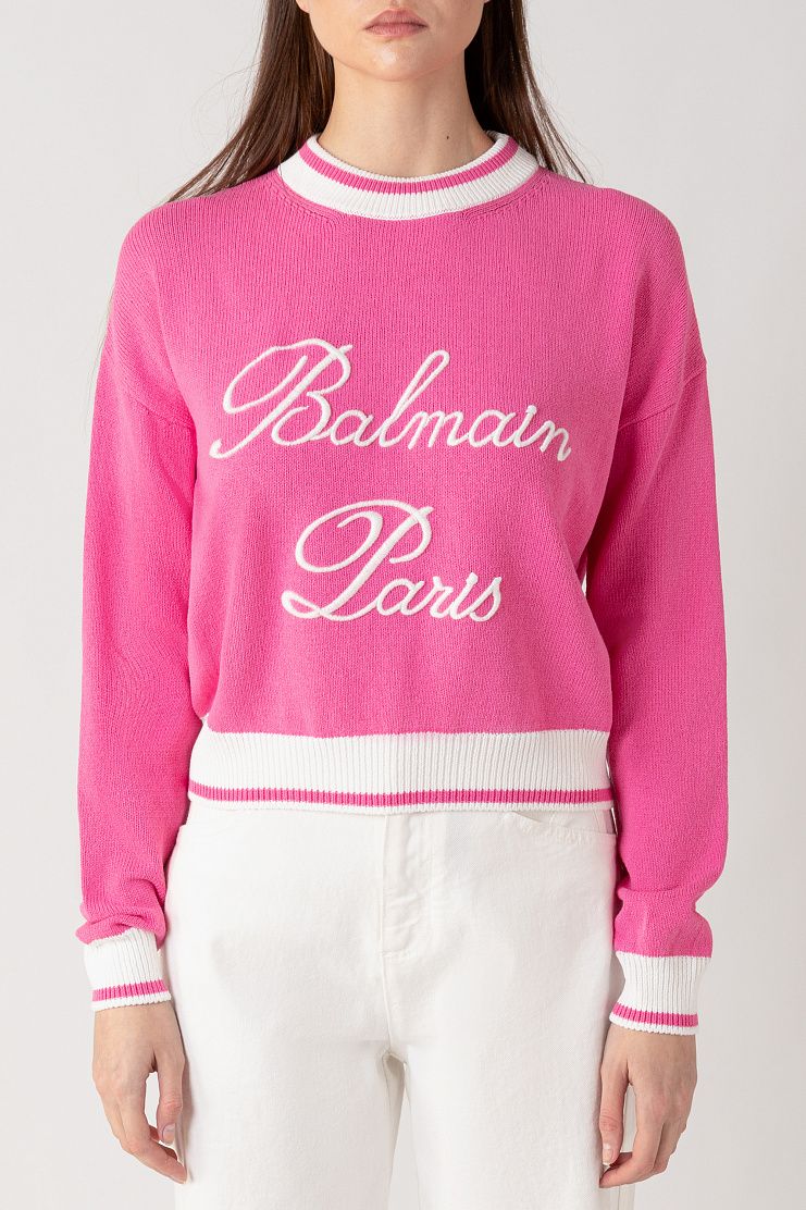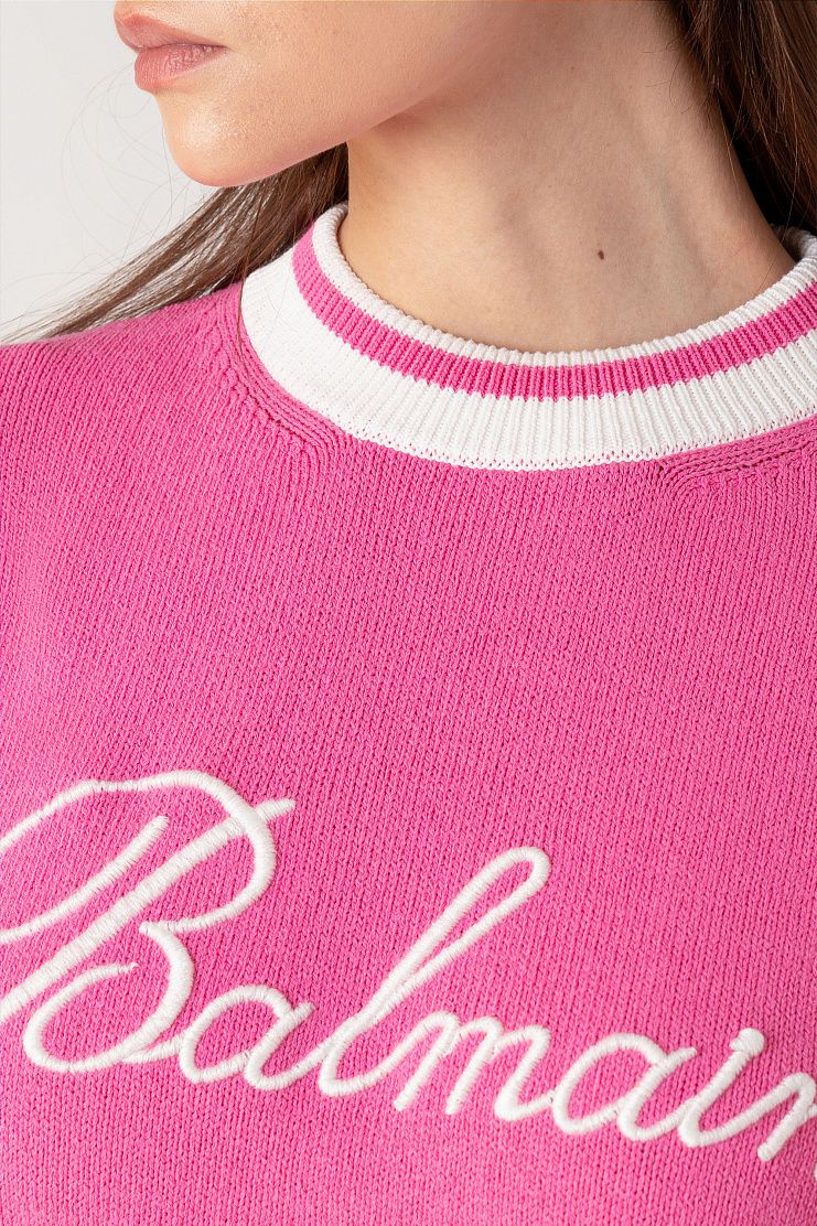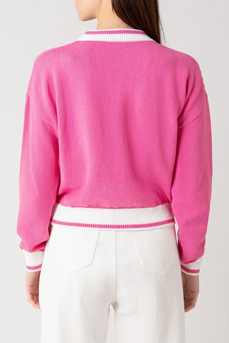 Джемпер свободного кроя выполнен из смесовой пряжи на основе хлопка и лиоцелла. Модель дополнена круглым вырезом, длинными рукавами со спущенной линией плеч и контрастной отделкой в рубчик. Ярким элементом декора выступает вышитый фирменный логотип на груди.