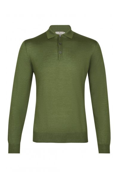 Джемпер-поло зеленого цвета из кашемира, шерсти и шелка. Модель свободного кроя с отложным воротником на пуговицах.