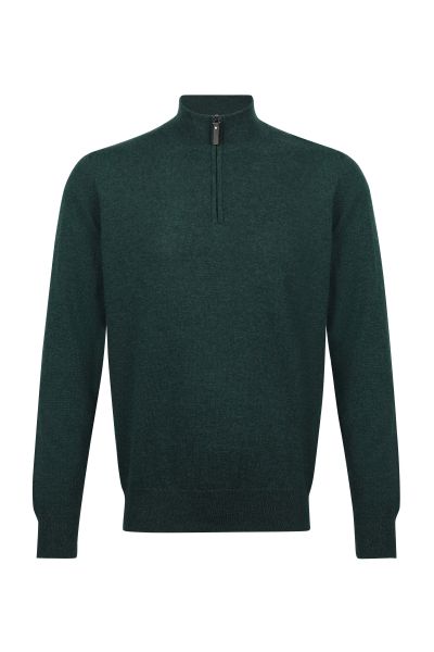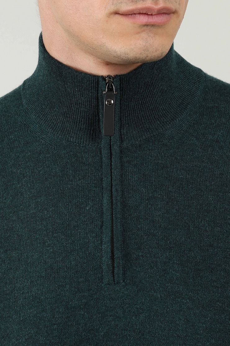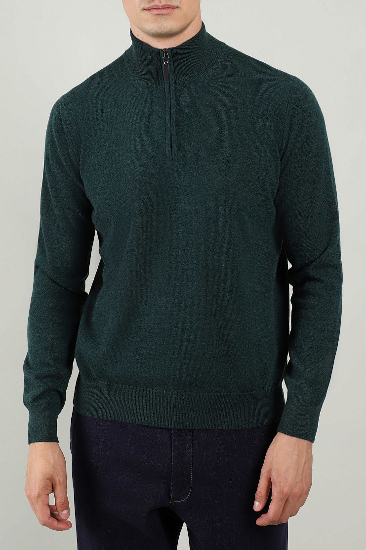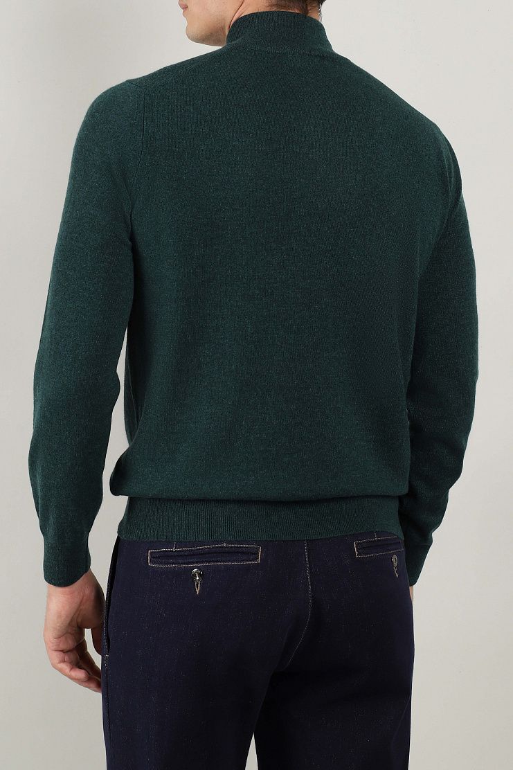 Кашемировый джемпер зеленого цвета подарит максимально комфортные ощущения при носке и прекрасно подойдет для холодной погоды. Модель имеет воротник-стойку на молнии с кожаной фурнитурой.