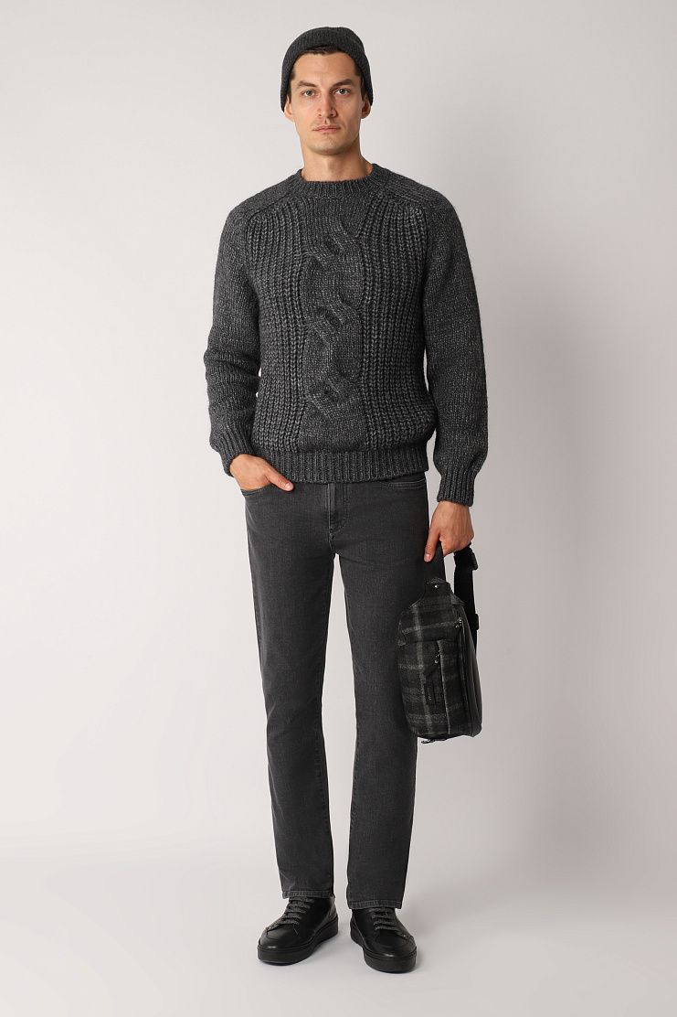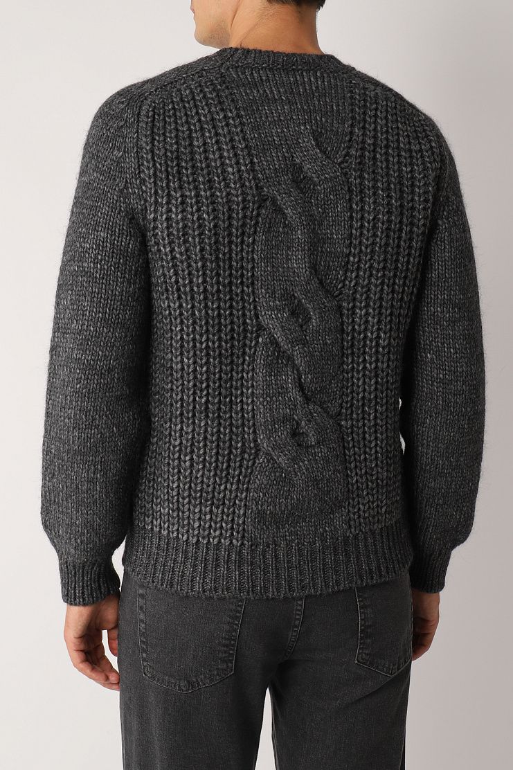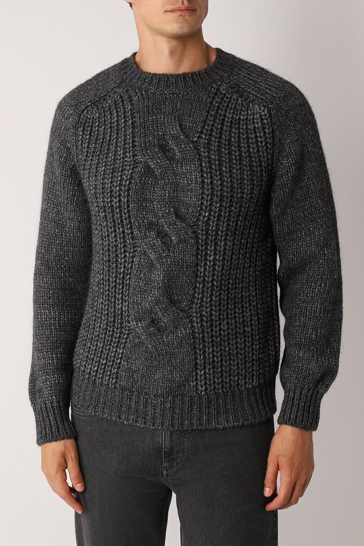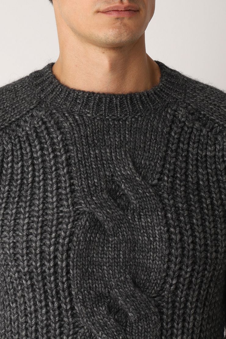 Серый джемпер выполнен на основе натуральной мягкой шерсти с добавлением нежной шелковистой шерсти альпака и гладкого акрила. Такой материал хорошо согревает, не колется и не вытягивается со временем. Джемпер дополнен рукавами реглан, украшен объемными узорами-косами и фактурным воротником.