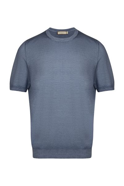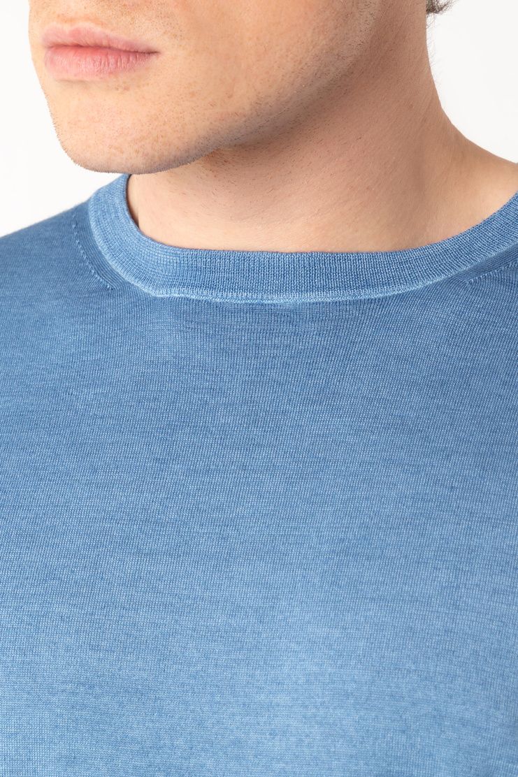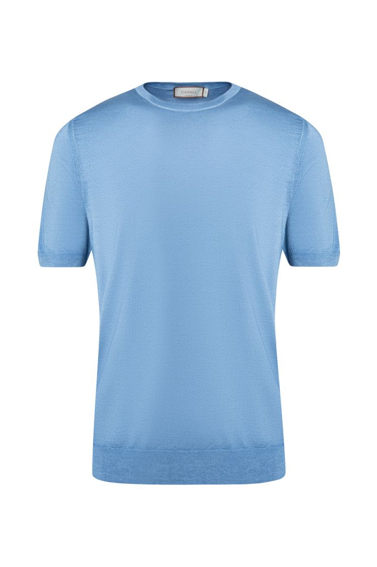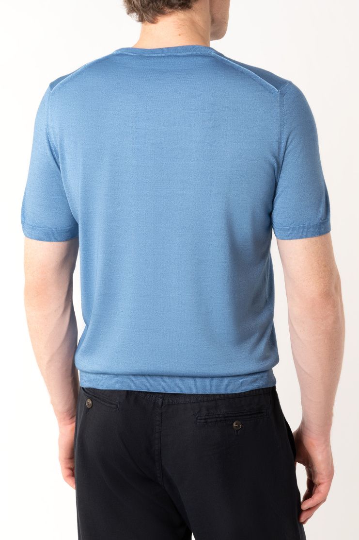 Джемпер с короткими рукавами изготовили из тонкого шерстяного трикотажа. Благодаря шелковым волокнам в составе ткань приобрела деликатный блеск. Модель с круглой горловиной дополнена отделкой в рубчик на манжетах и поясе.