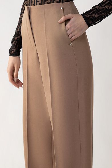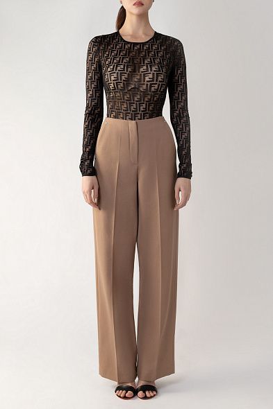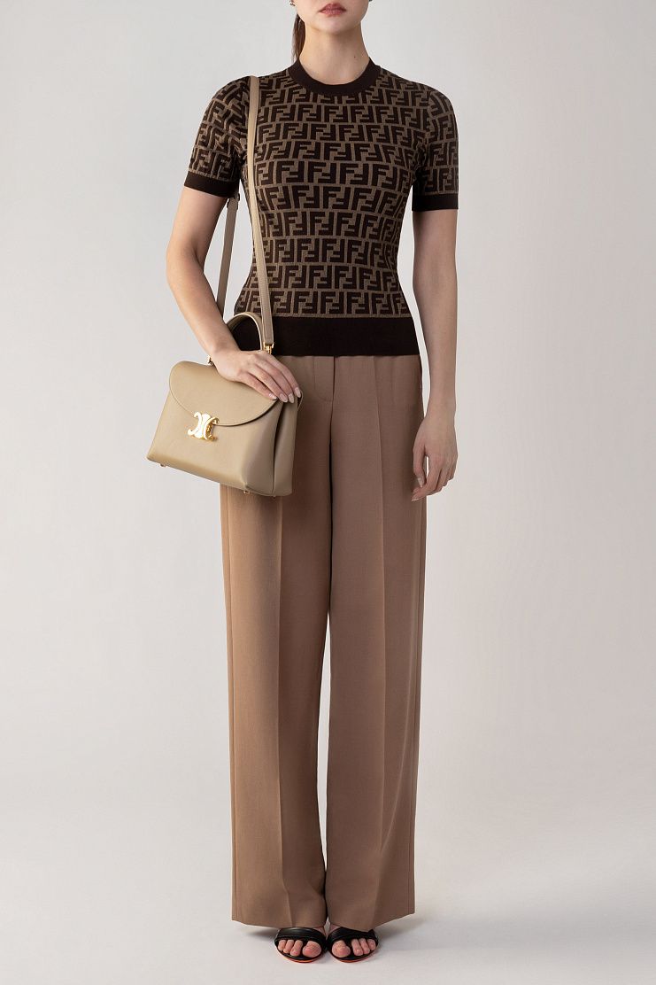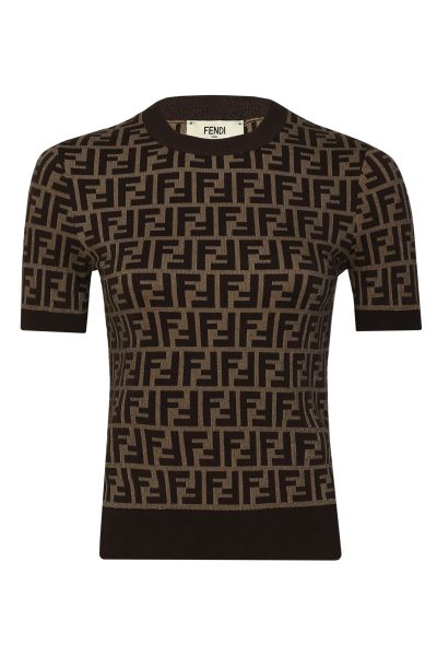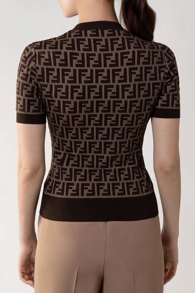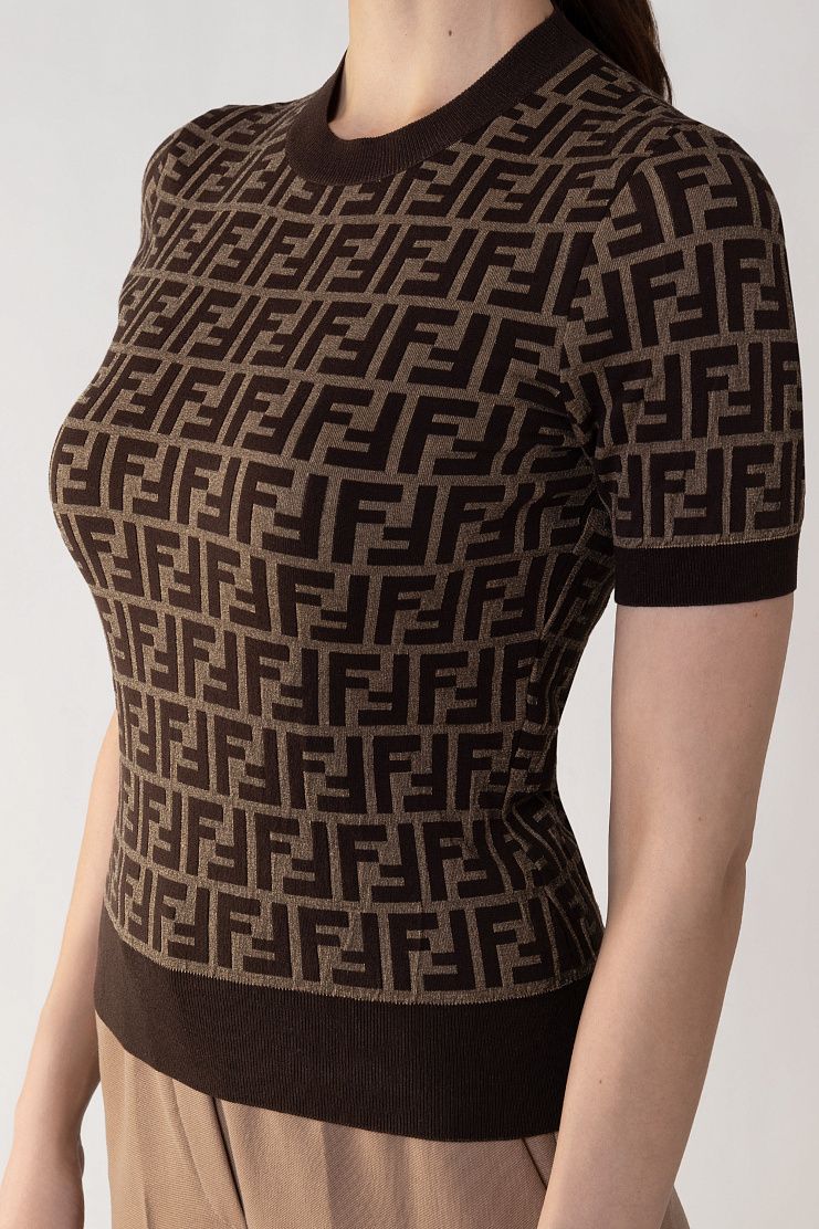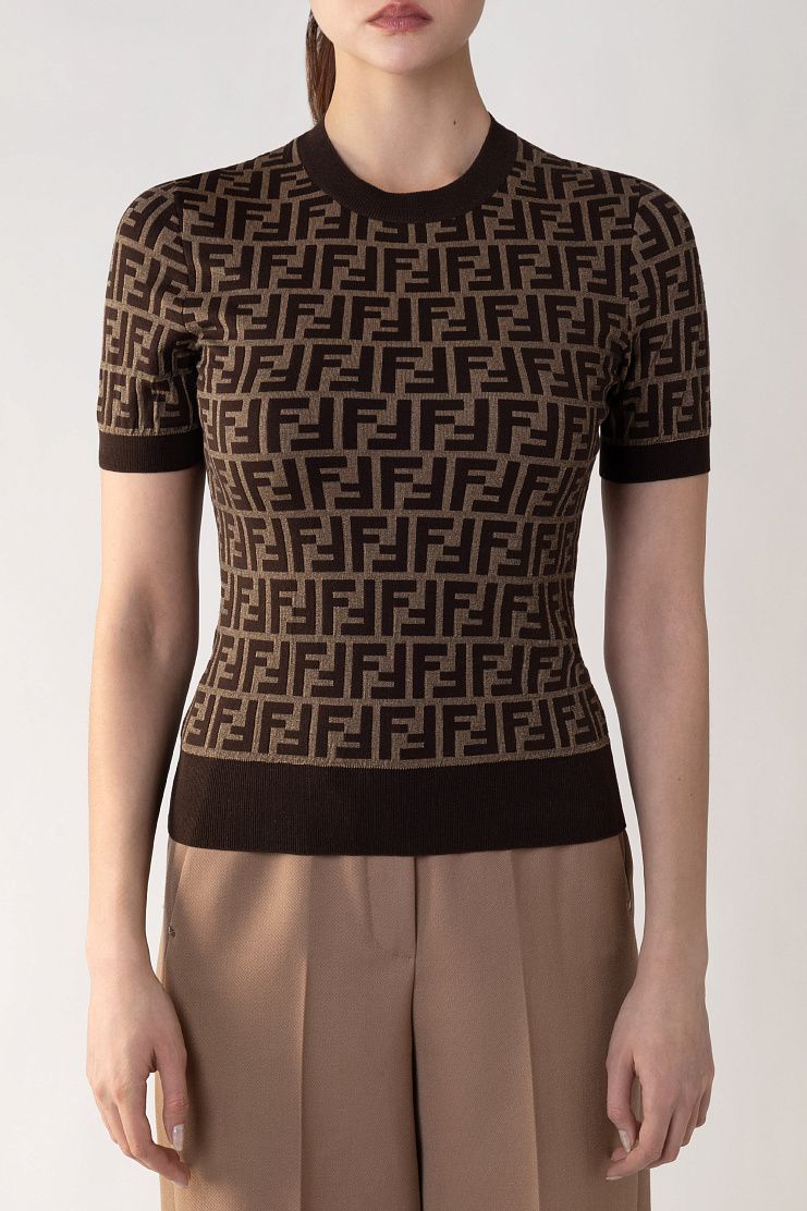 Облегающий джемпер с короткими рукавами выполнен из эластичного хлопкового трикотажа. Ткань отлично тянется, мягко облегая и обеспечивая комфортную посадку по фигуре. Модель дополнена однотонной рифленой отделкой на вороте, манжетах и поясе. В качестве основного элемента декора дизайнеры марки выбрали сплошной жаккардовый узор FF.