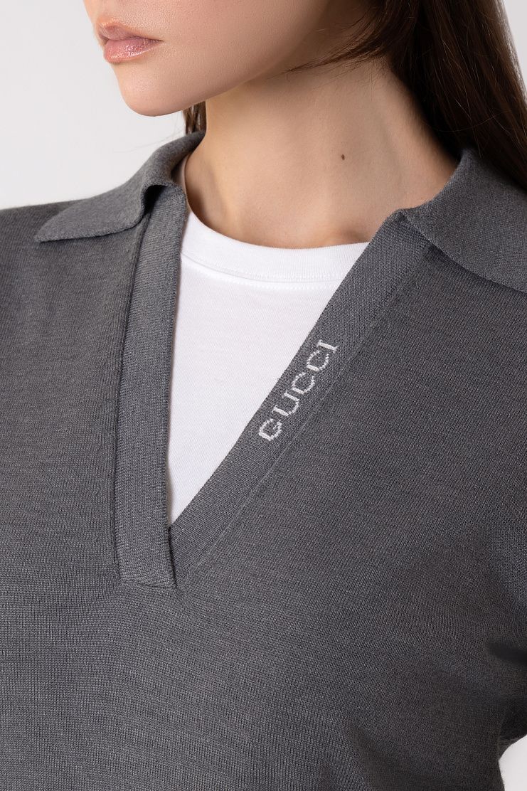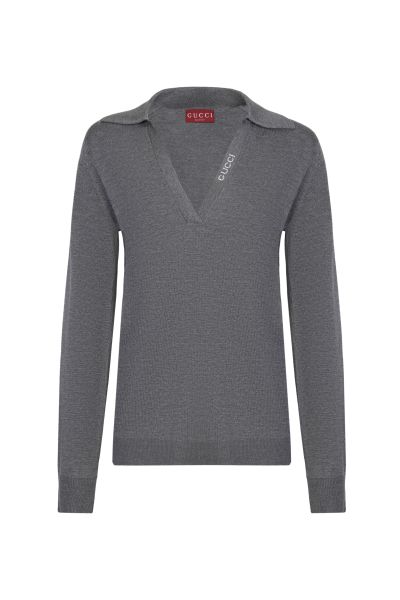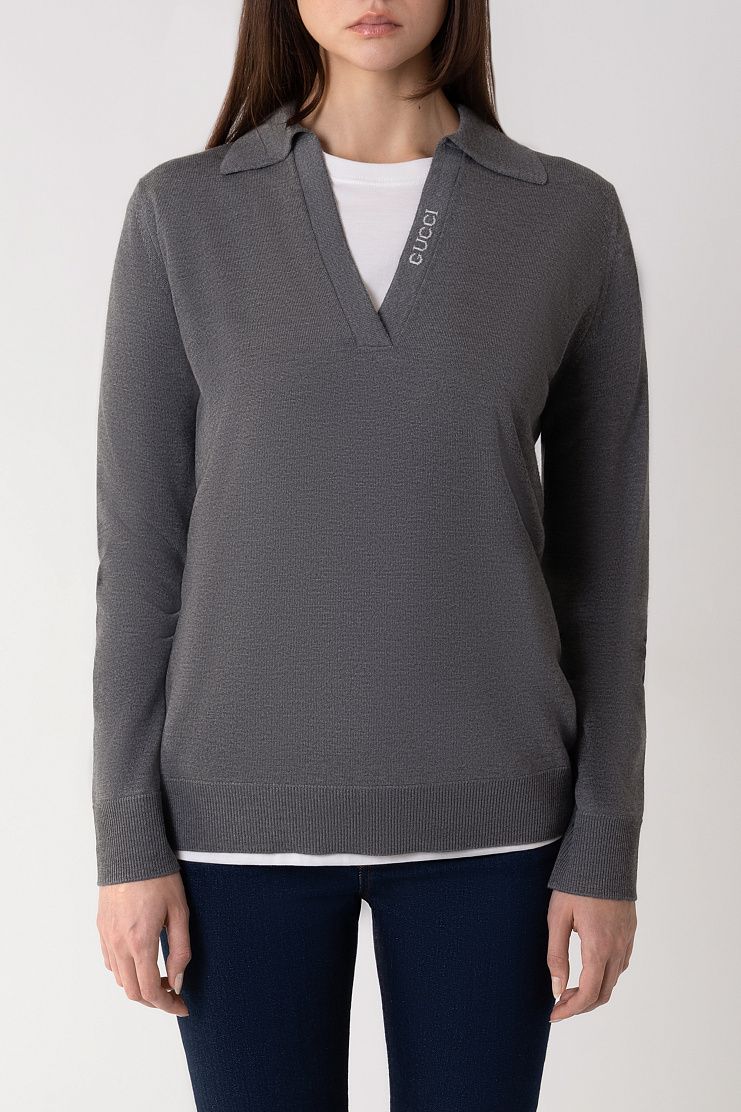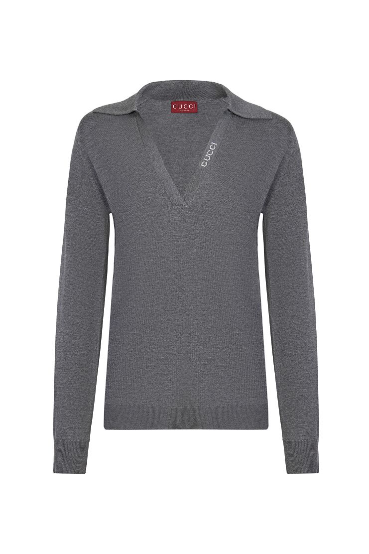 Джемпер с воротником поло выполнили из трикотажа на основе тончайшей шерсти. Модель с ребристой отделкой на манжетах и поясе украшена фирменным логотипом на вороте. Изделие органично дополнит образ в стиле smart casual с брюками и лоферами.