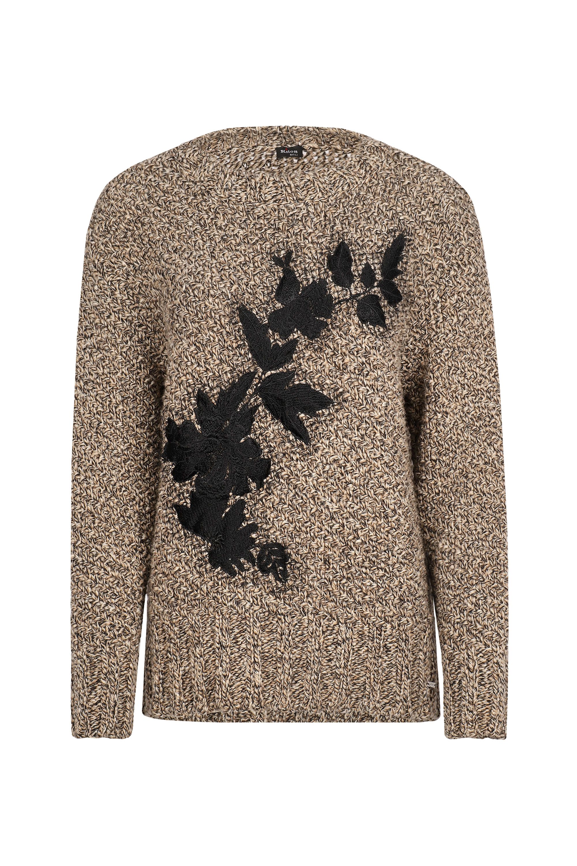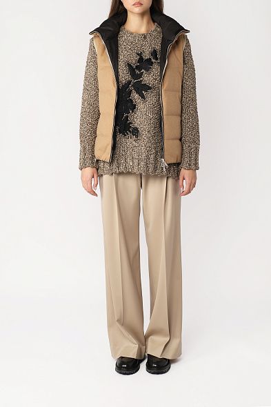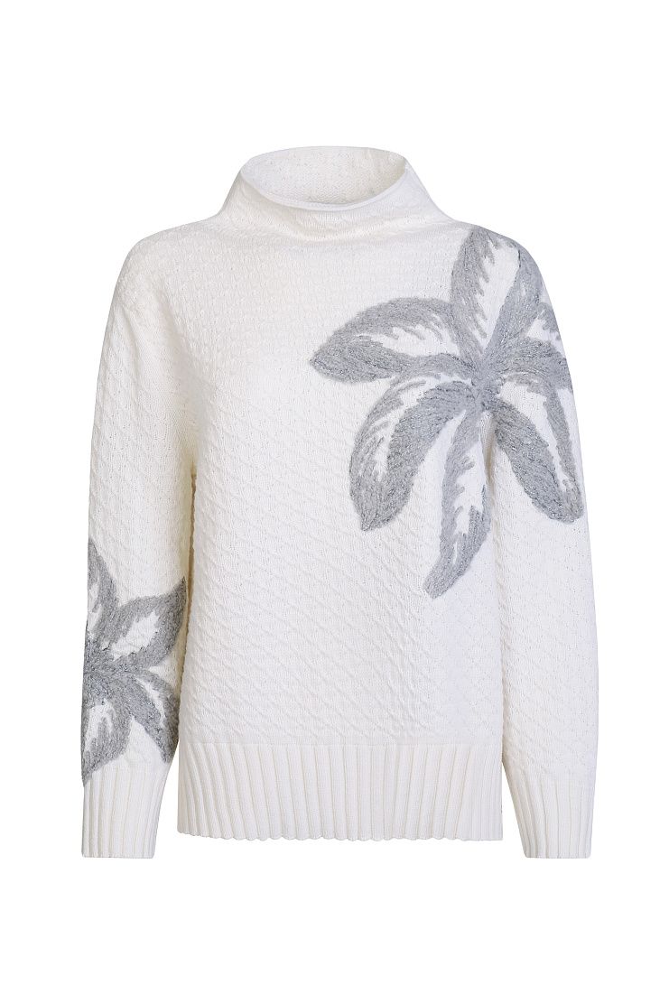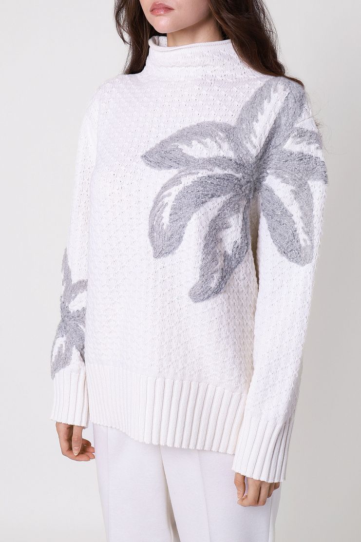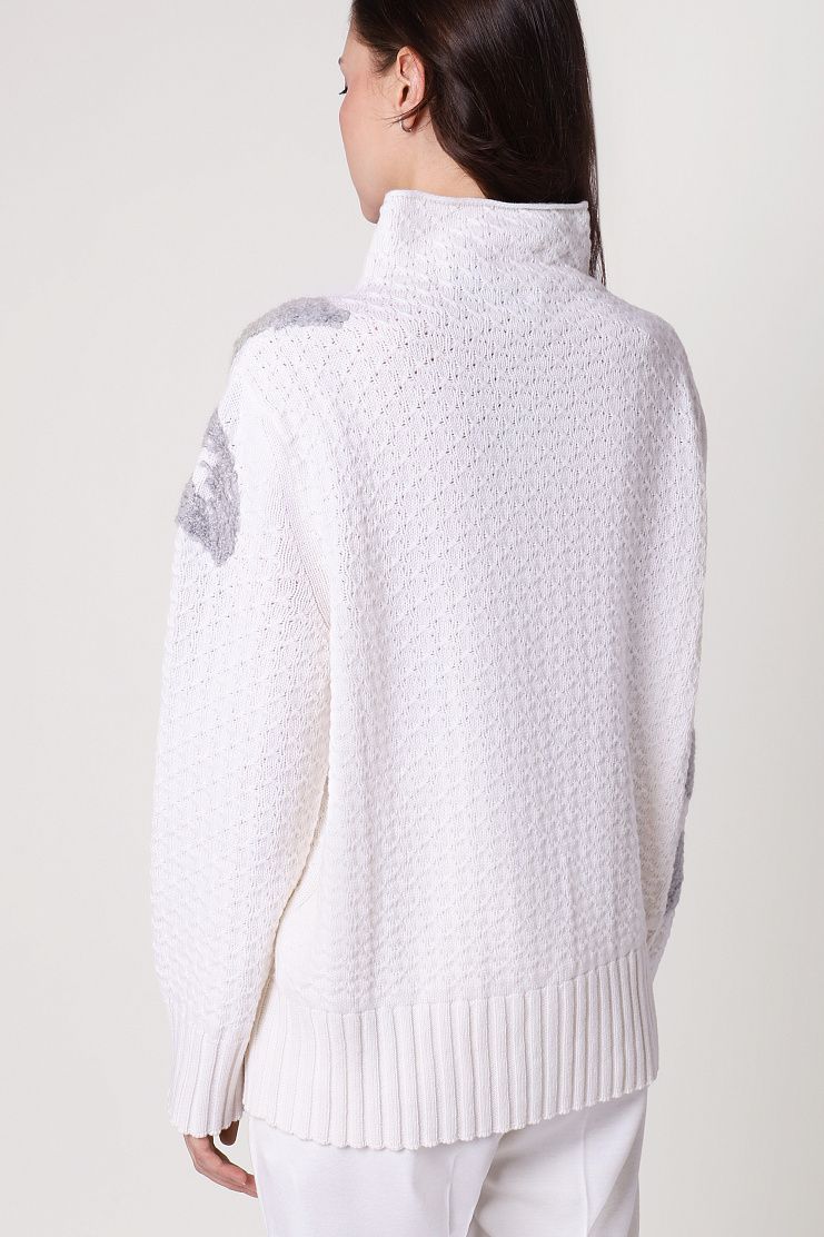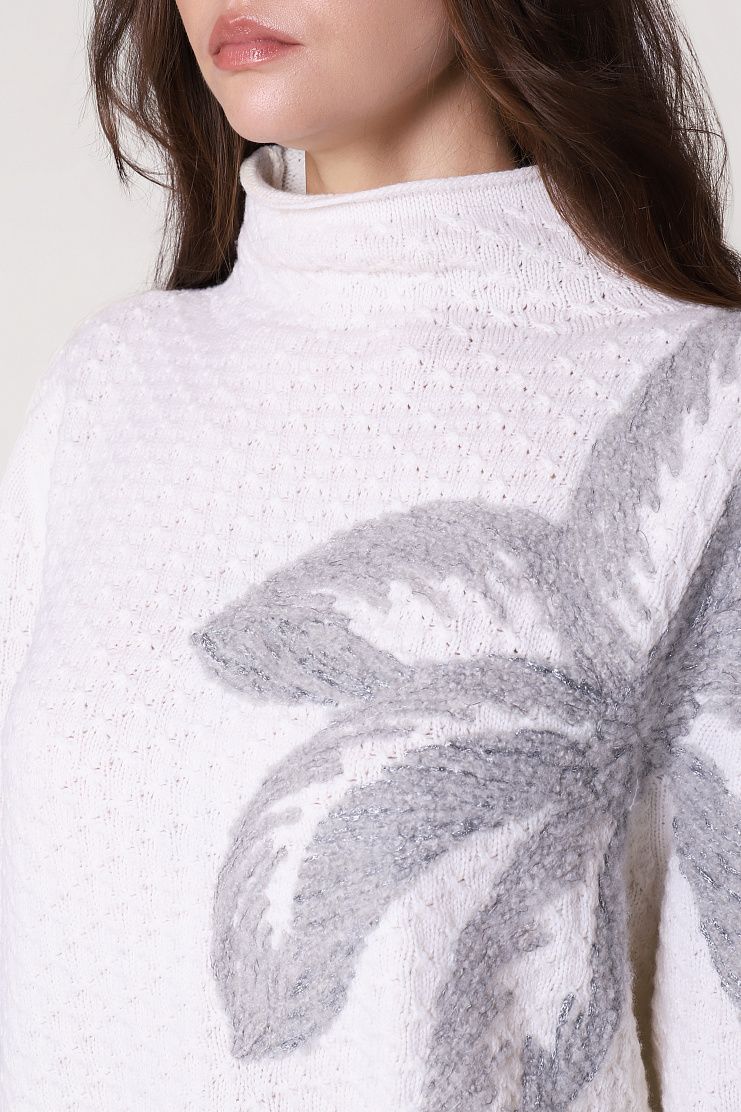 Свободный джемпер с воротником-стойкой выполнили из нежной кашемировой пряжи. Модель со спущенной линией плеча дополнена отделкой в рубчик и украшена крупным вязаным узором.