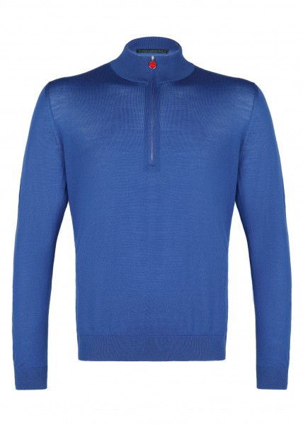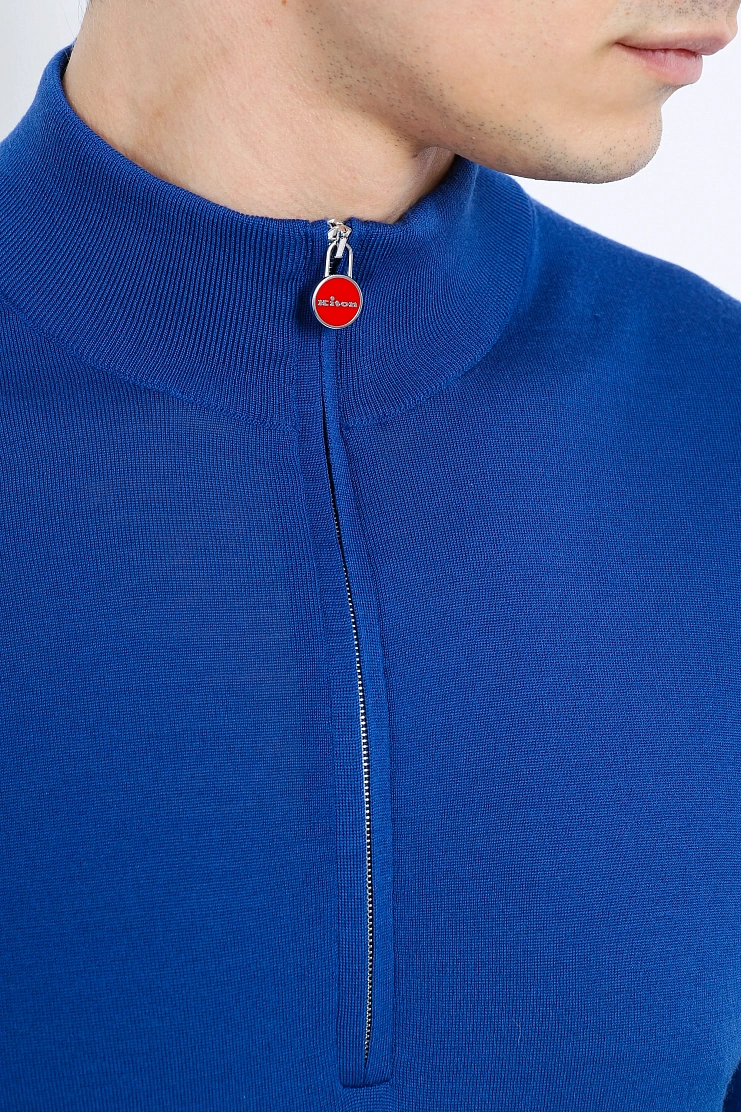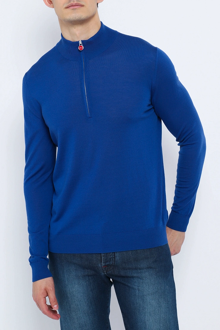 Шерстяной джемпер тонкой вязки с воротником-стойкой. Модель выполнена с короткой застежкой на фирменную молнию.