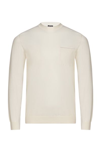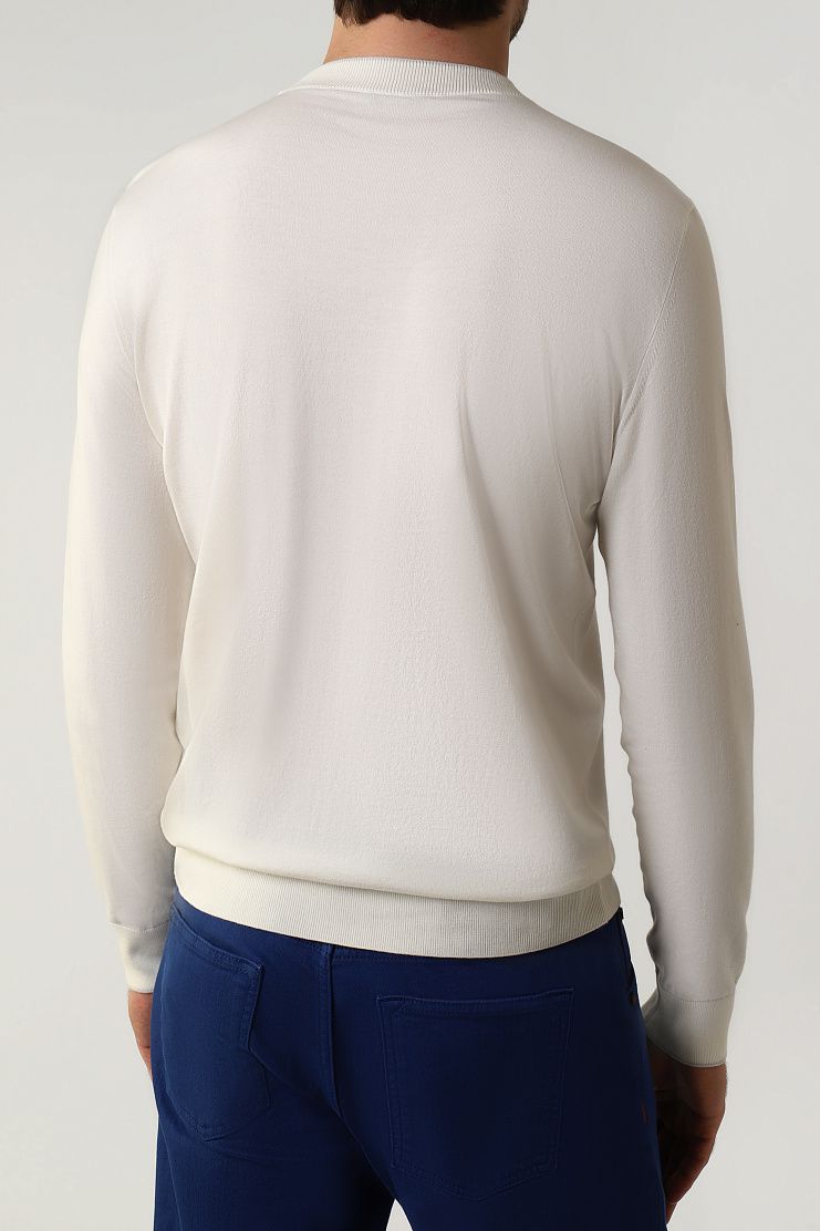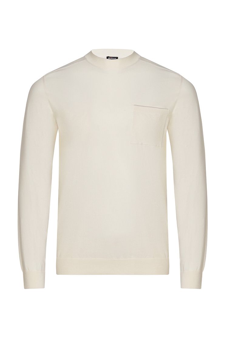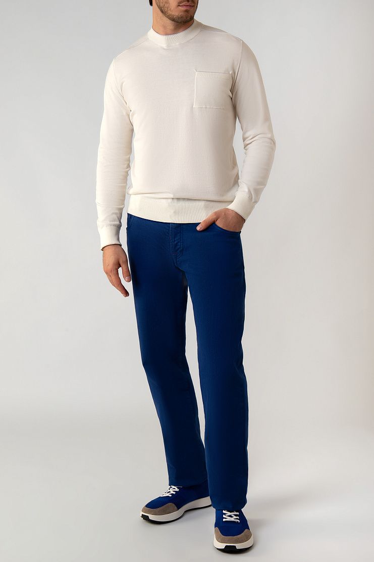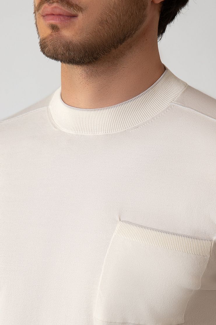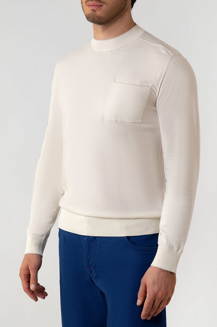 Джемпер с круглым вырезом и длинными рукавами изготовили из плотного хлопкового трикотажа. Ткань изготовлена из отборных волокон, поэтому она получилась особенно гладкой, прочной и приятной на ощупь. Эластичные манжеты и пояс обеспечивают оптимальную посадку по фигуре. Края ворота и нагрудного кармана деликатно подчеркнули узкой каймой.