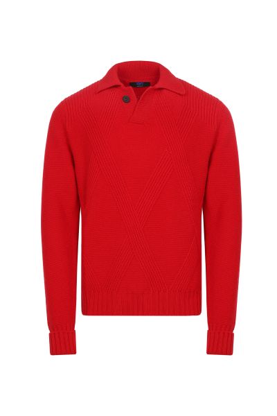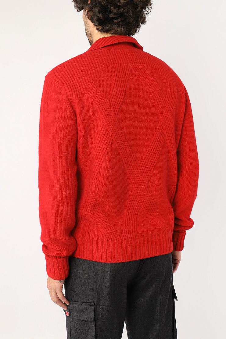 Джемпер с рельефным вязаным узором выполнили из шерстяной пряжи. Модель со спущенной линией плеча дополнили отложным воротником, V-образным вырезом и застежкой на пуговицу. На манжетах и поясе — эластичная отделка в рубчик.