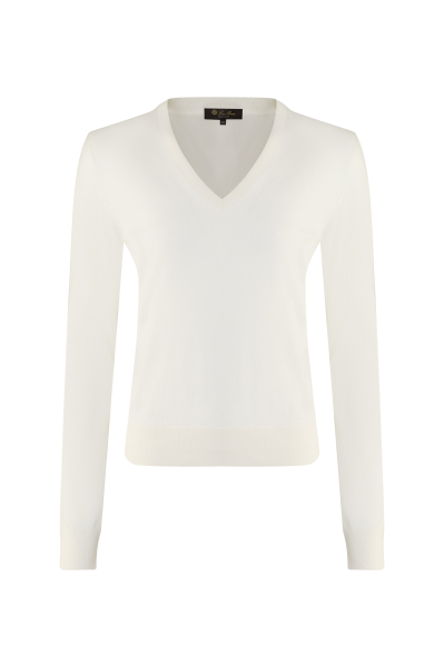 Вязаный джемпер с V-образным вырезом идеально подойдет для многослойных образов с рубашкой и пиджаком. Лаконичная модель из легкой кашемировой пряжи дополнена эластичной отделкой в рубчик на вороте, манжетах и подоле.