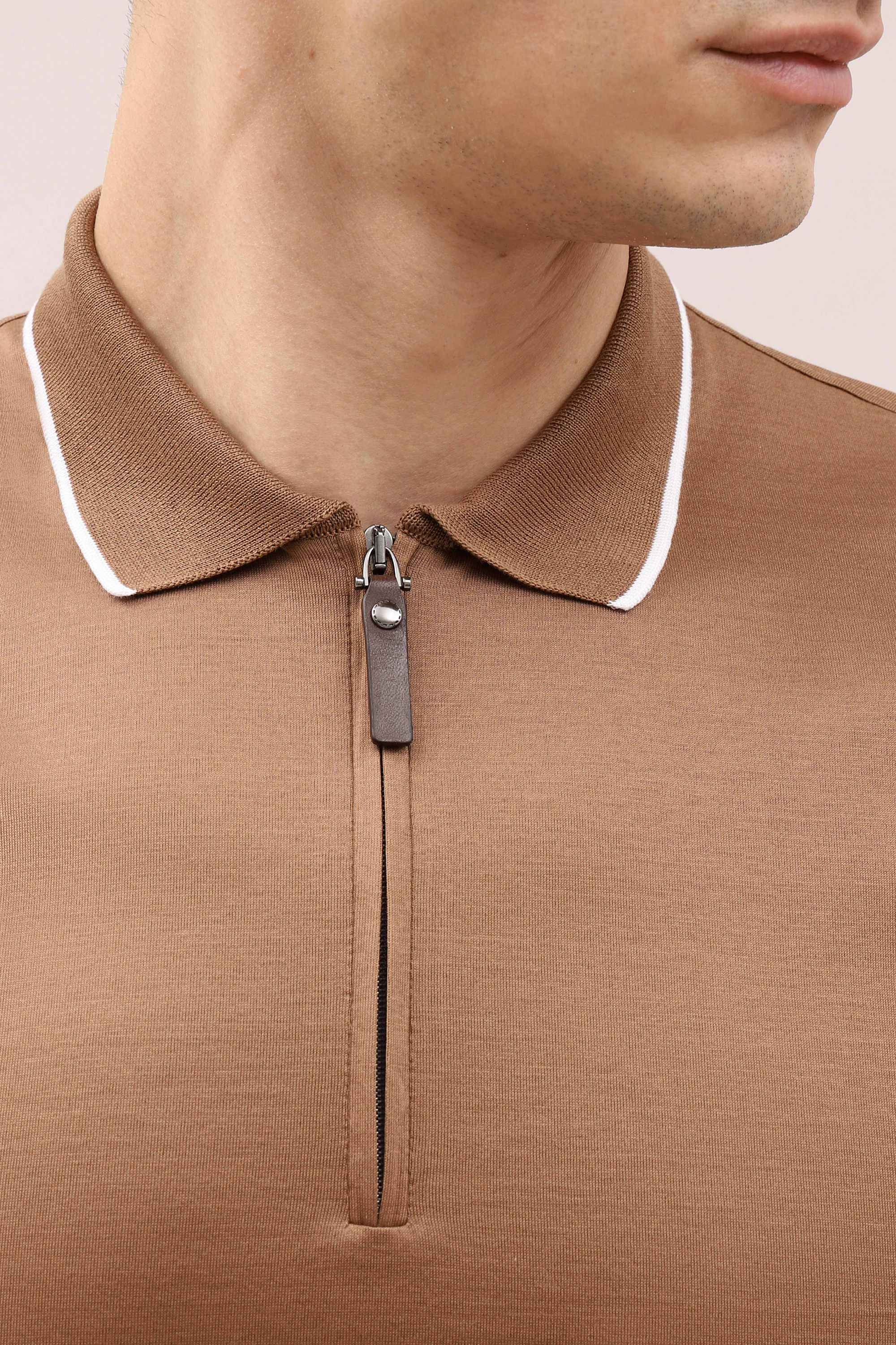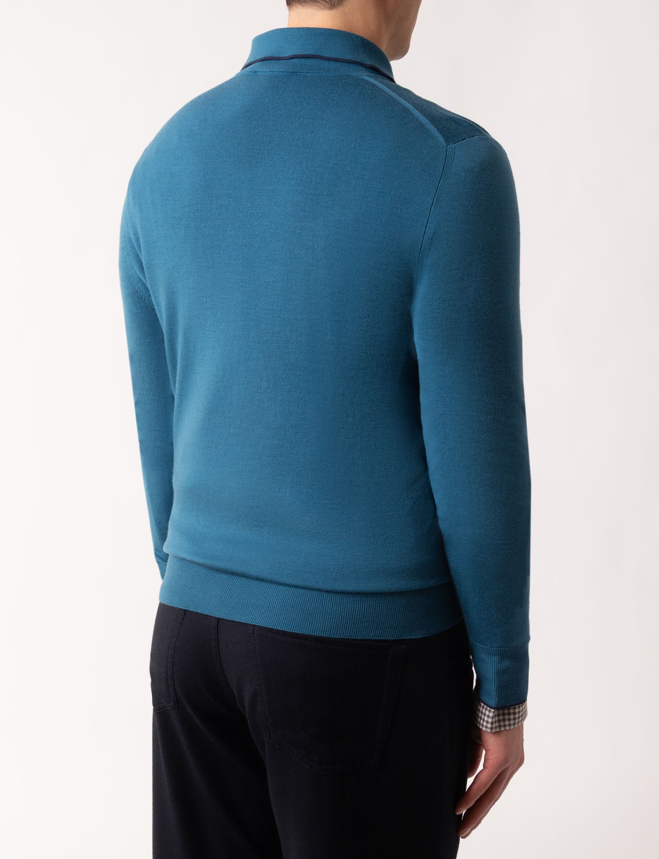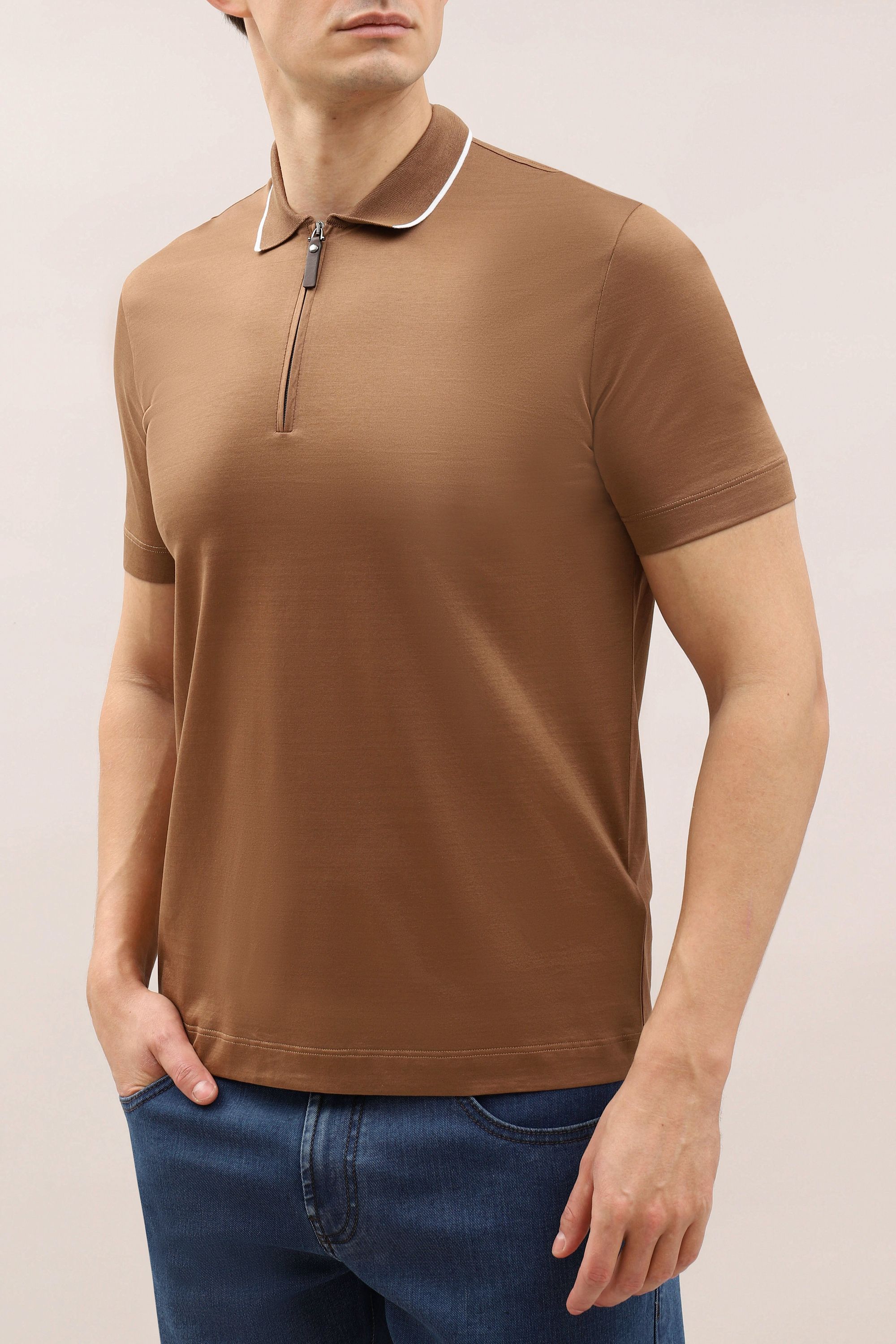 Джемпер-поло с белой каймой на воротнике отлично подойдет для непринужденного элегантного образа. Модель свободного кроя имеет короткие рукава и отложной воротник на молнии.