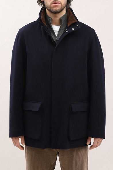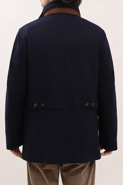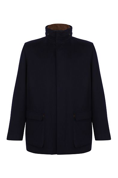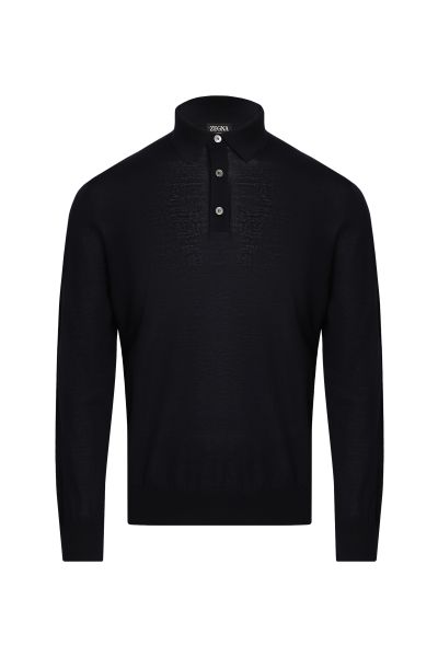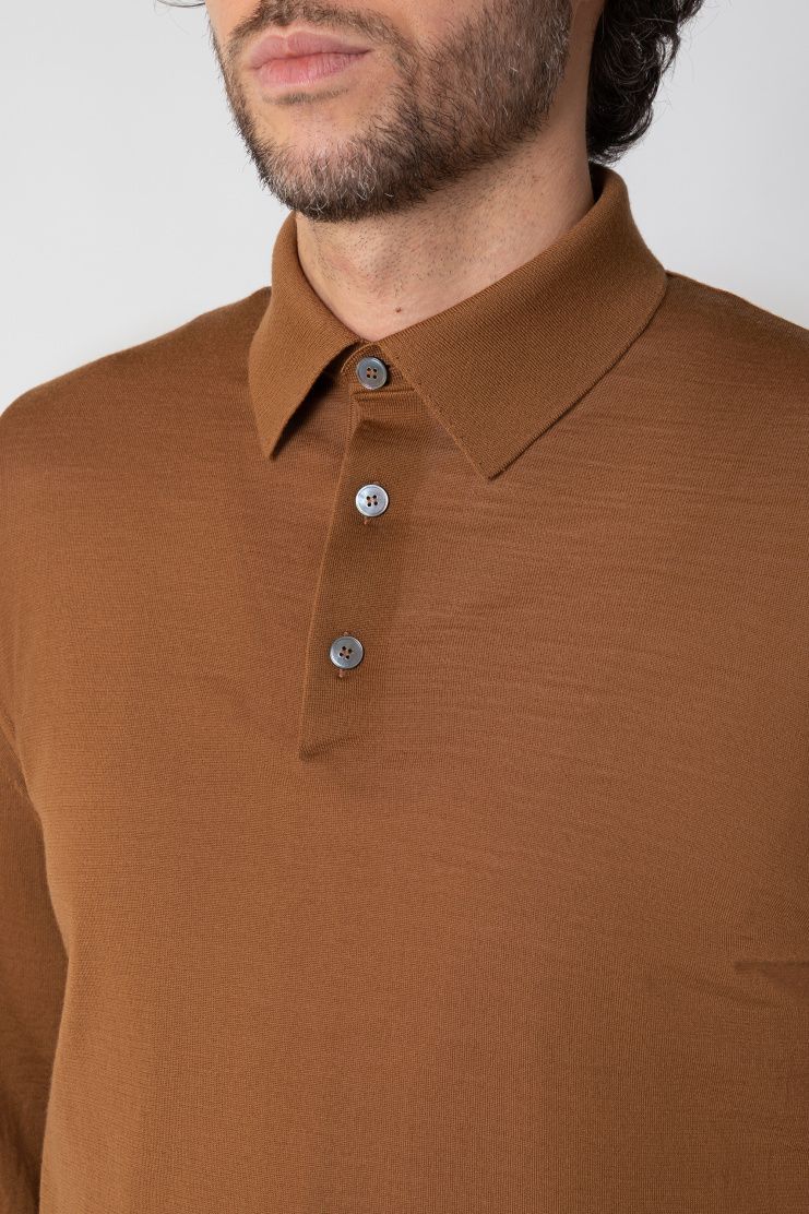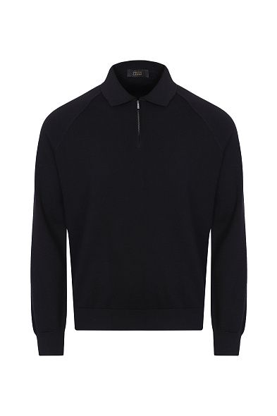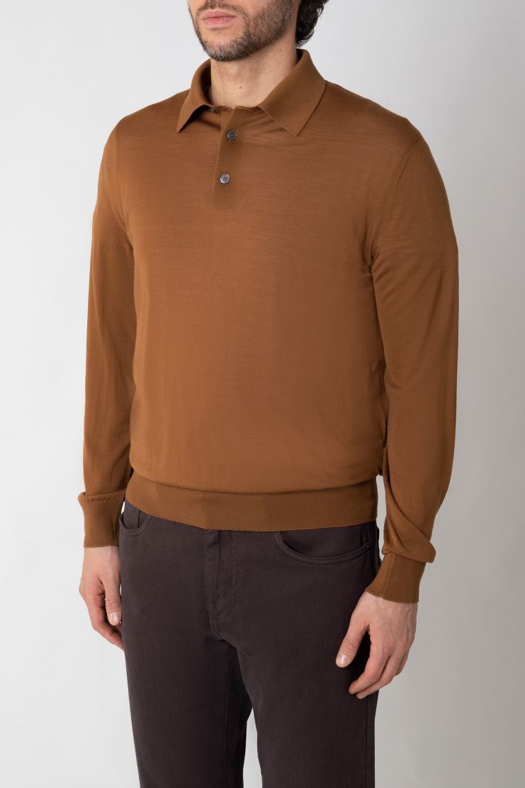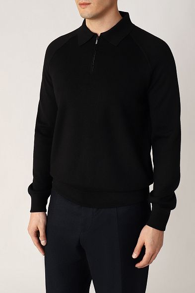 Джемпер с отложным воротником и короткой планкой выполнили из тонкой шерсти. Модель с длинными рукавами дополнена эластичной отделкой на манжетах и поясе.