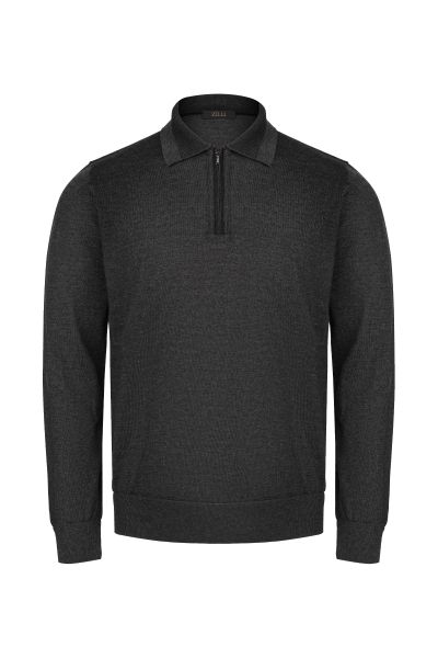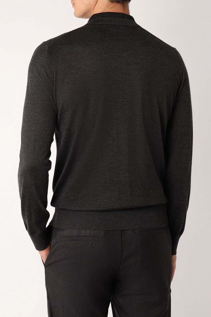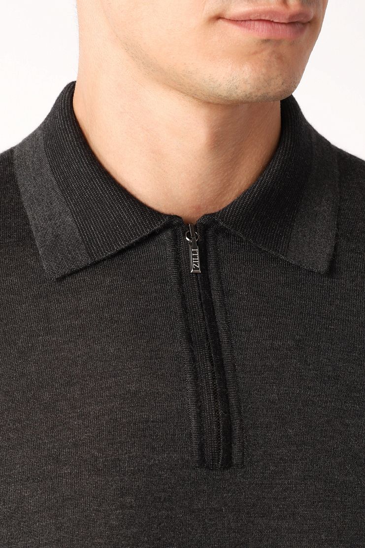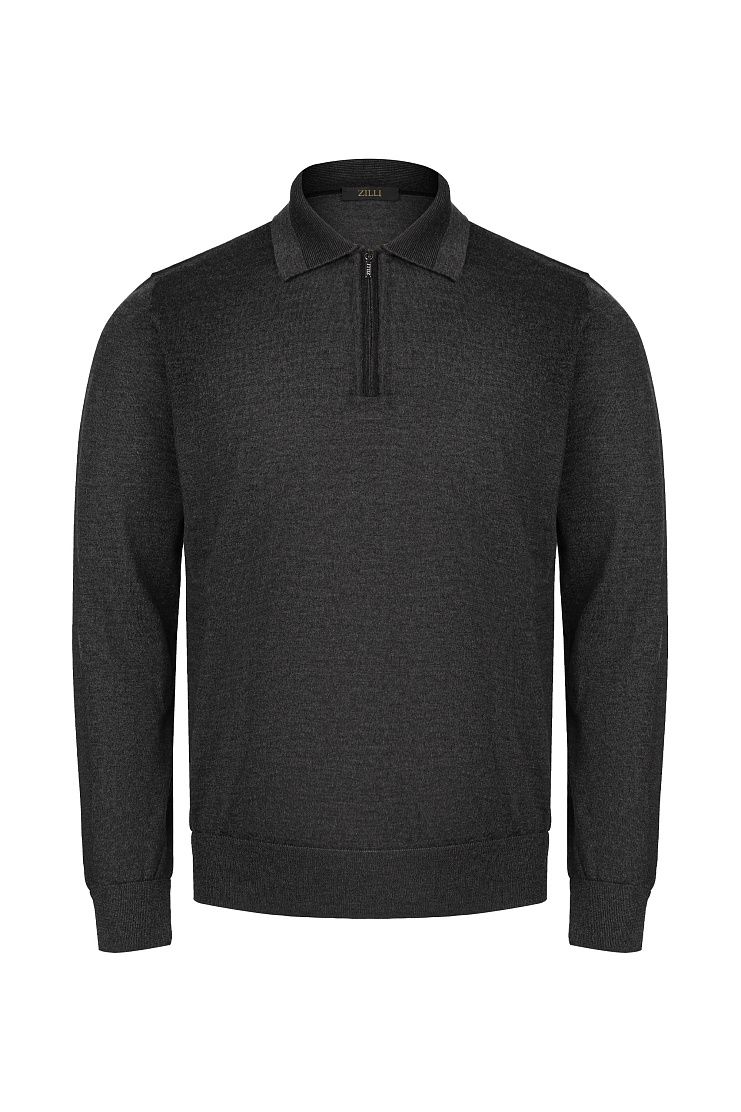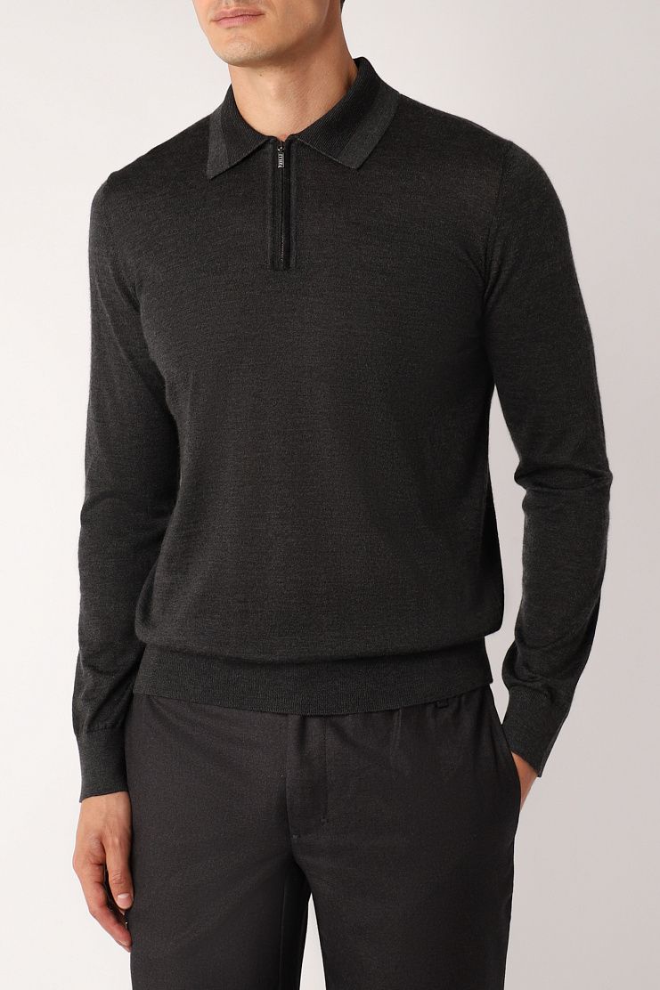 Джемпер с отложным воротником на молнии выполнили из тонкого трикотажа на основе кашемира и шелка. Модель дополнена эластичной отделкой на поясе и манжетах.