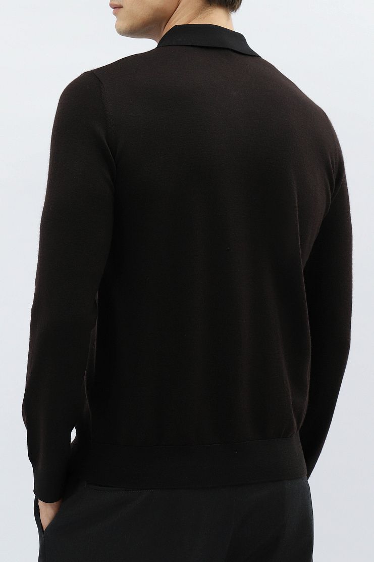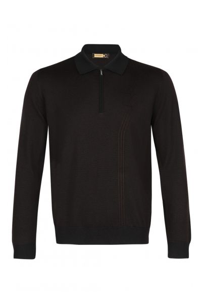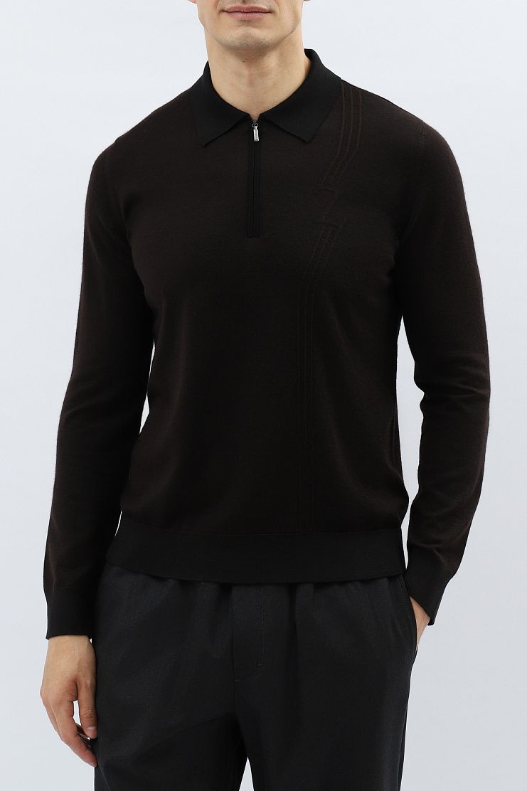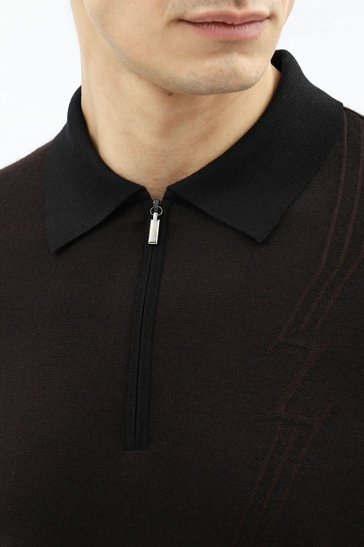 Джемпер-поло с жаккардовым узором в виде тройной вертикальной полоски и буквы Z. Модель свободного кроя с отложным воротником на молнии.