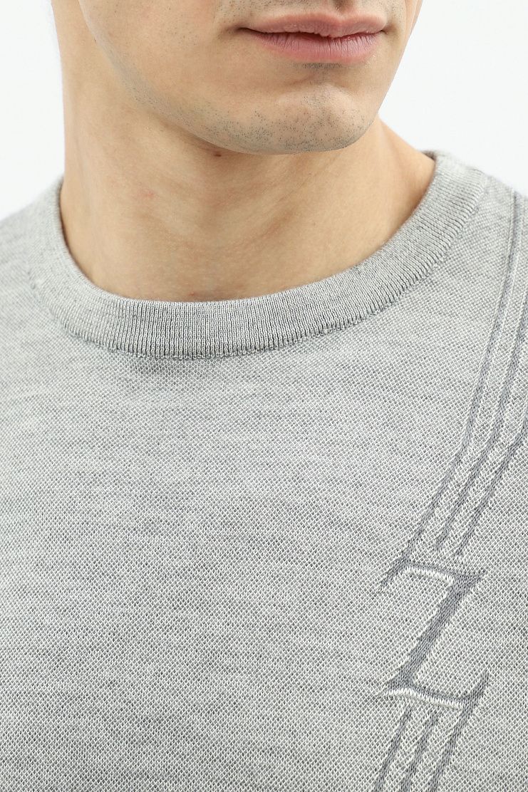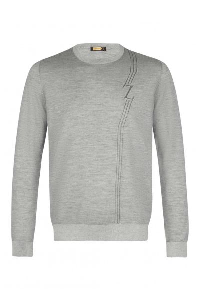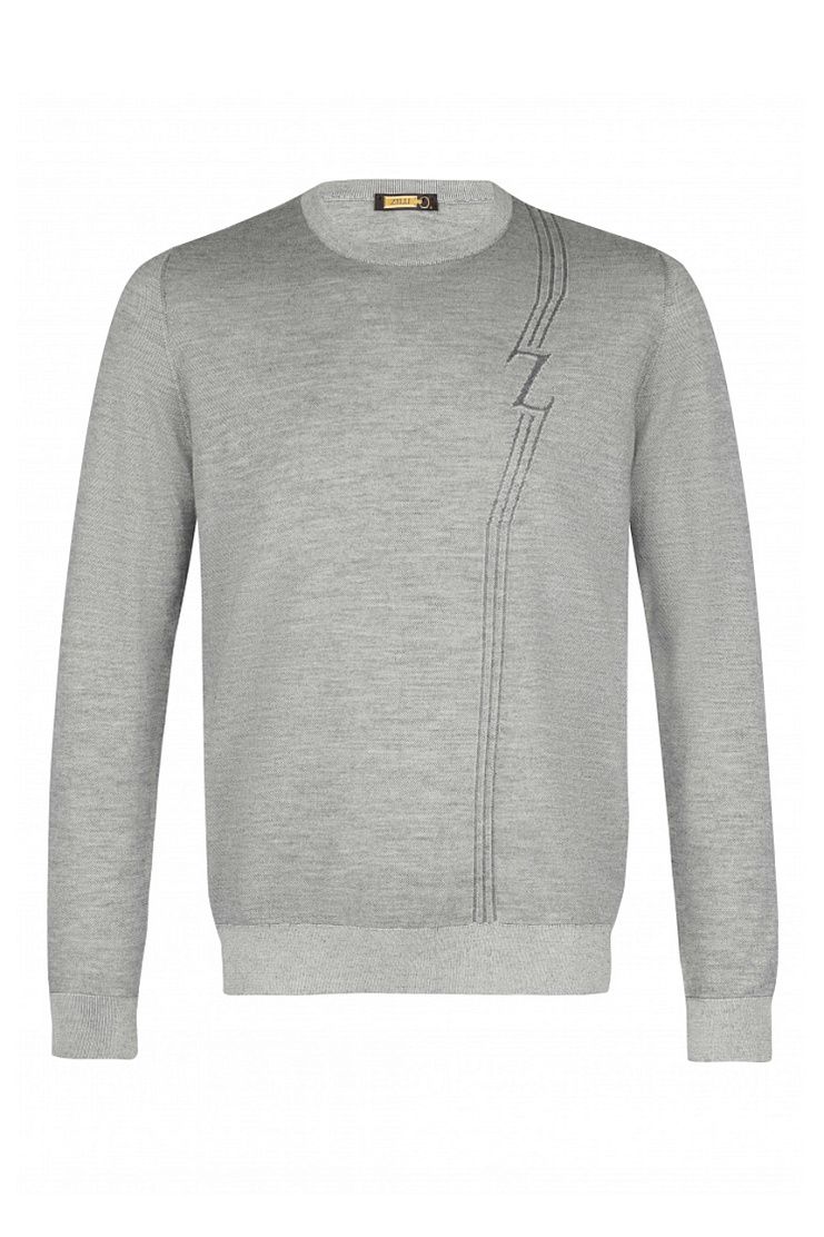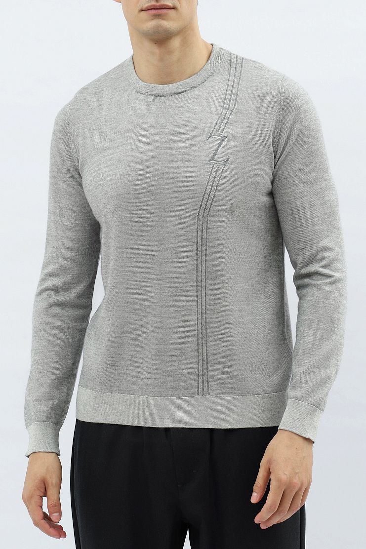 Джемпер с жаккардовым узором в виде вертикальной тройной полоски и буквы Z. Модель свободного кроя имеет круглый вырез, манжеты и нижний край из трикотажной резинки.