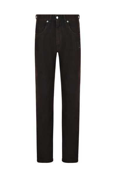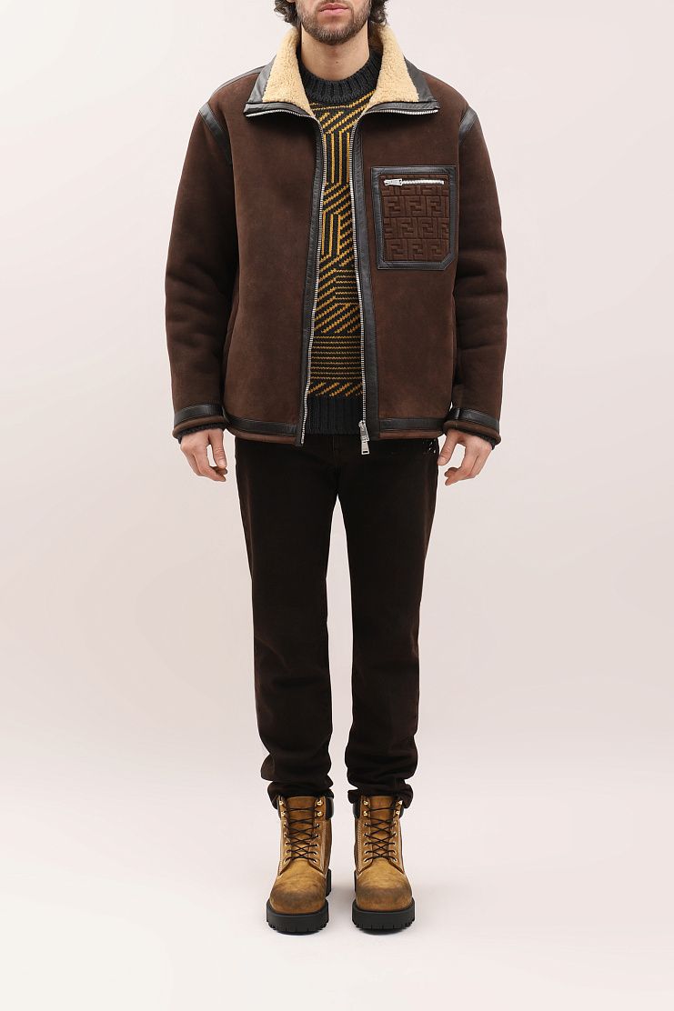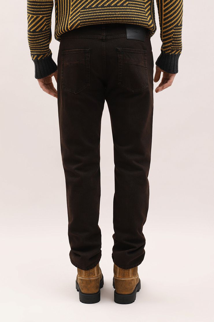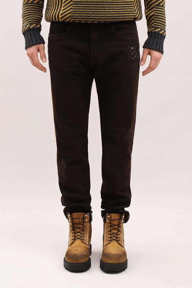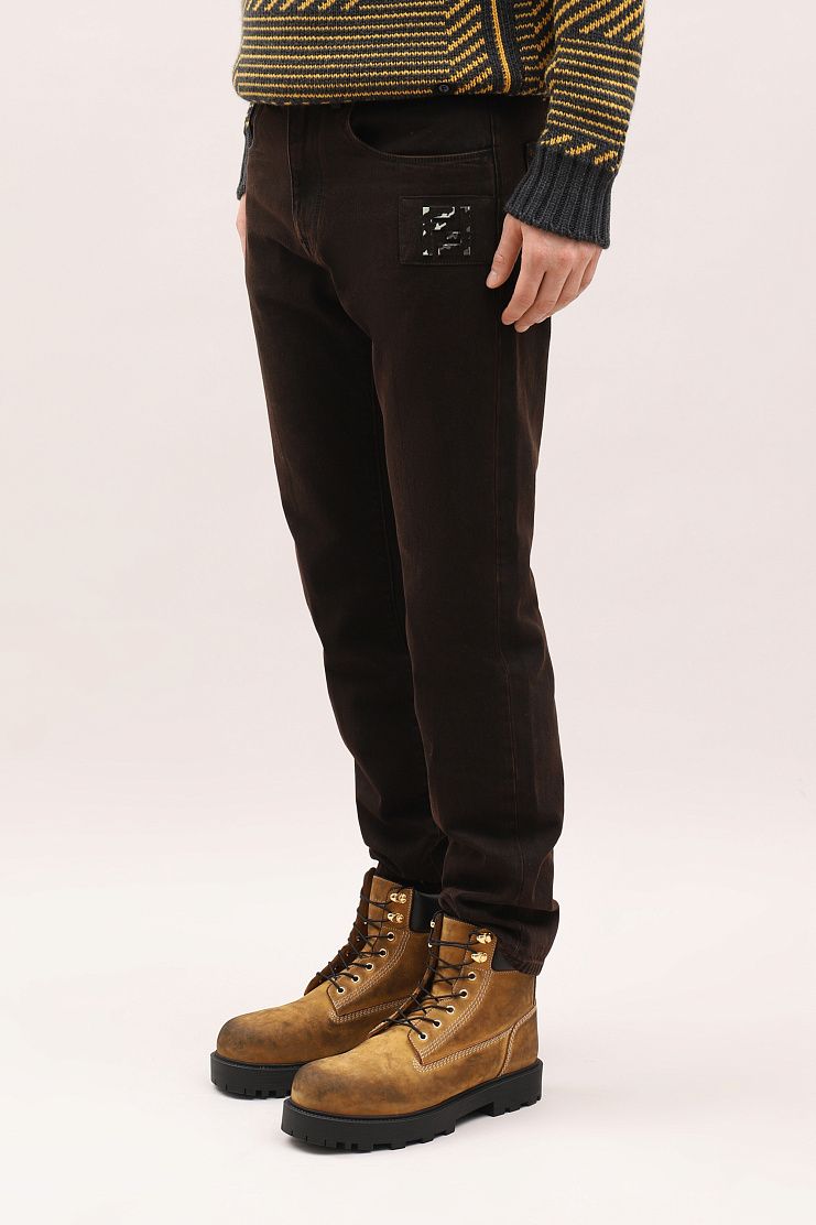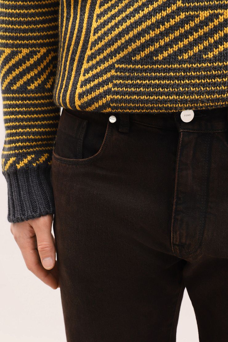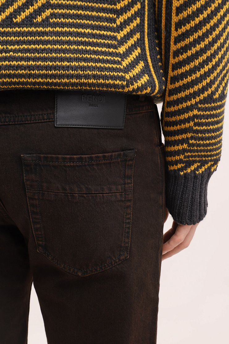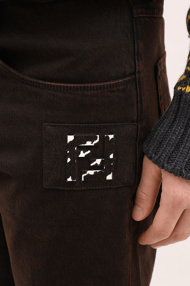 Джинсы кроя Regular fit выполнили из плотного денима с эффектом потертости. Модель с пятью карманами дополнена поясом с шлевками для ремня, а украшена кожаным патчем на поясе сзади и нашивкой с логотипом FF. Застегивается на молнию и пуговицы.