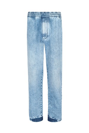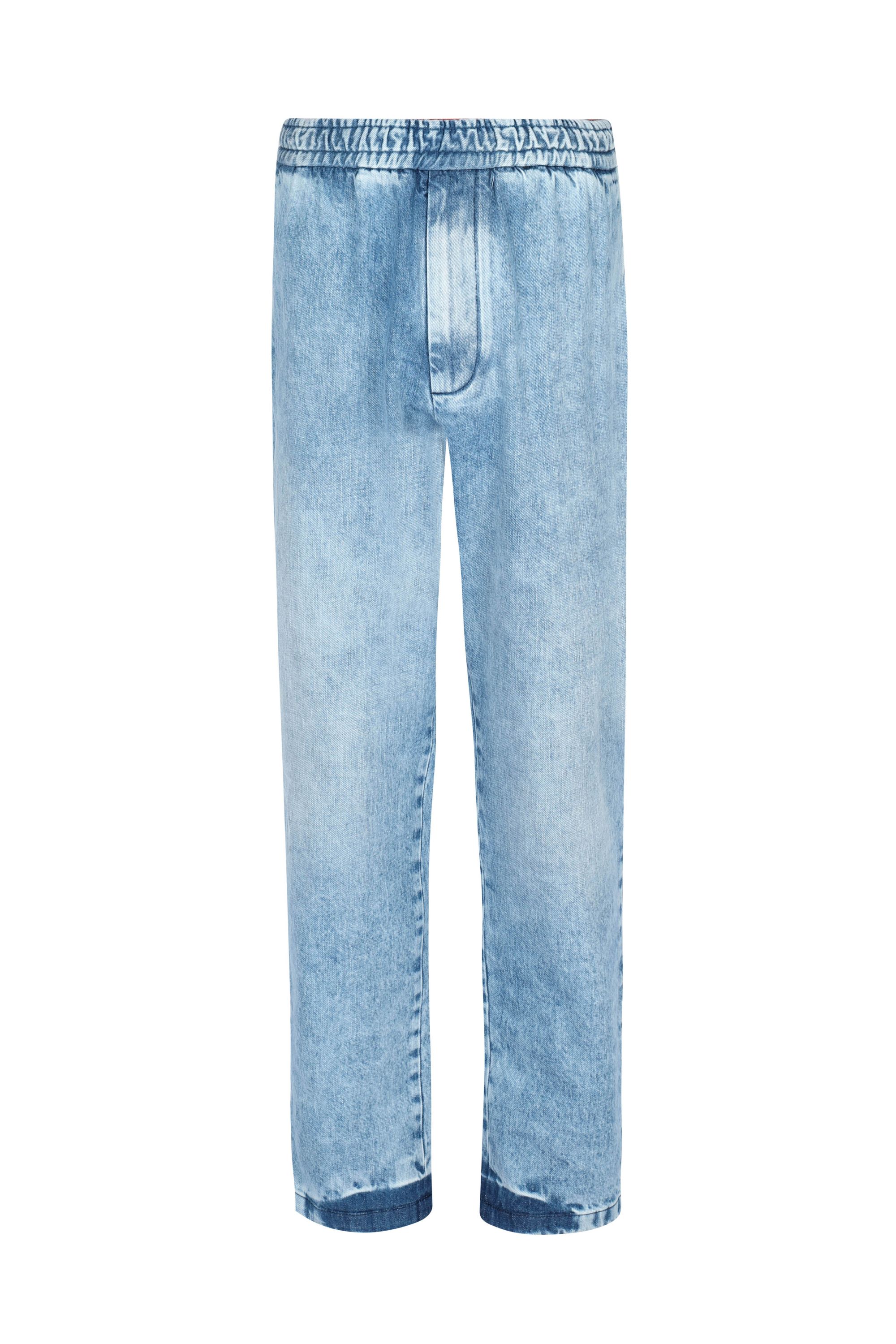 Джинсы зауженного кроя сшили из выбеленного хлопкового денима с декоративными потертостями и прорехами. Модель с четырьмя карманами дополнили вышитым логотипом на поясе.