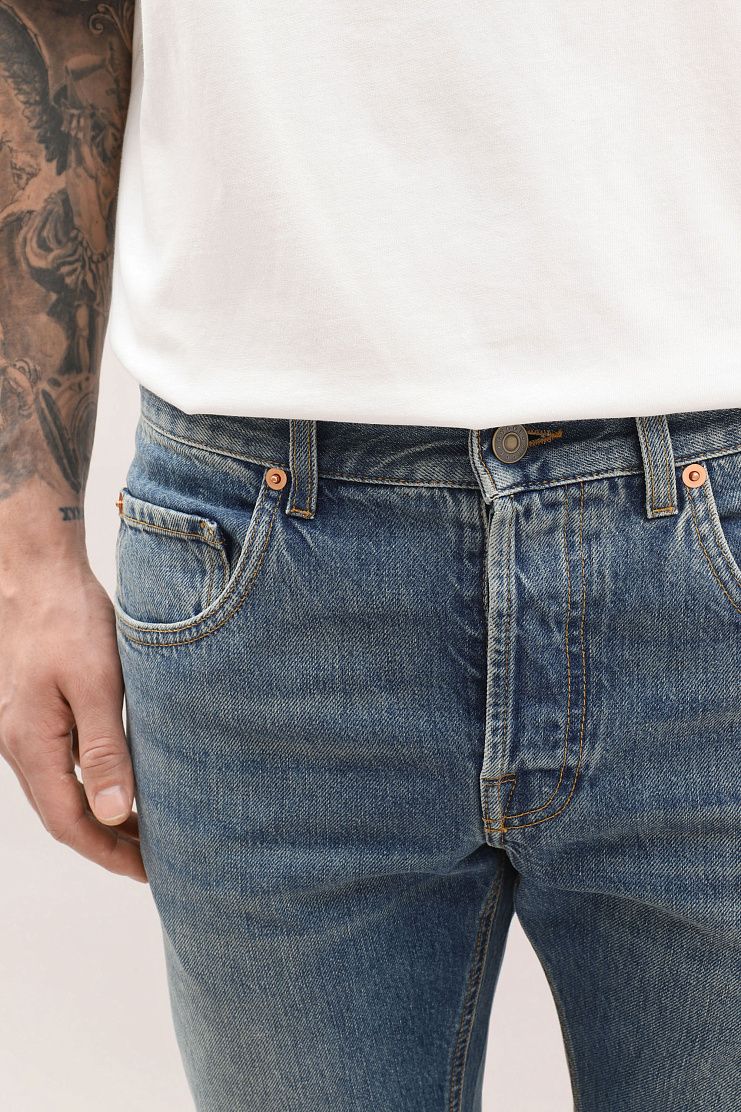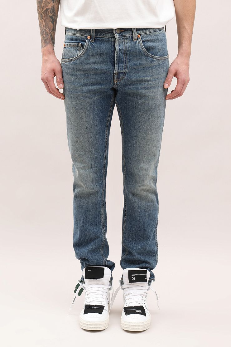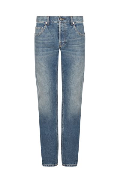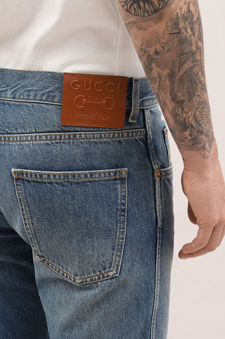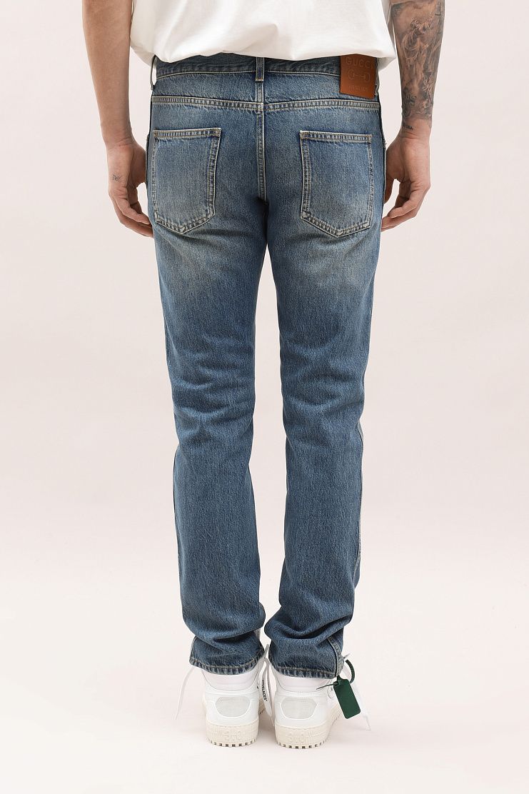 Джинсы с потертостями — бессмертная классика уличного стиля от Gucci. Модель, слегка зауженная к низу, имеет кожаную нашивку на поясе и застежку на молнию и металлическую пуговицу.