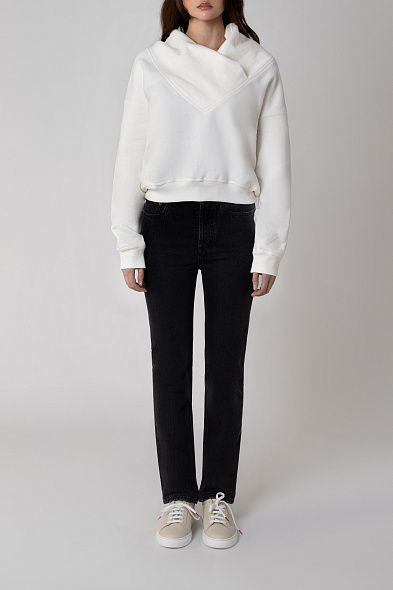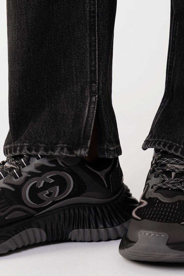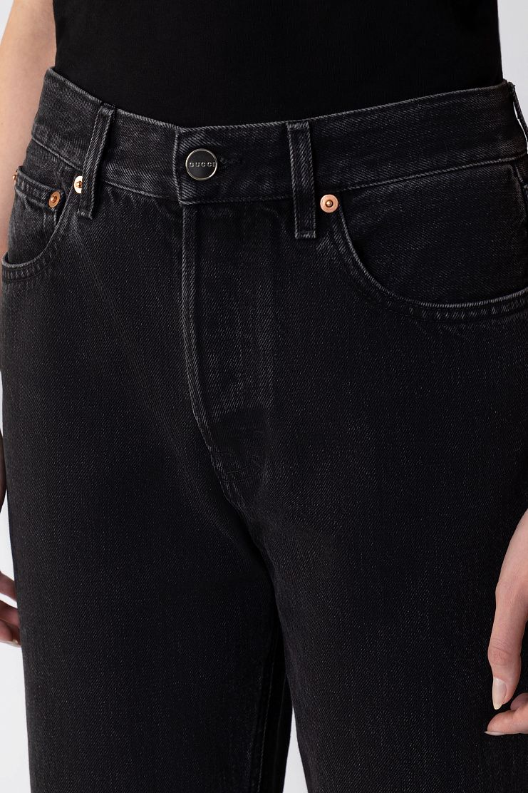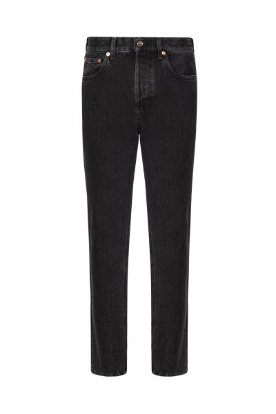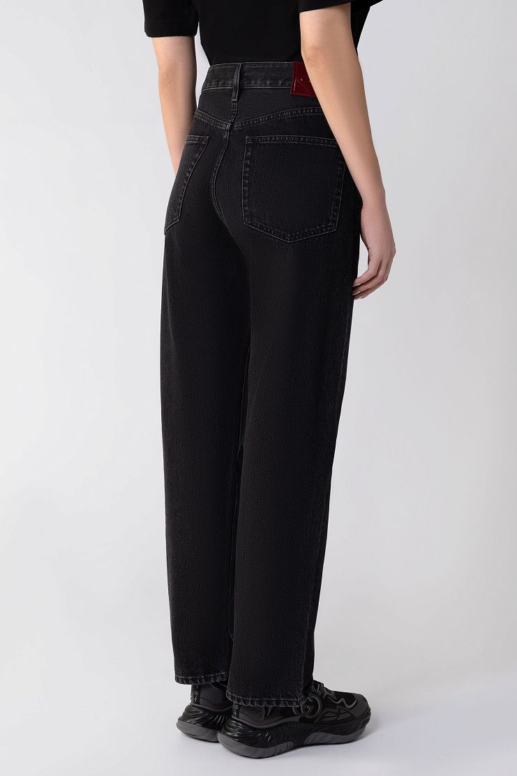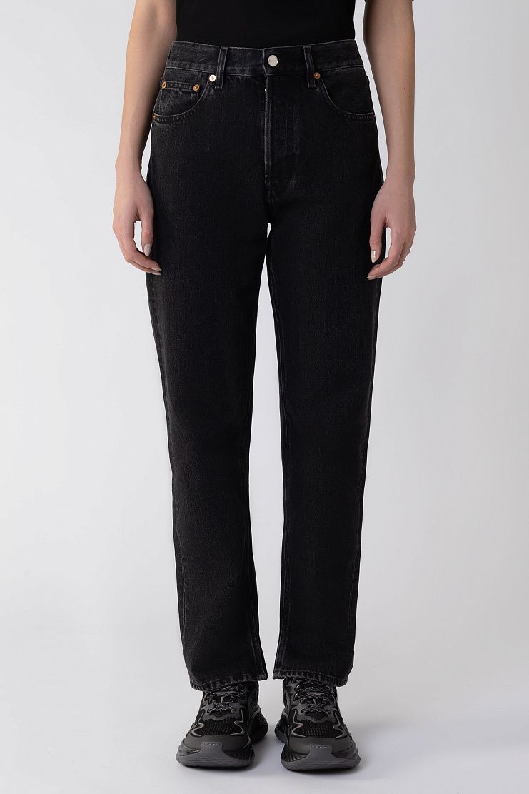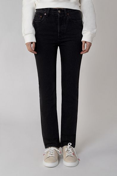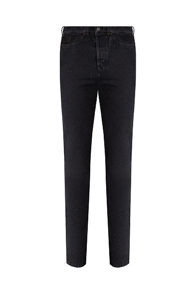 Слегка зауженные джинсы с высокой посадкой сшили из плотного денима. Модель декорировали только брендированной нашивкой на поясе и разрезами на брючинах, поэтому она легко впишется в комплект любой сложности.