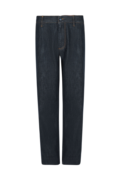 Джинсы-бананы черно-синего цвета остаются трендовыми и в новом сезоне. Модель свободного кроя до колена и слегка зауженная к низу с застежкой на молнию и пуговицу с логотипом.