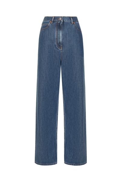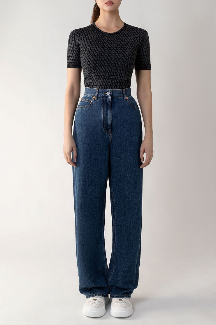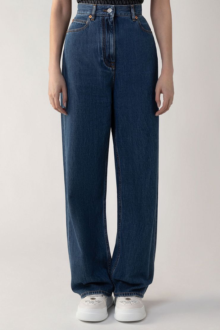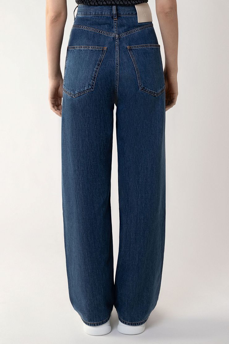 Широкие джинсы с высокой посадкой сшили из мягкого и износостойкого денима на основе хлопка и лиоцелла. Модель с пятью карманами дополнили брендированной нашивкой на поясе.