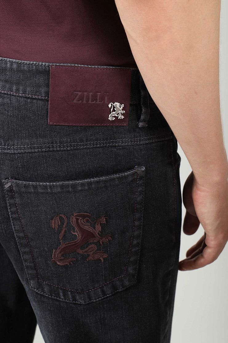 Джинсы с вышивкой в виде льва на заднем кармане и замшевой нашивкой с логотипом Zilli на поясе. Модель прямого кроя имеет застежку на молнию и фирменную металлическую пуговицу.