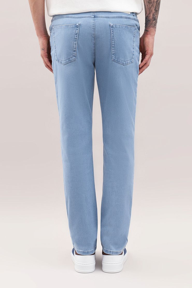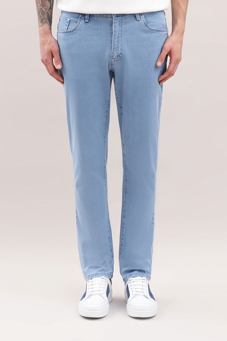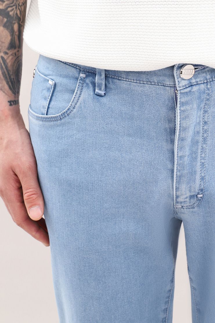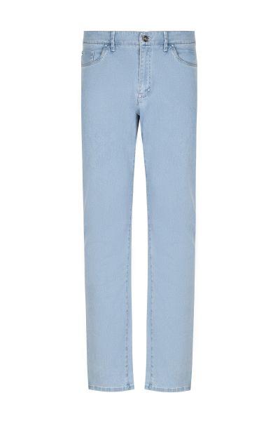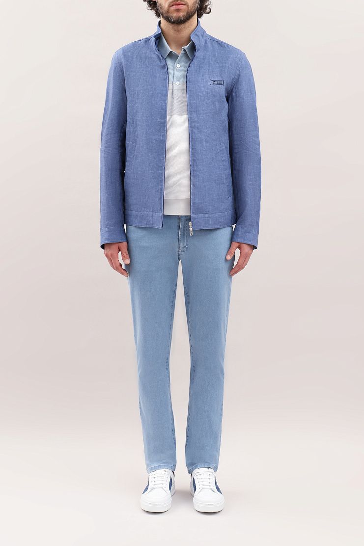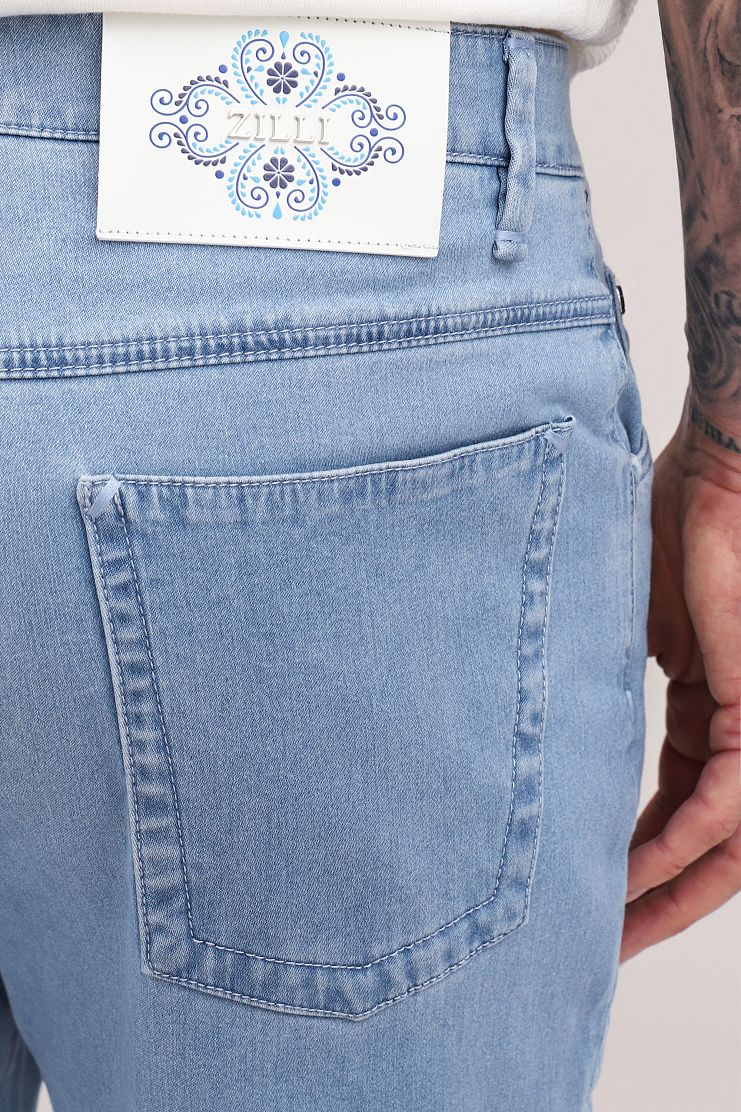 Джинсы с нашивкой на поясе, украшенной синим узором и металлическим логотипом Zilli, прекрасно подойдут для летнего образа на каждый день. Модель прямого кроя имеет боковые и задние карманы и застежку на молнию и фирменную металлическую пуговицу.