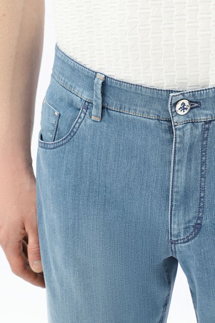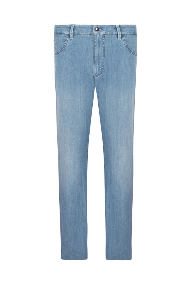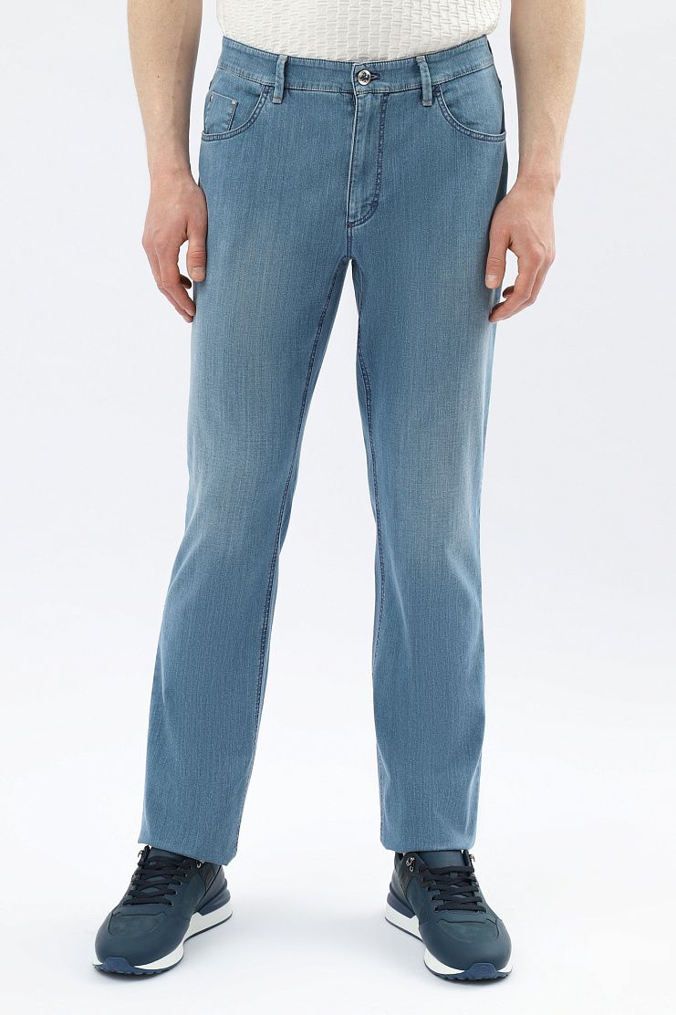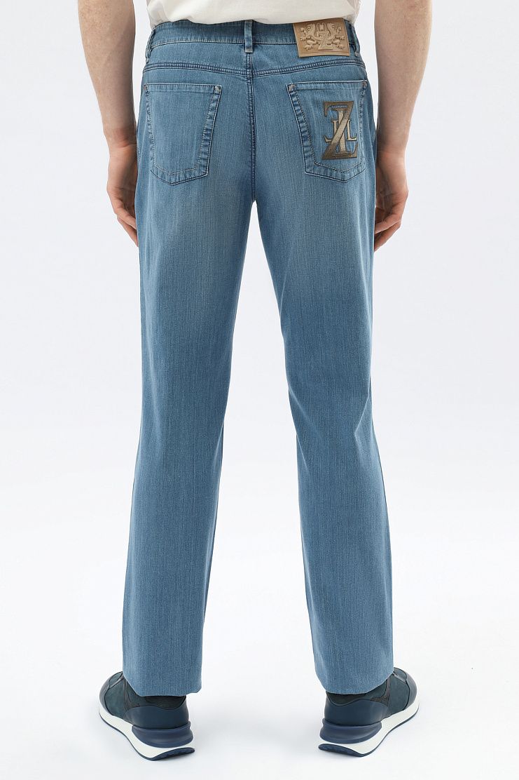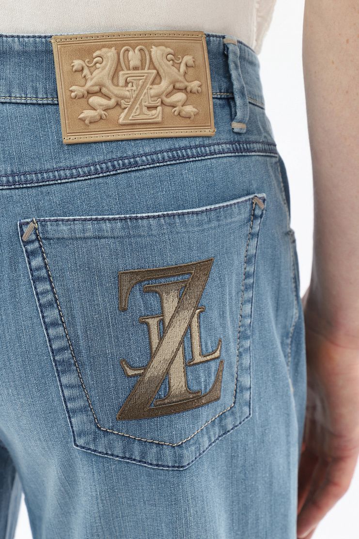 Традиционные джинсы со знаковыми деталями: нашивкой с эмблемой бренда и вышитой монограммой на заднем кармане. Модель прямого кроя имеет застежку на молнию и фирменную металлическую пуговицу.
