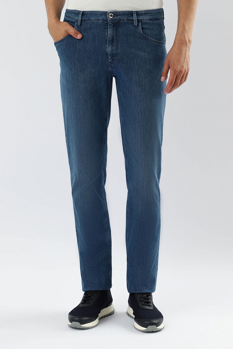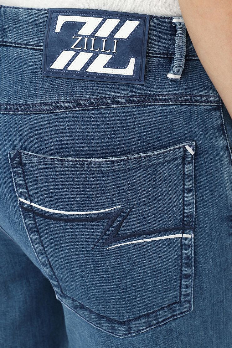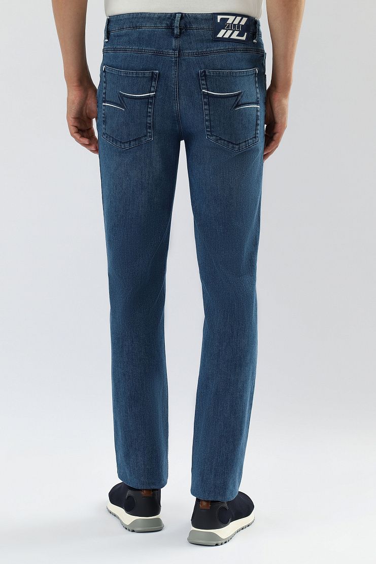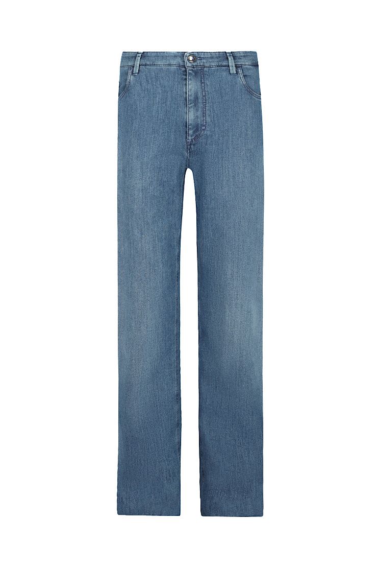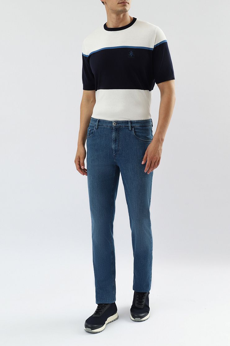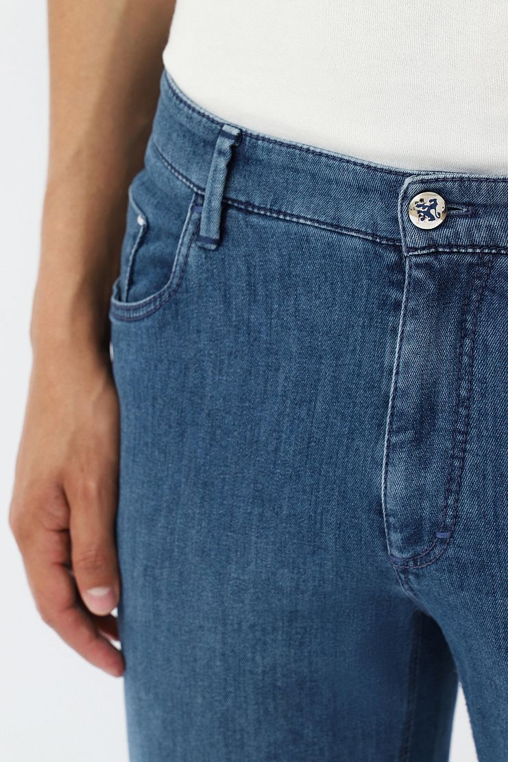 Джинсы с нашивкой на поясе и вышивкой на заднем кармане. Модель прямого кроя с застежкой на молнию и металлическую пуговицу с изображением льва.