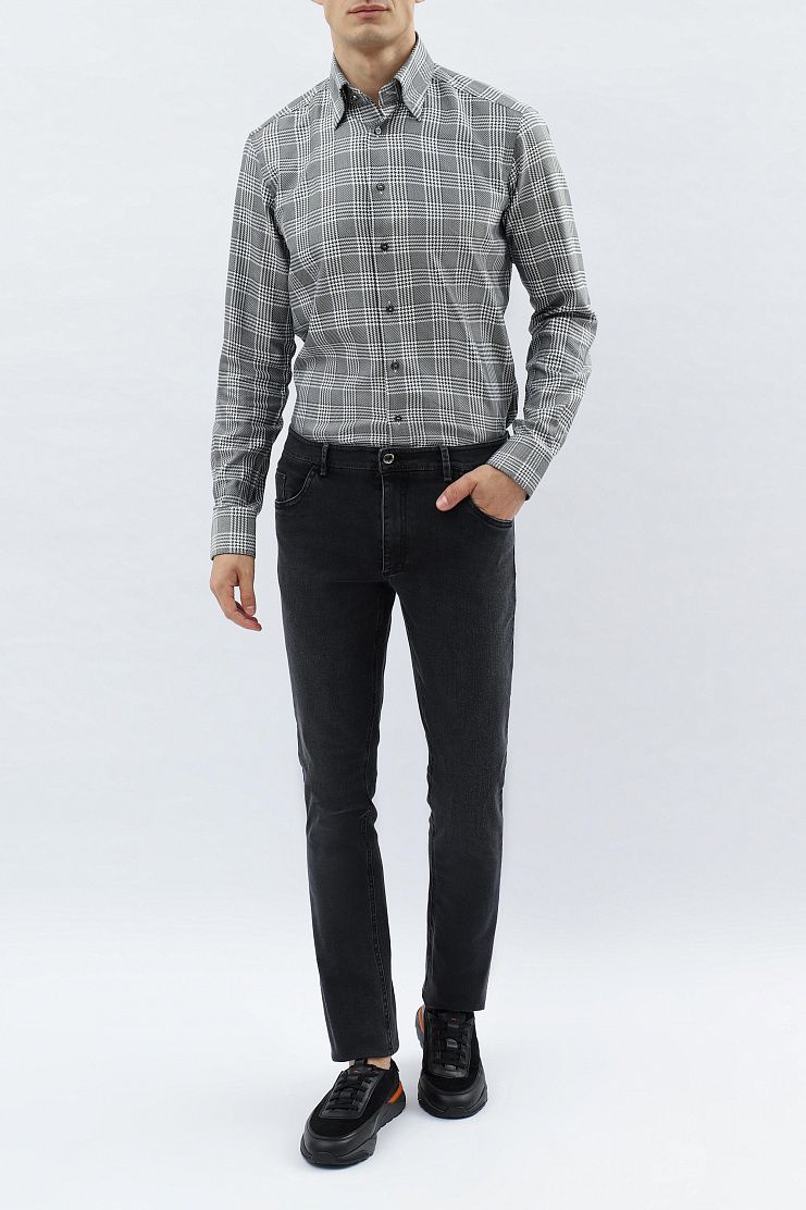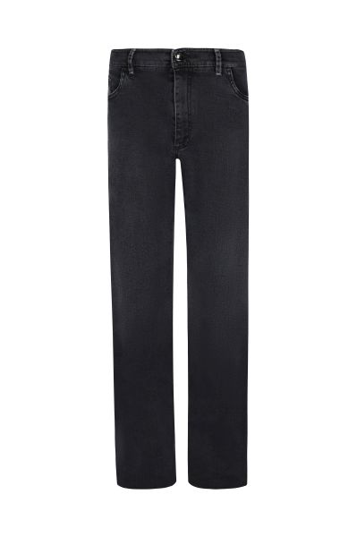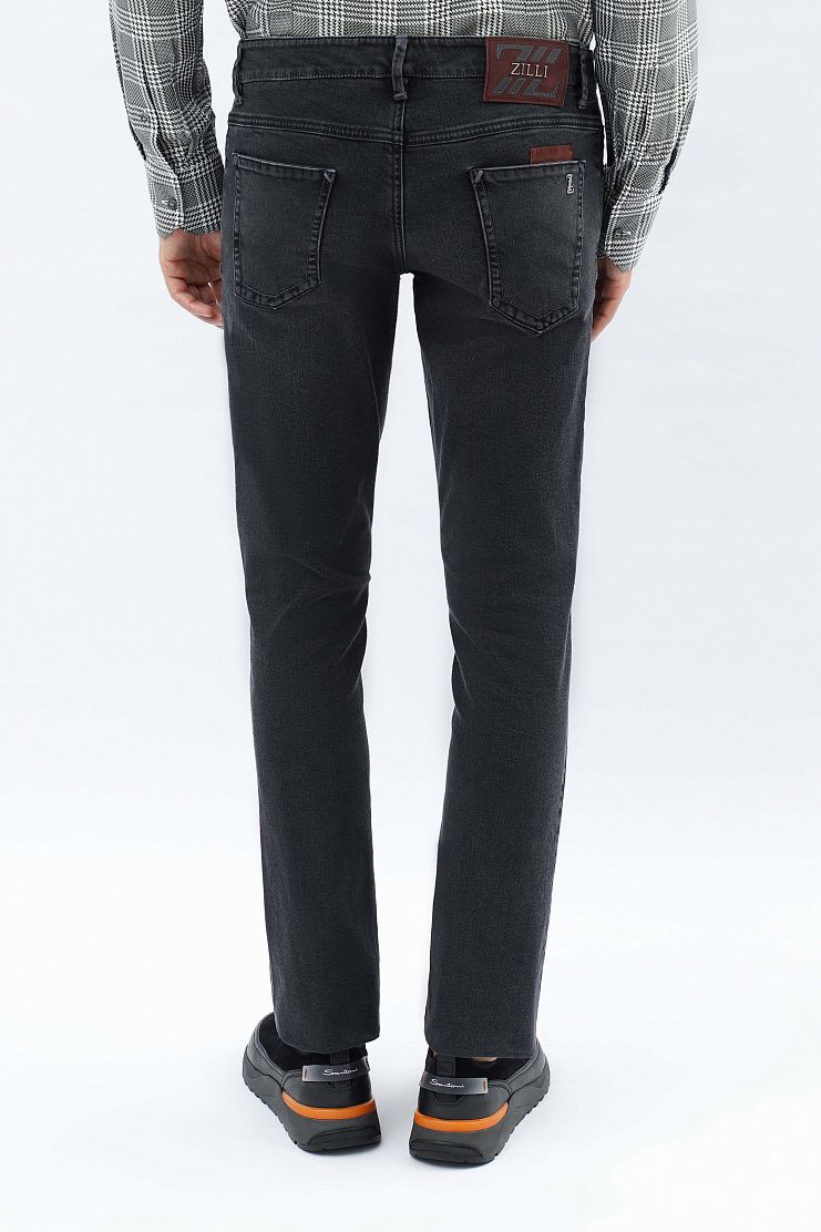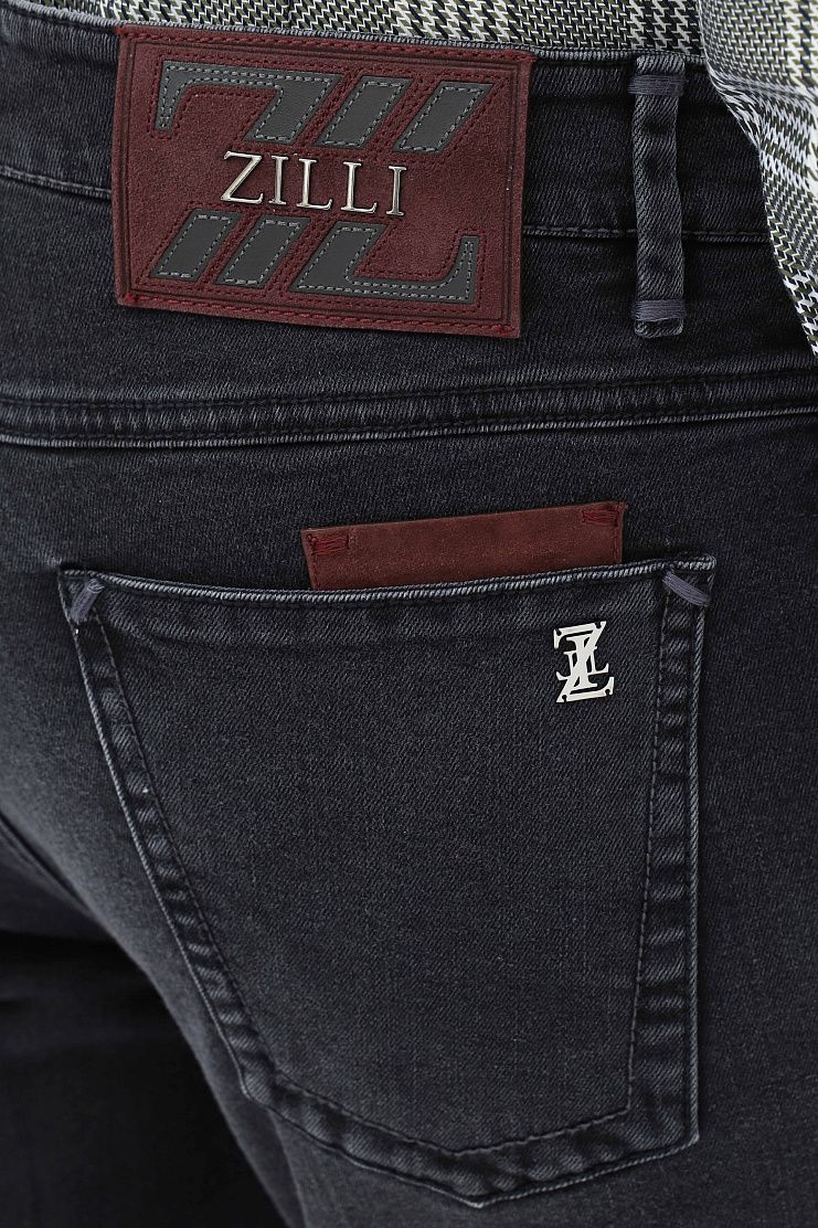 Джинсы, украшенные замшевой нашивкой на поясе и стилизованным логотипом Zilli на заднем кармане. Модель прямого кроя с застежкой на молнию и металлическую пуговицу с изображением льва.