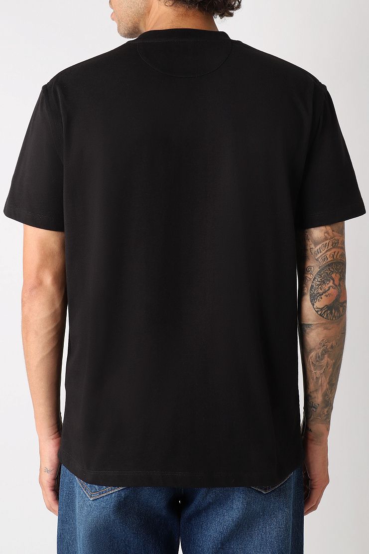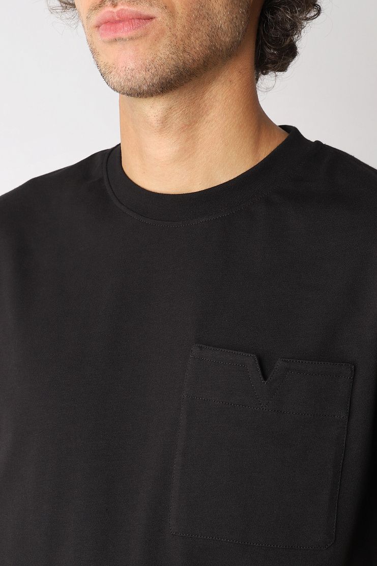 Футболка выполнена из натурального хлопка. Такой материал отлично впитывает влагу и пропускает воздух, гарантируя комфорт в любую погоду. Нагрудный карман дополнен декоративной деталью с небольшим V-образным вырезом.