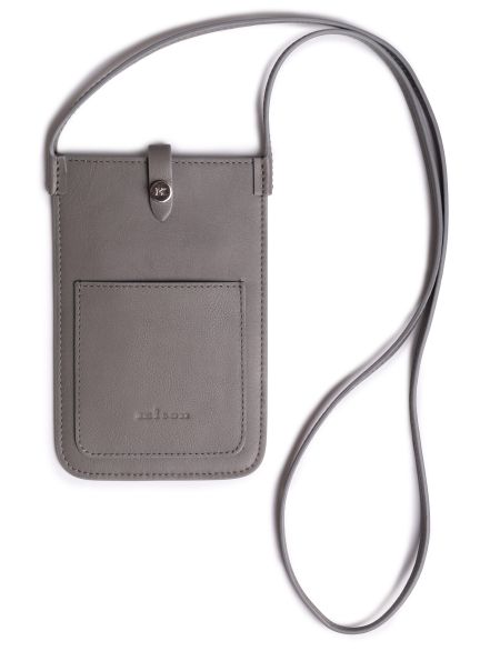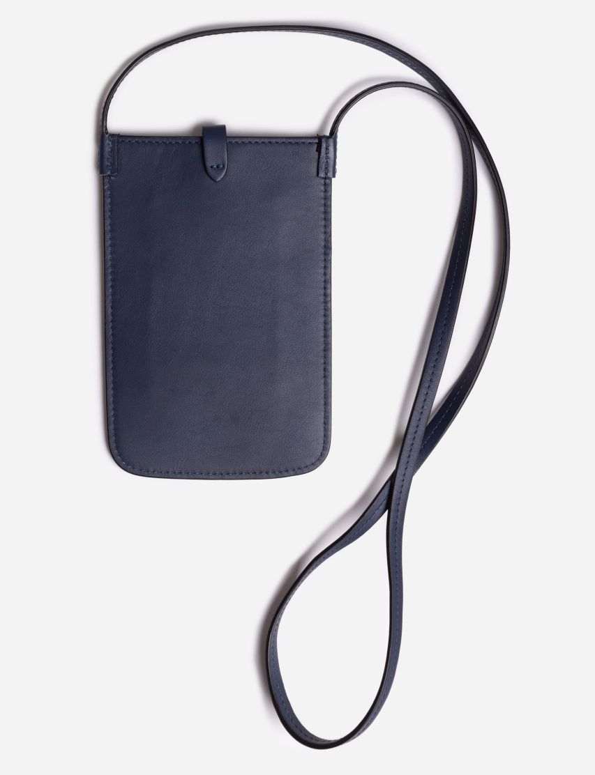 Компактный чехол для телефона изготовили из гладкой и прочной телячьей кожи. Аксессуар с основным отделением и слотами для банковских карт застегивается на кнопку. Благодаря узкому ремешку футляр можно носить через плечо. Спереди разместили плоский карман с тисненым логотипом марки.