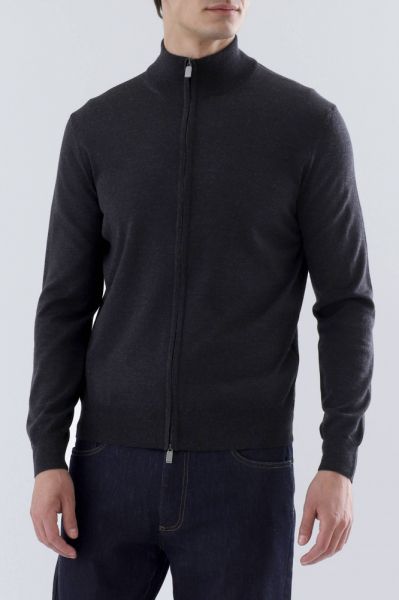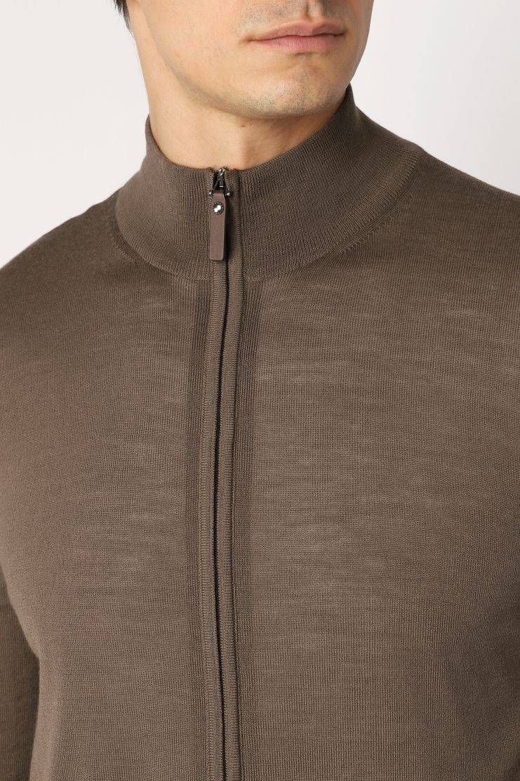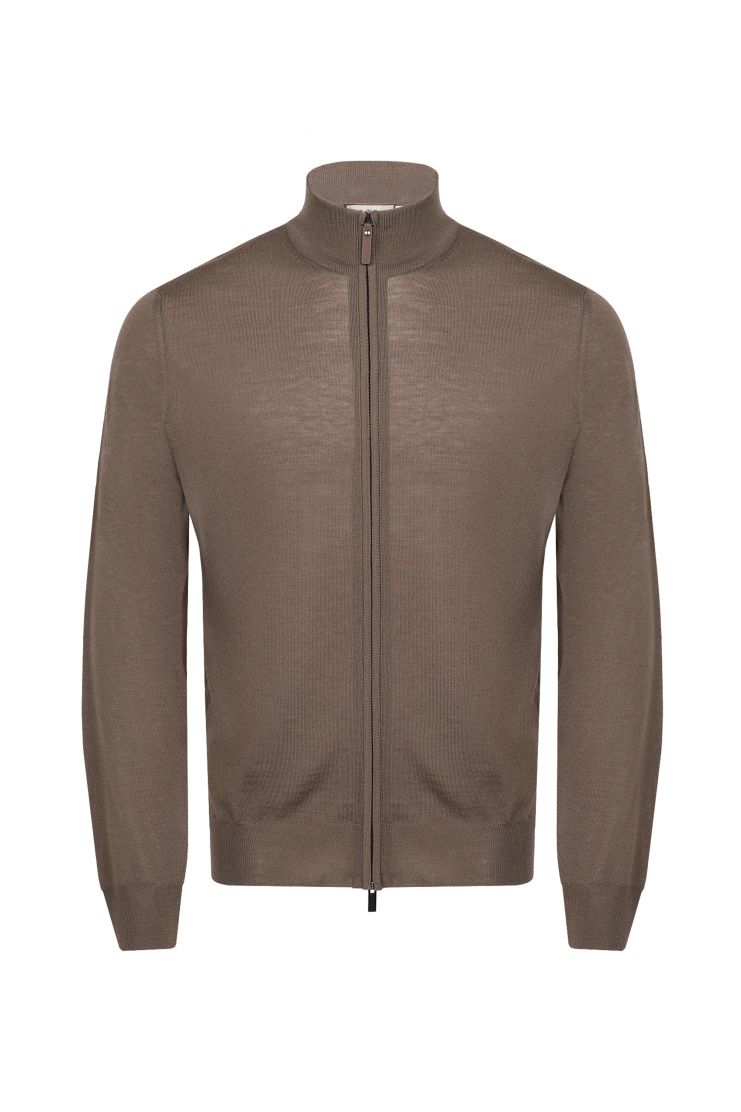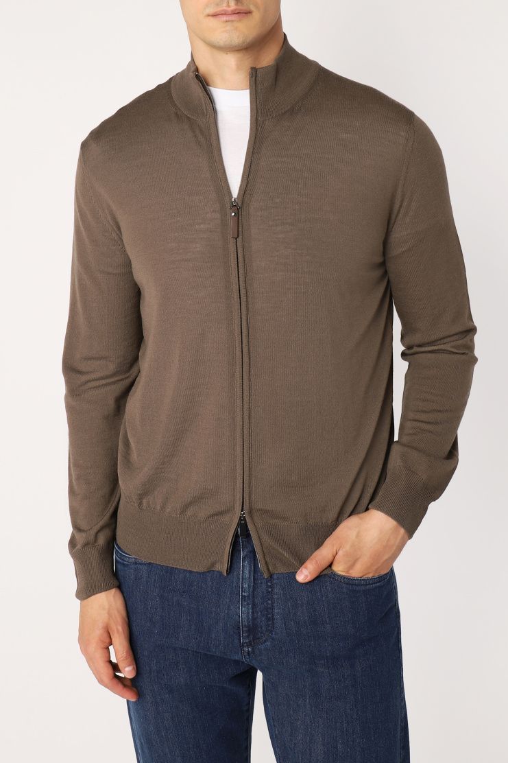 Кардиган серого цвета из чистой шерсти. Модель с воротником-стойкой, манжетами и низом в рубчик.