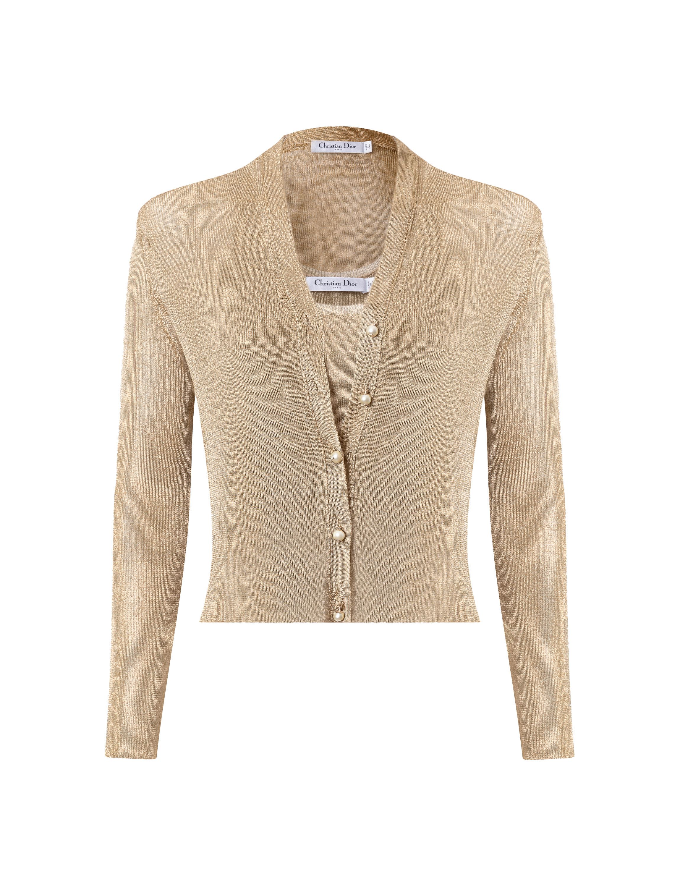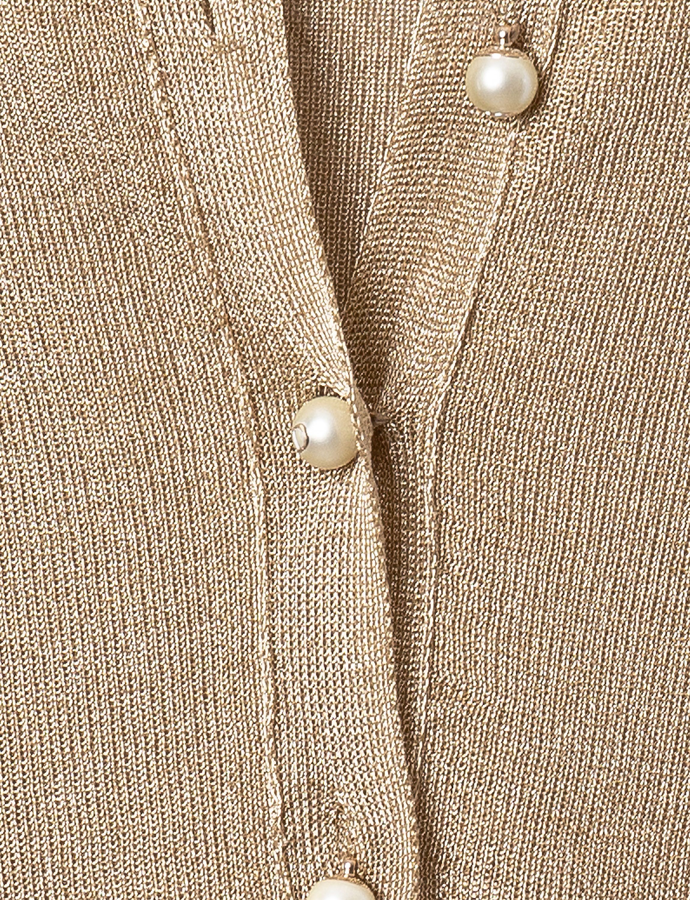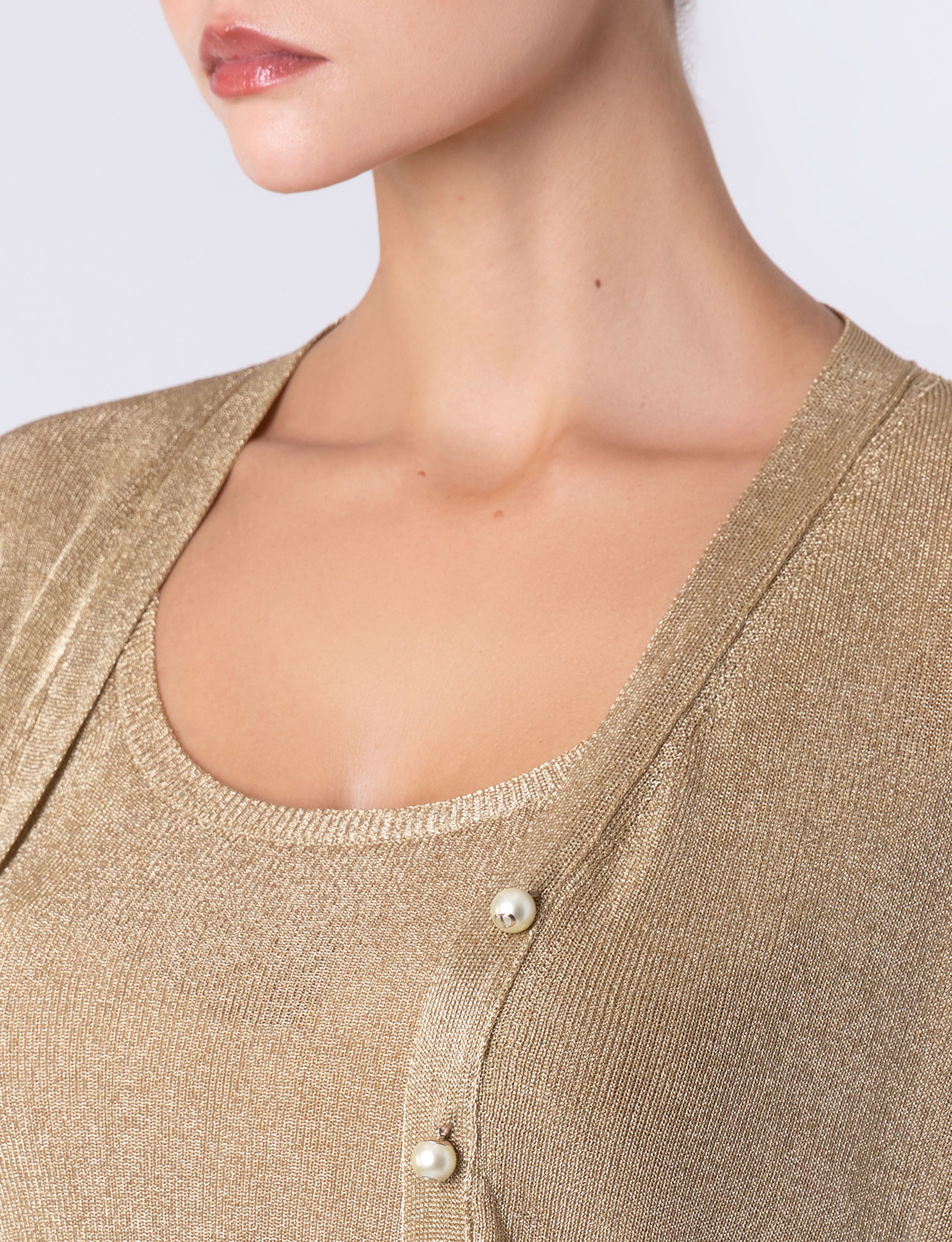 Кардиган с V-образным вырезом и разрезом, обхватывающим шею и область декольте. Модель свободного кроя имеет застежку на кнопки.