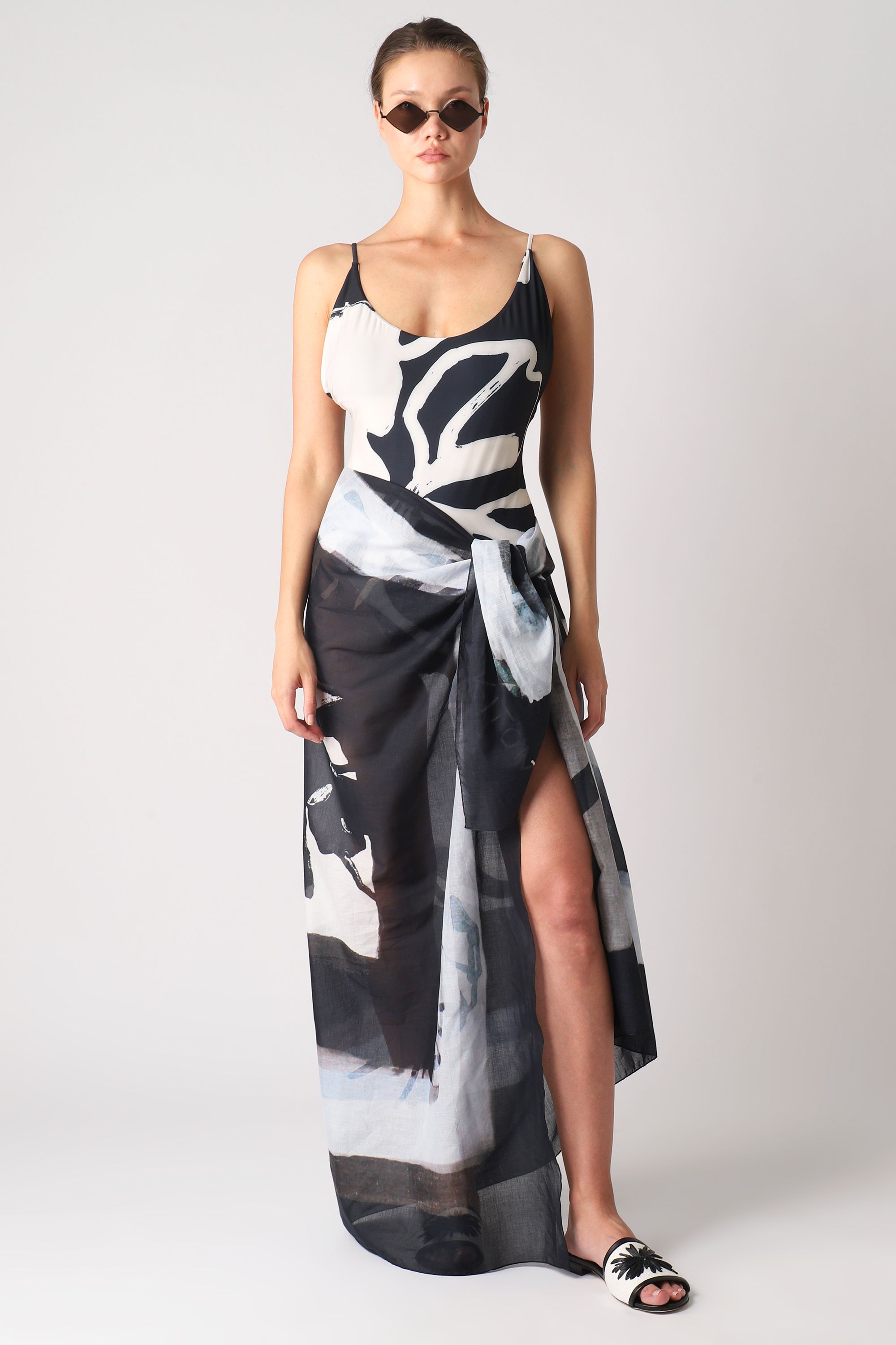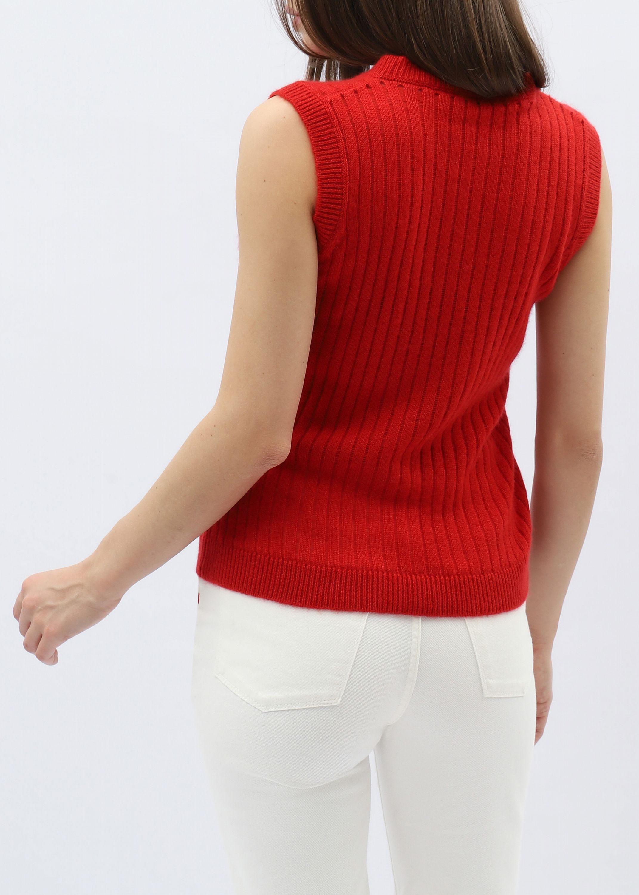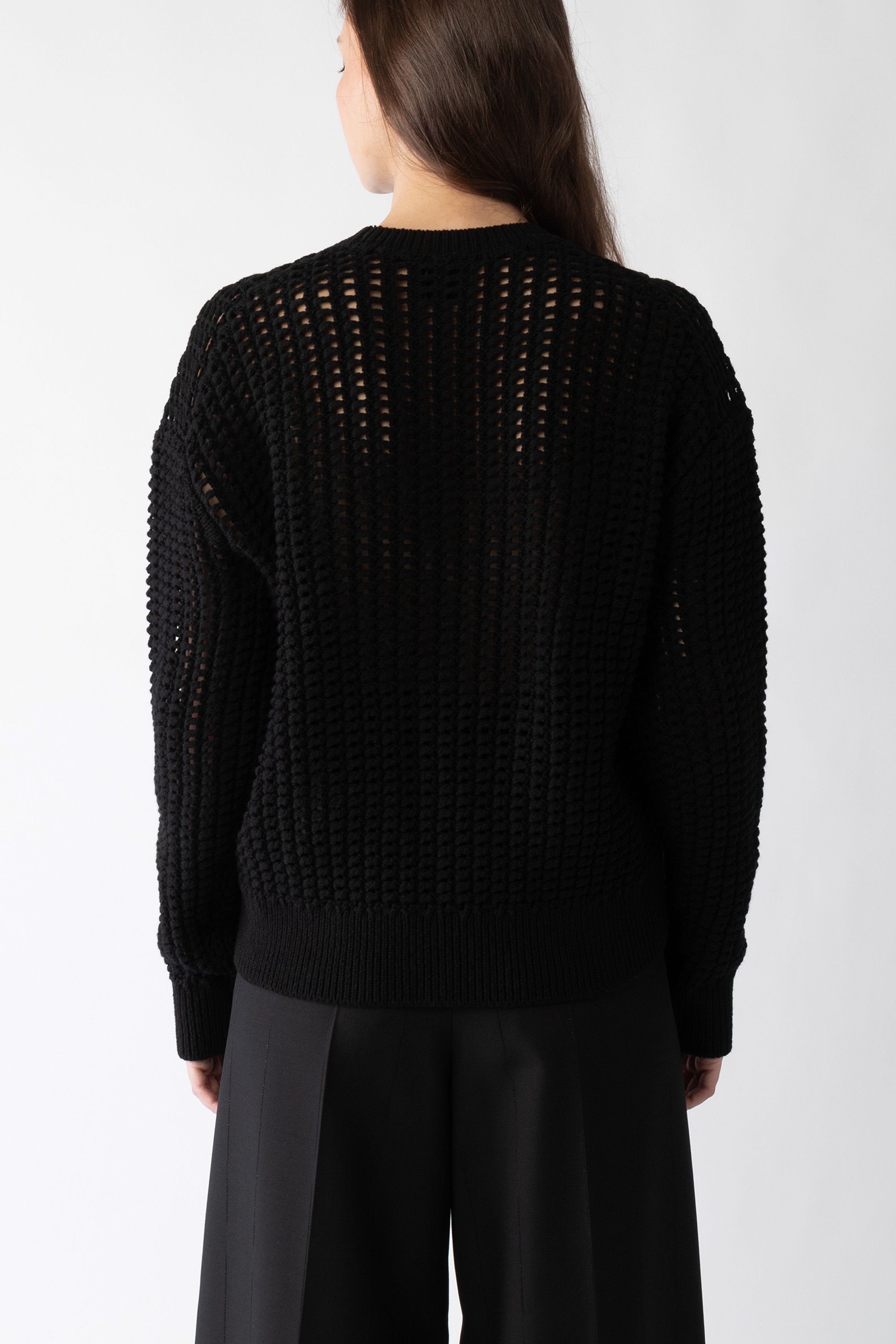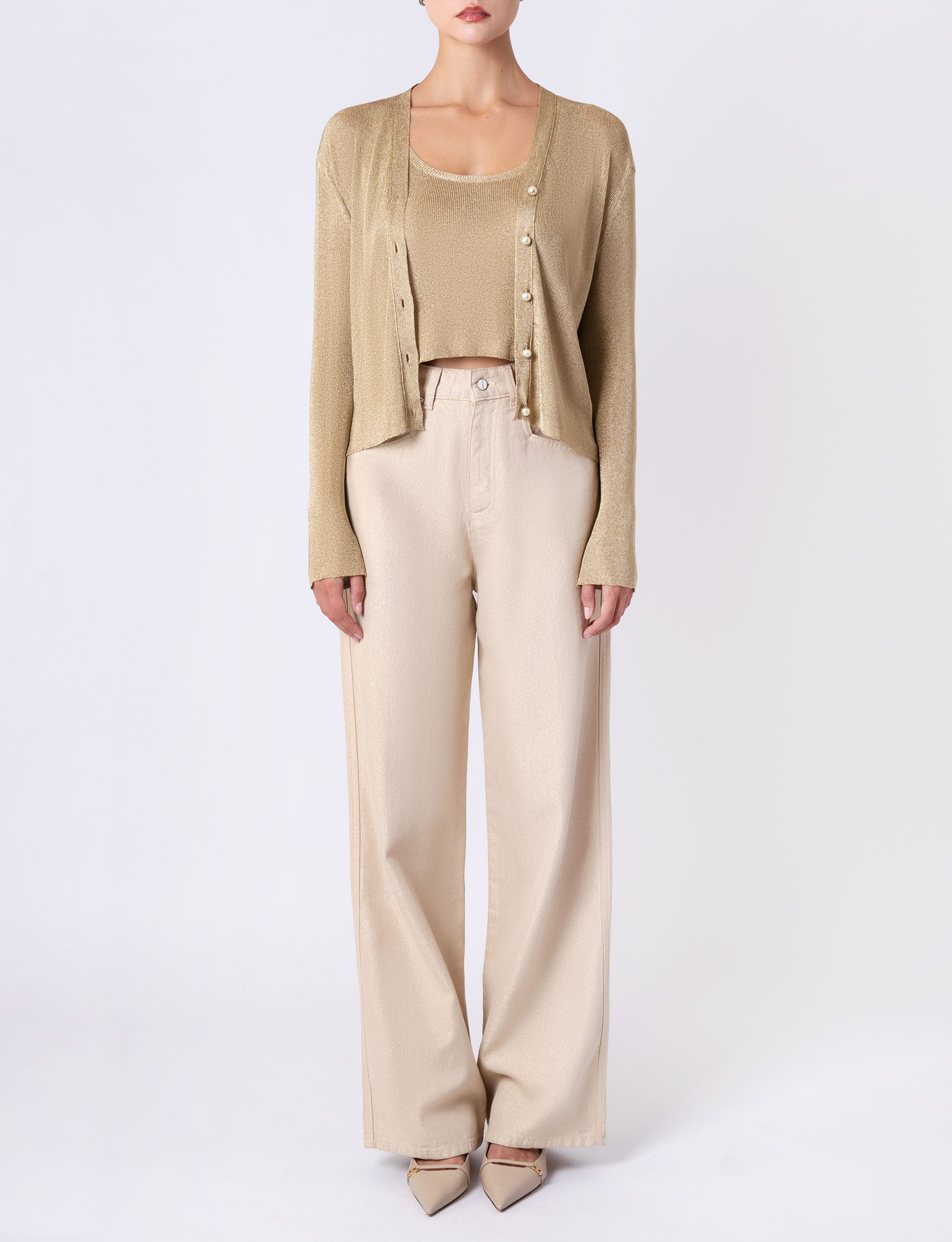 Кардиган с V-образным вырезом и разрезом, обхватывающим шею и область декольте. Модель свободного кроя имеет застежку на кнопки.