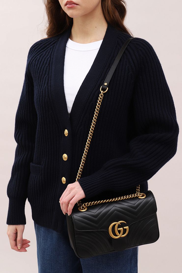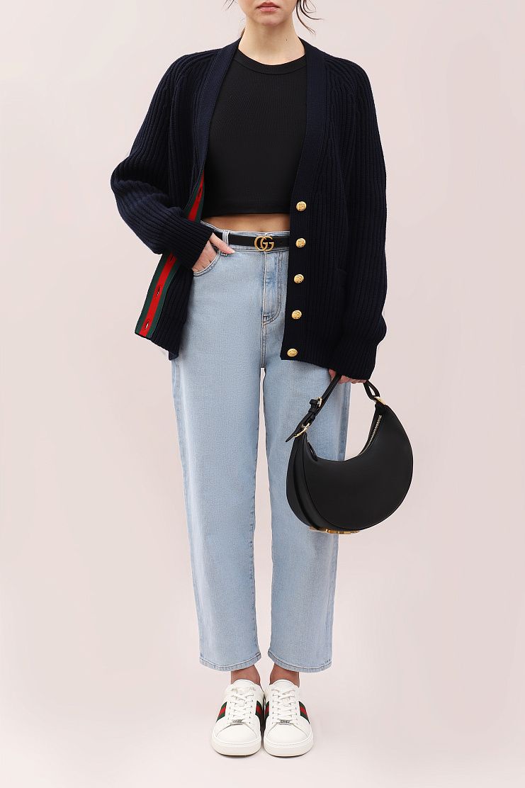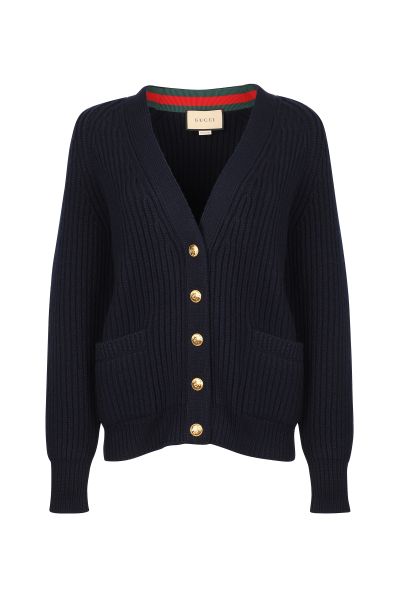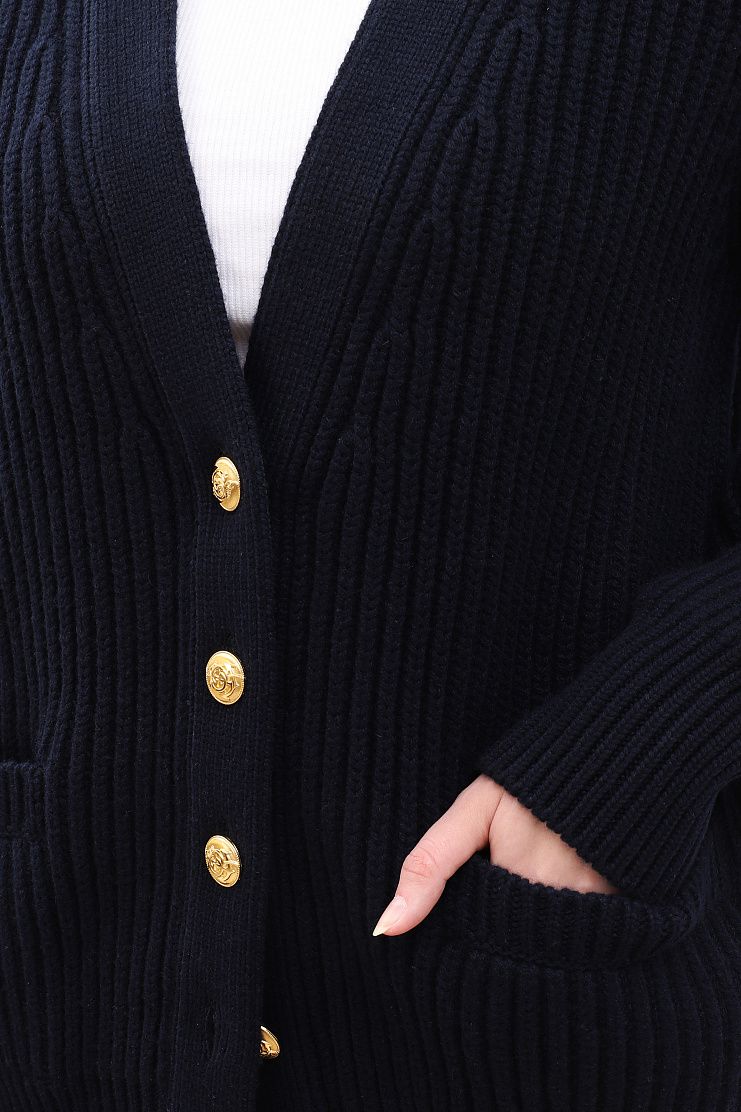 Объемный кардиган плотной вязки с акцентными золотистыми пуговицами и культовой красно-зеленой полоской с внутренней стороны позволит Вам чувствовать себя роскошно в повседневном образе. Модель имеет V-образный вырез и боковые накладные карманы.