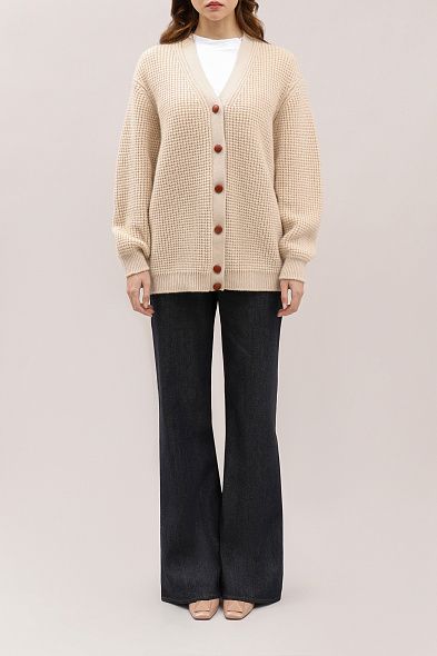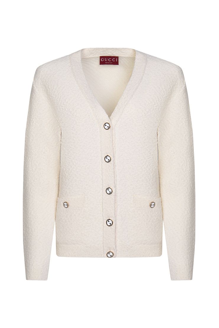 Свободный кардиган со спущенной линией плеч выполнен из эластичного шерстяного букле. Благодаря тому, что материал настолько мягкий и приятный на ощупь, изделие комфортно носить на голое тело. Модель с V-образным вырезом дополнена карманами, рифленой отделкой на манжетах и поясе, а также покрытыми эмалью пуговицами с монограммой GG.
