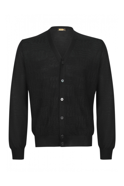 Кардиган из кашемира и шелка. Изделие тонкой фактурной вязки с V-образным вырезом и фирменными переливающимися пуговицами. В сочетании с рубашкой или однотонной футболкой модель идеально подойдет для раслабленного делового стиля.