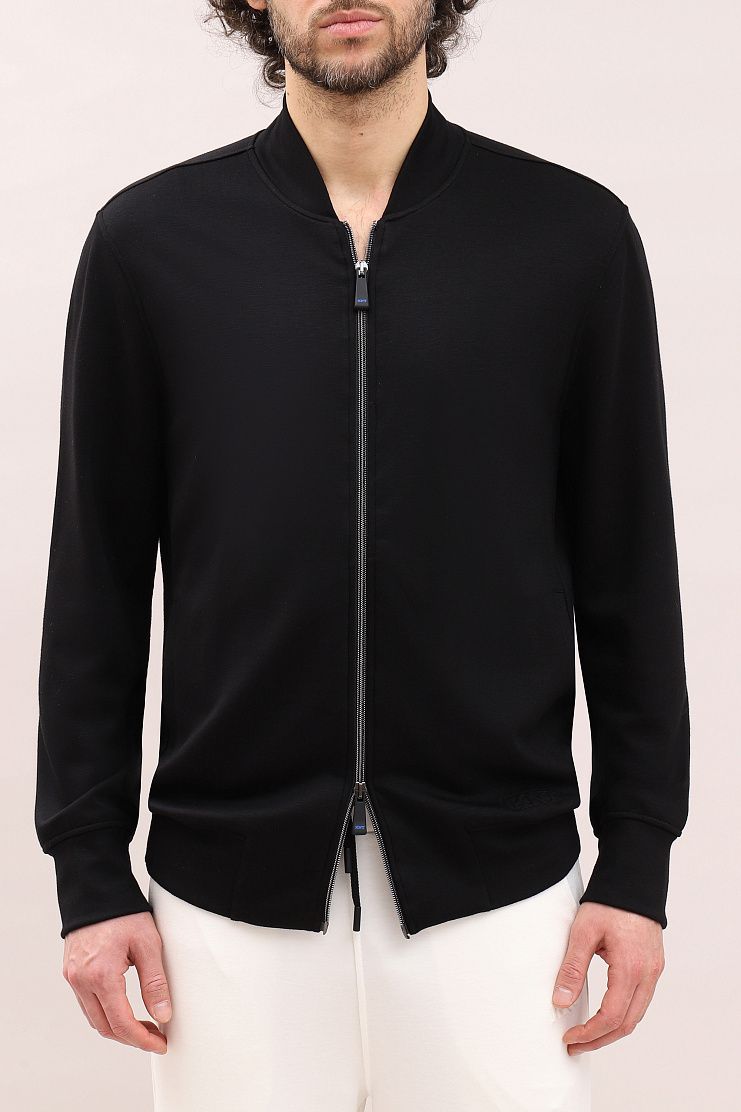 Спортивный кардиган прекрасно подойдет для комфортного отдыха. Модель свободного кроя с воротником-стойкой, манжетами и нижним краем из трикотажной резинки и застежкой на молнию.