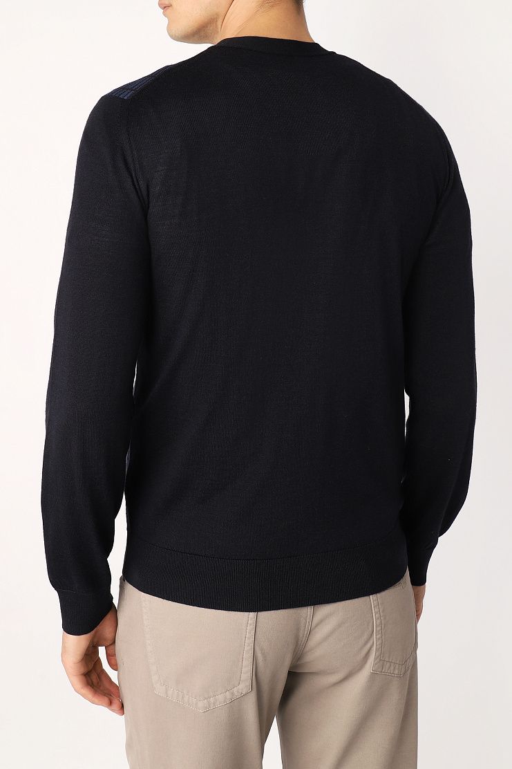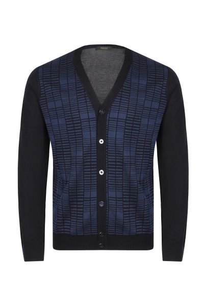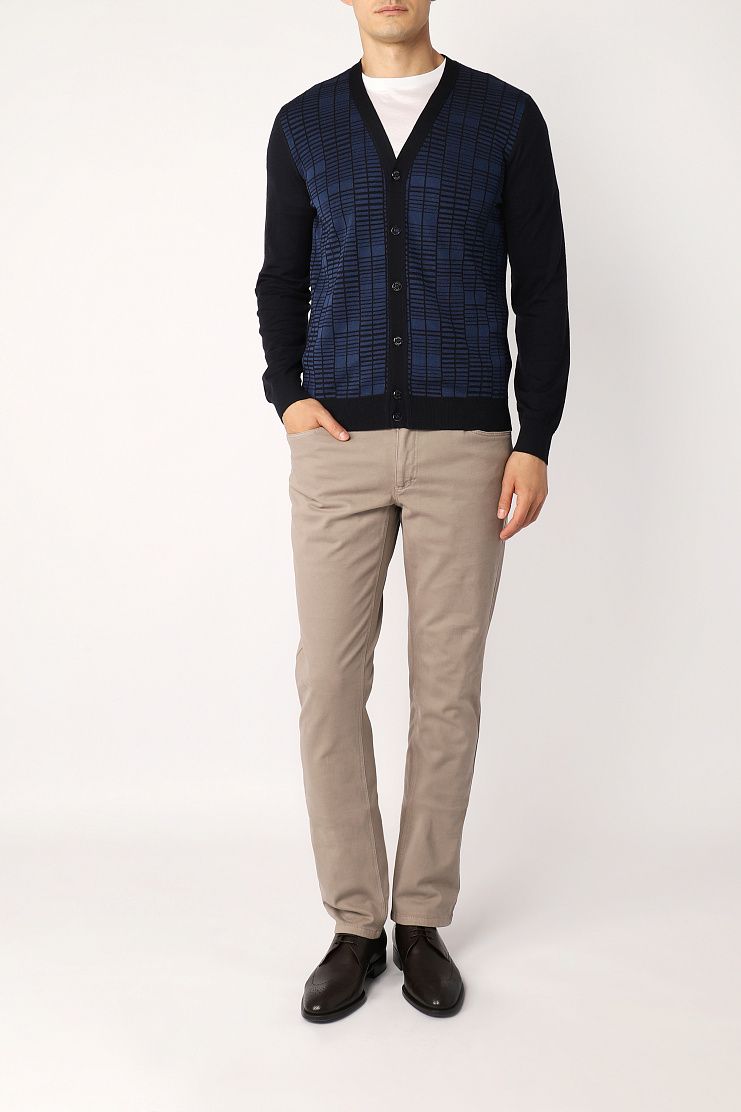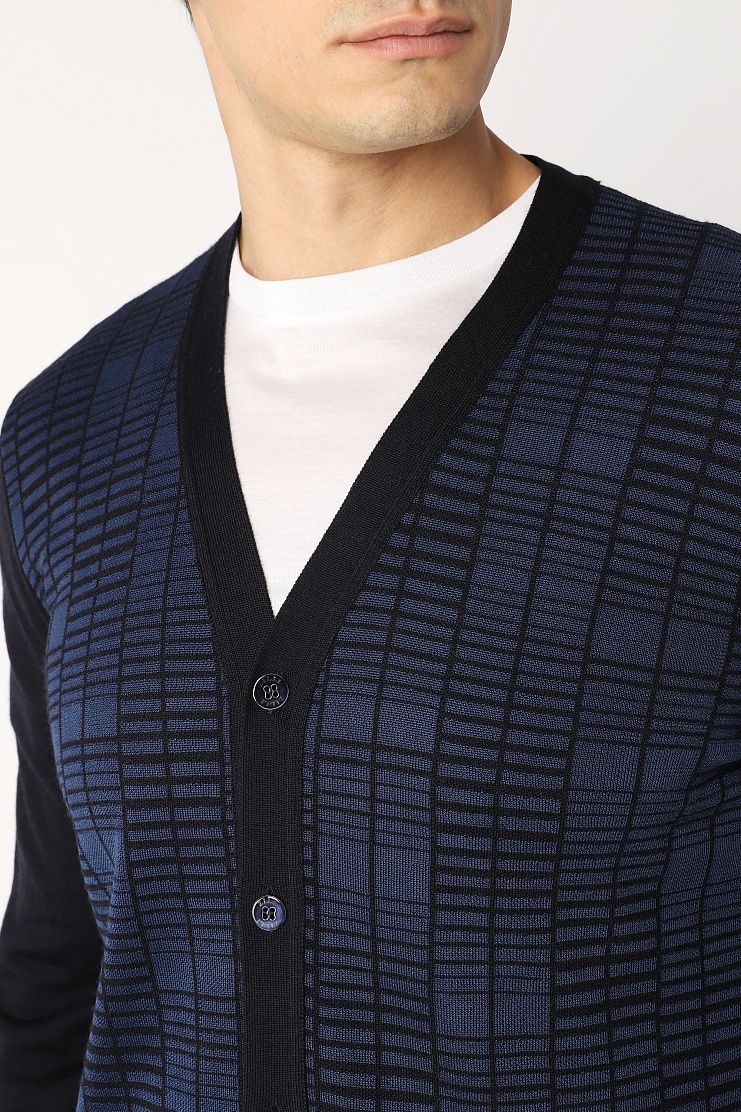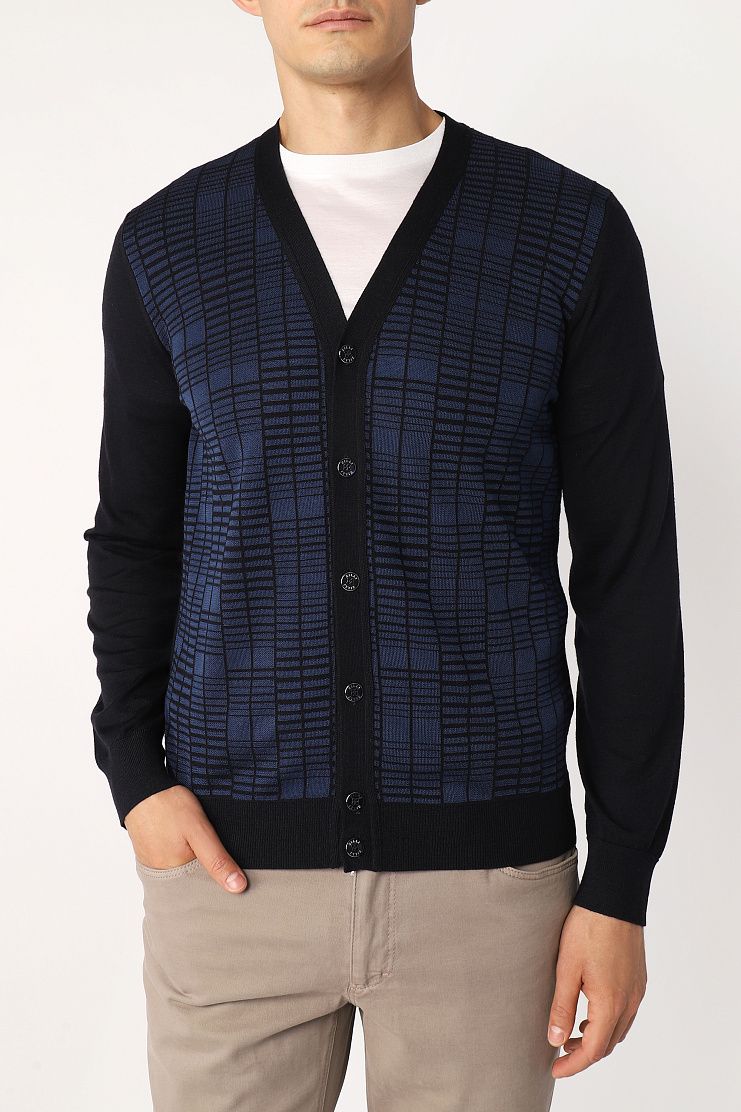 Кардиган с V-образным вырезом выполнили из шерстяного трикотажа с добавлением шелка и кашемира. Модель с графичным жаккардовым узором спереди застегивается на брендированные пуговицы.