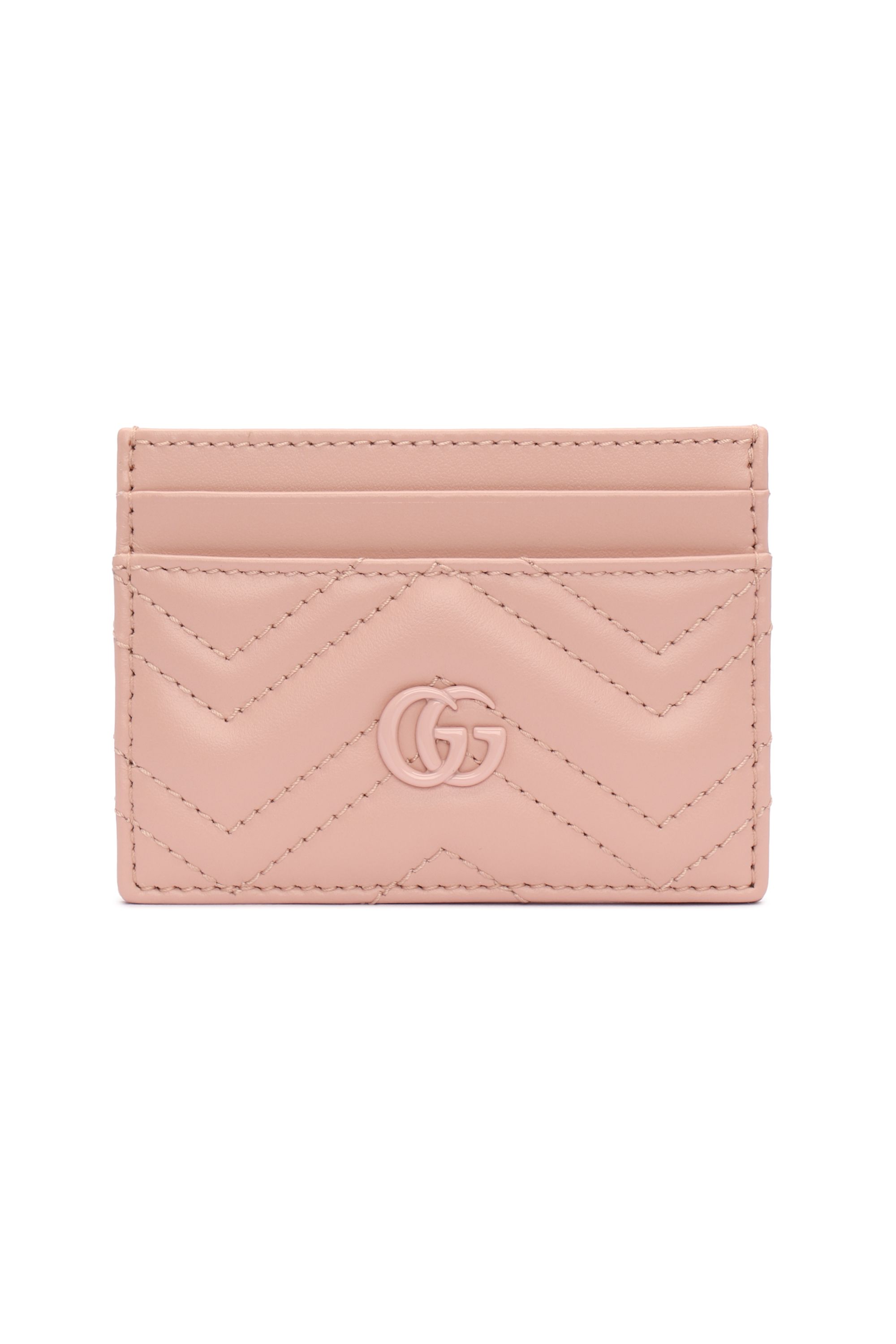 Кожаный картхолдер с декоративной зигзагообразной строчкой и логотипом в виде двойной буквы G. Аксессуар имеет по два слота для карт с каждой стороны и основное отделение.