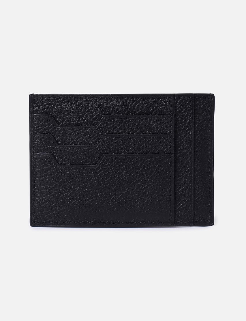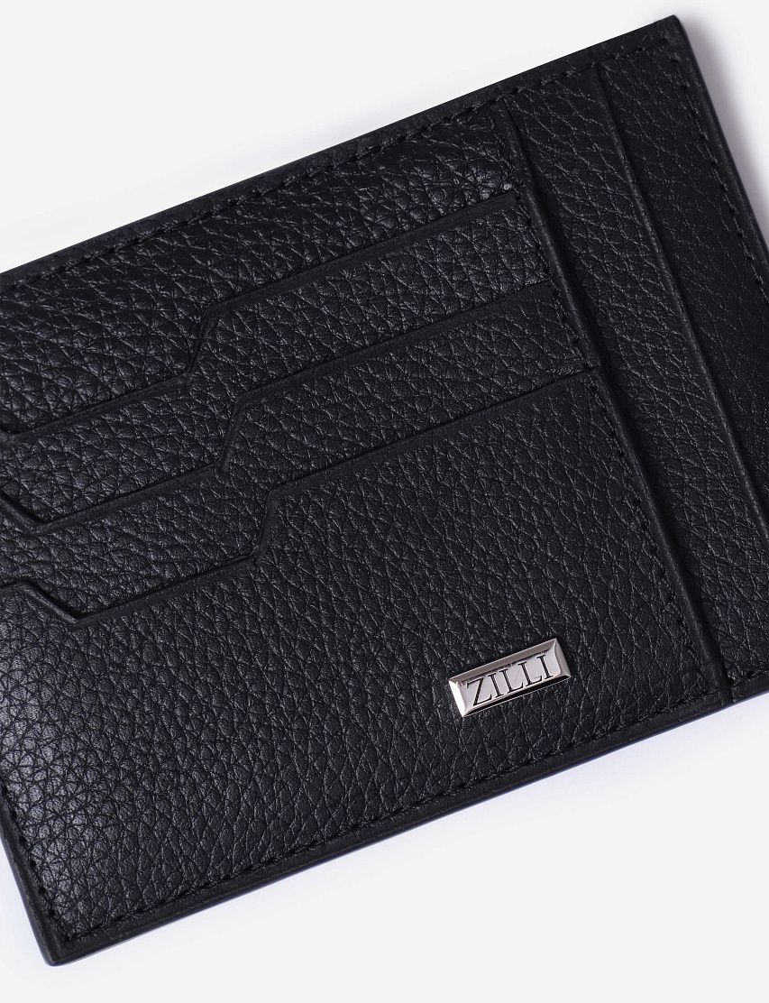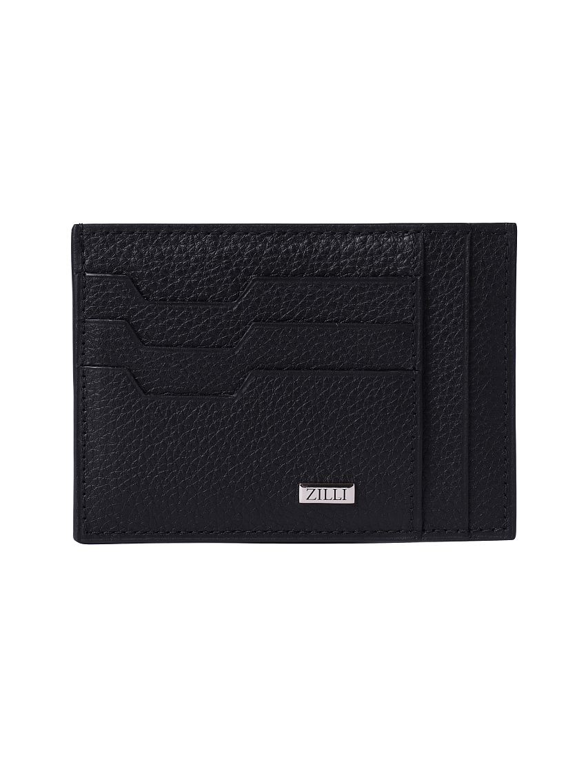 Футляр для кредитных карт с отделением для чеков выполнили из прочной зернистой кожи. На панелях с обеих сторон разместили слоты для кредитных карт с фигурными вырезами. Аксессуар декорировали металлической пластиной с выгравированным логотипом Zilli.