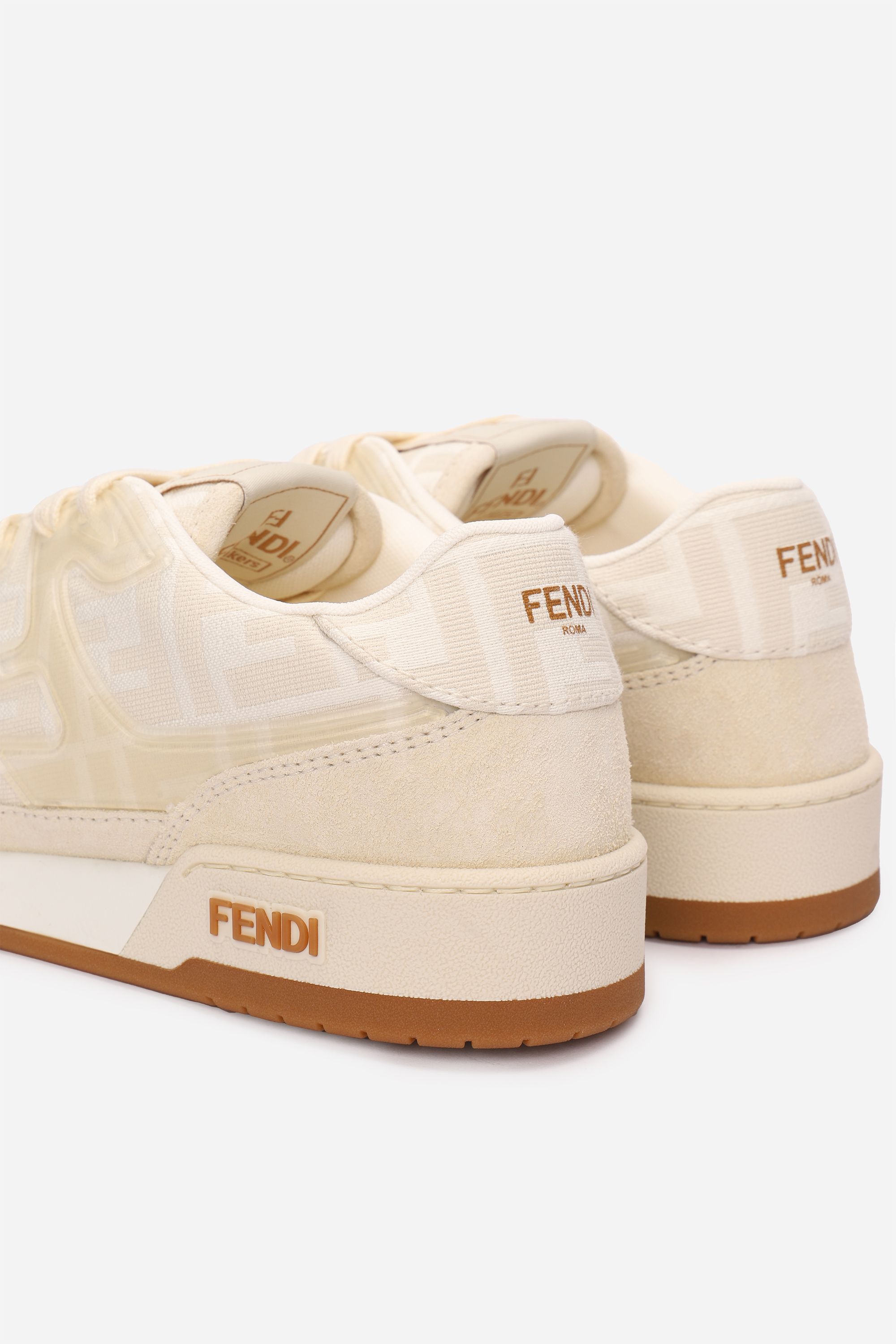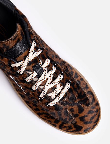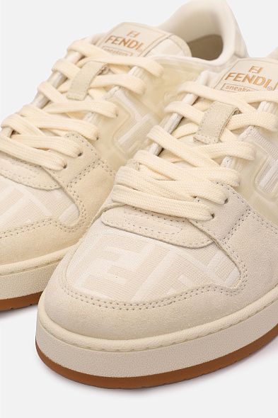Кеды на шнуровке выполнили из матовой телячьей кожи, дополнив вставками из замши на мысе. Пара украшена контрастными деталями на боковых панелях и заднике. На язычке и тонкой резиновой подошве разместили логотип марки.