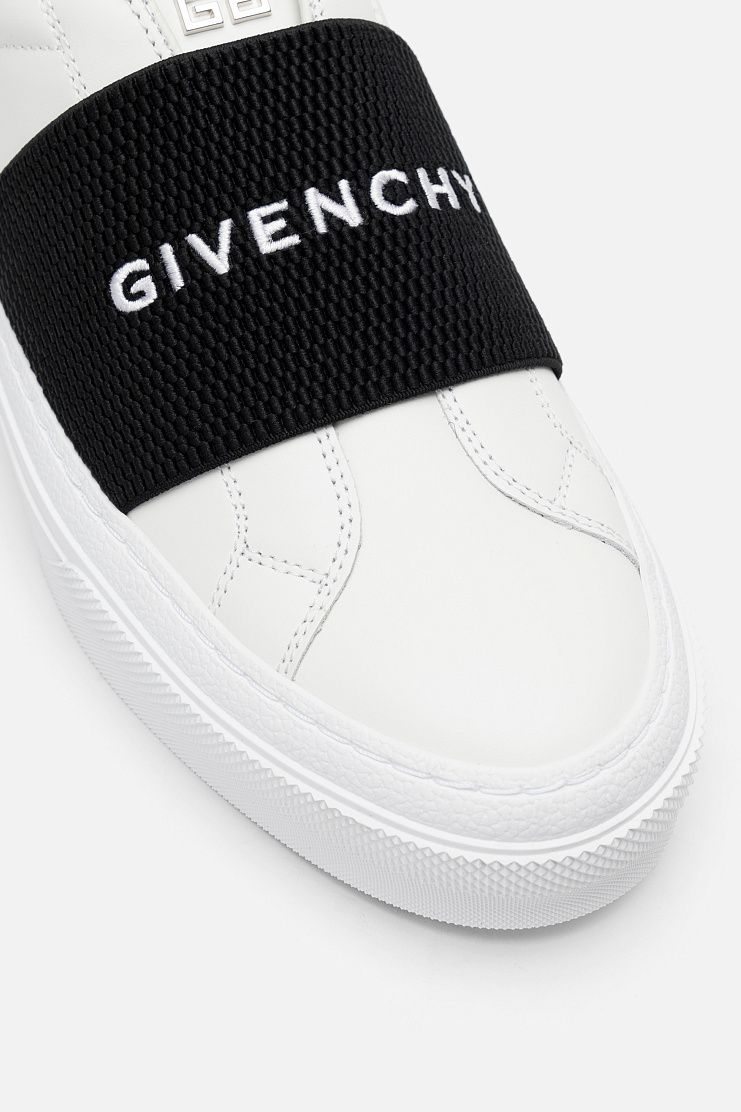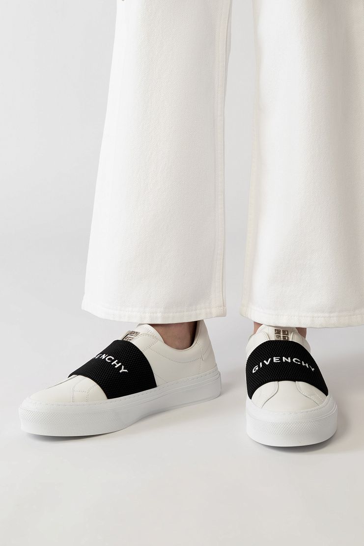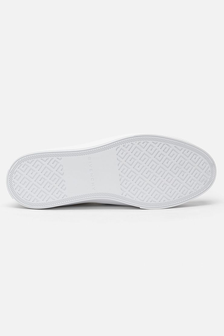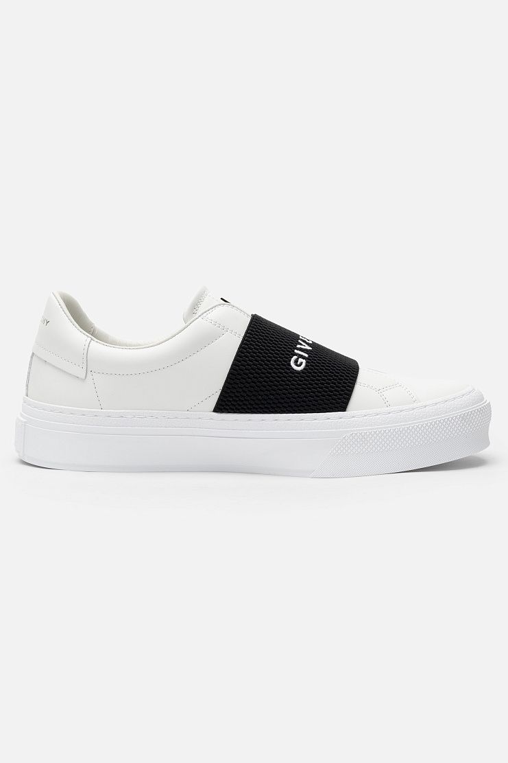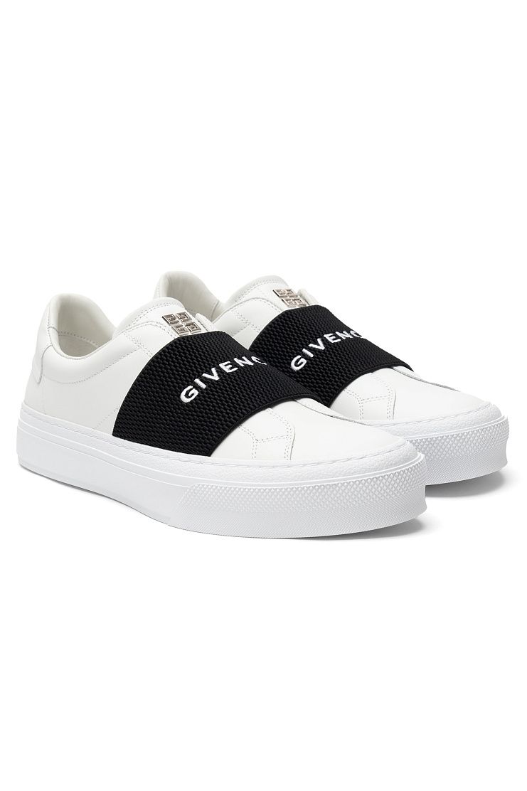 Кеды без шнурков на широкой резиновой подошве сшили из прочной и гладкой телячьей кожи. Пара дополнена контрастной текстильной вставкой и украшена логотипами на заднике, подошве и язычке.