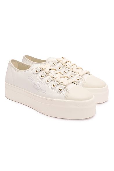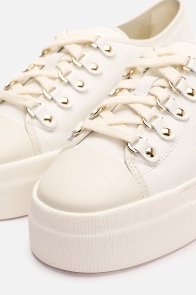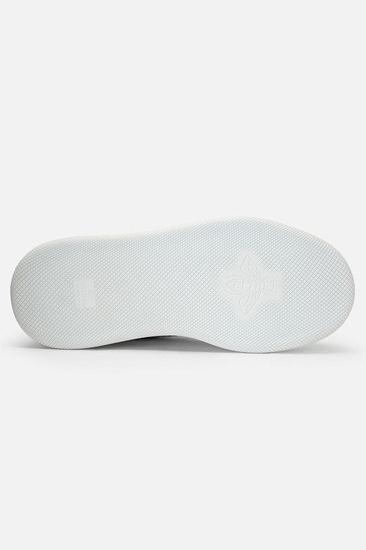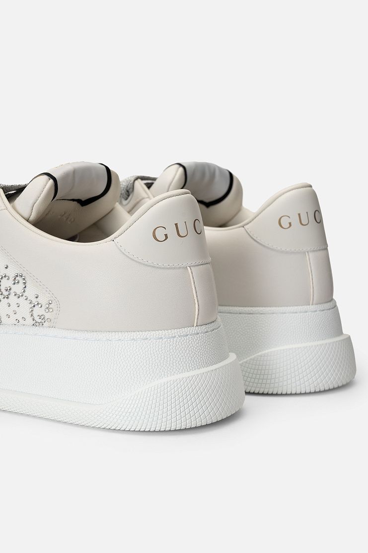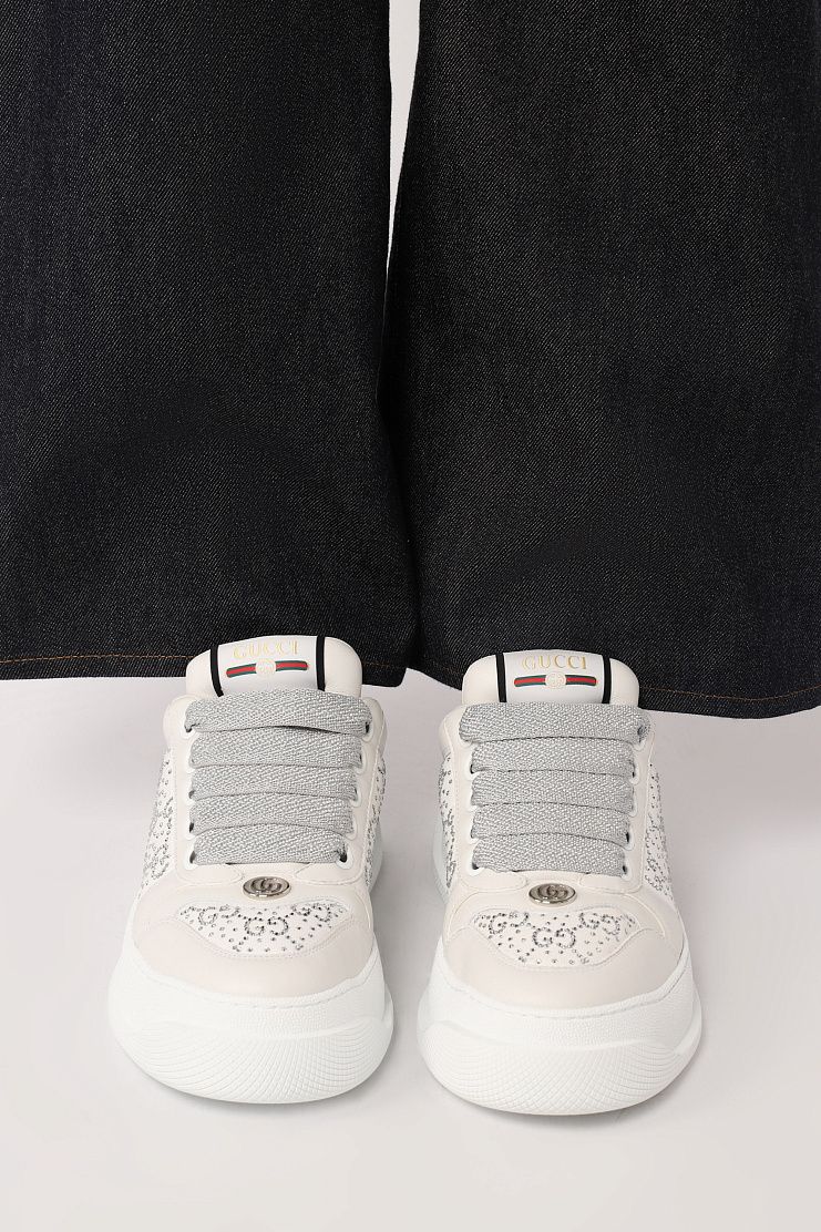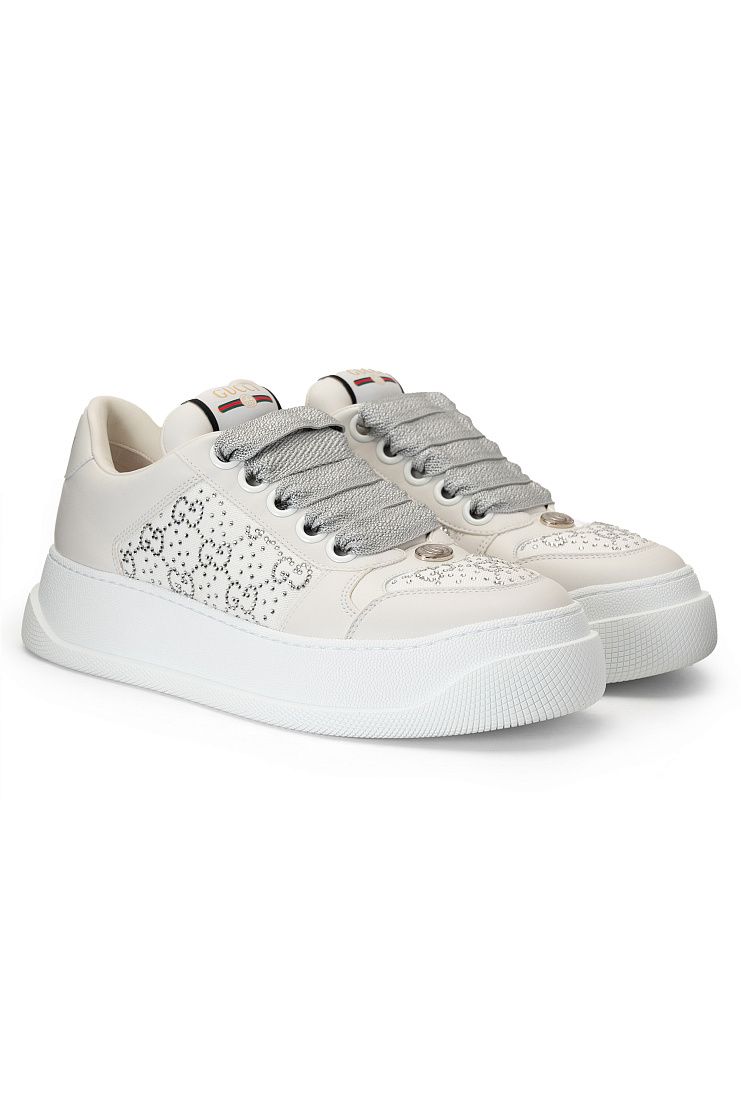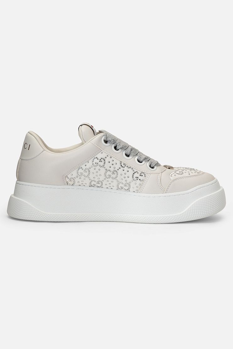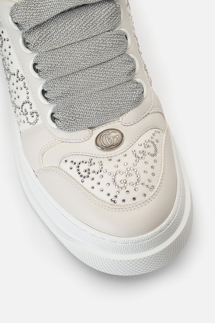 Комбинированные кеды сшили из гладкой кожи и плотного текстиля. Модель с закругленным носком дополнена широкой подошвой и шнуровкой. Пару украсили узором GG Supreme, выполненным из страз, а также нашивкой с логотипом на язычке и пряжкой Double G. Высота подошвы: 5 см.