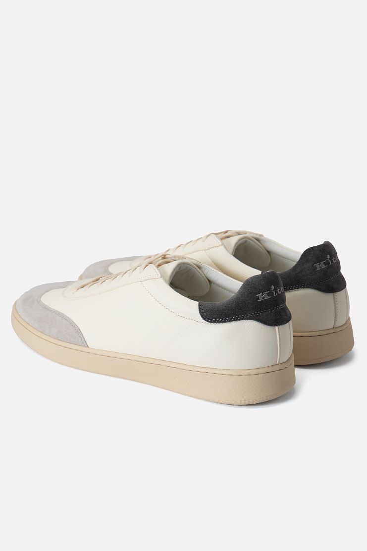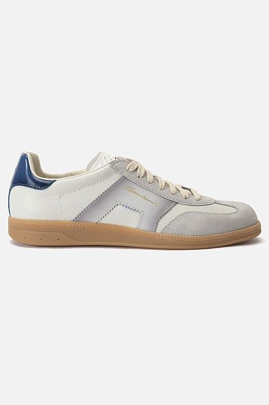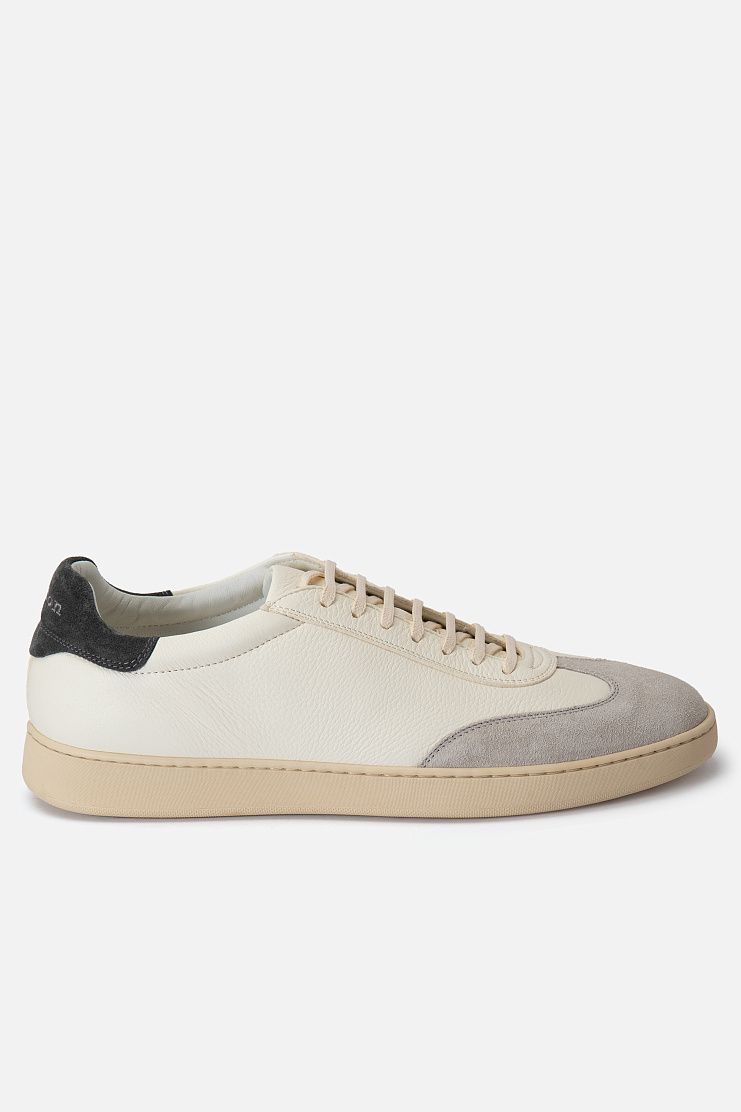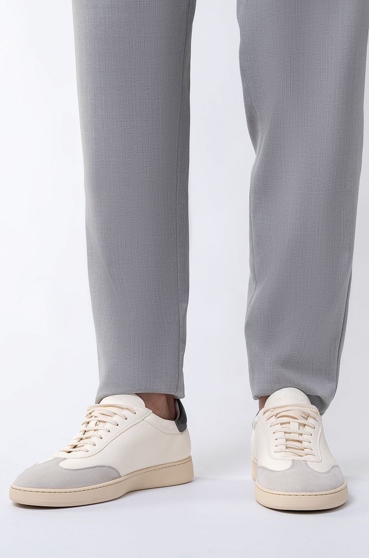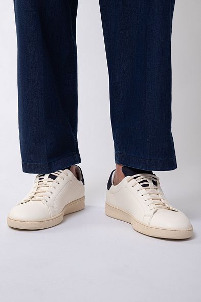 Кеды на резиновой подошве выполнили из гладкой кожи, дополнив контрастными замшевыми вставками на мысе и заднике. Пара дополнена внутренней кожаной отделкой и шнуровкой.