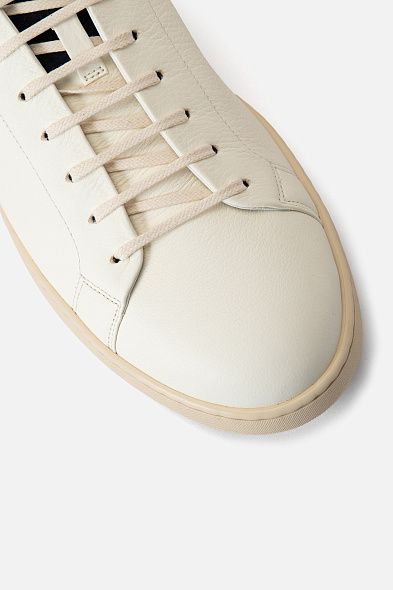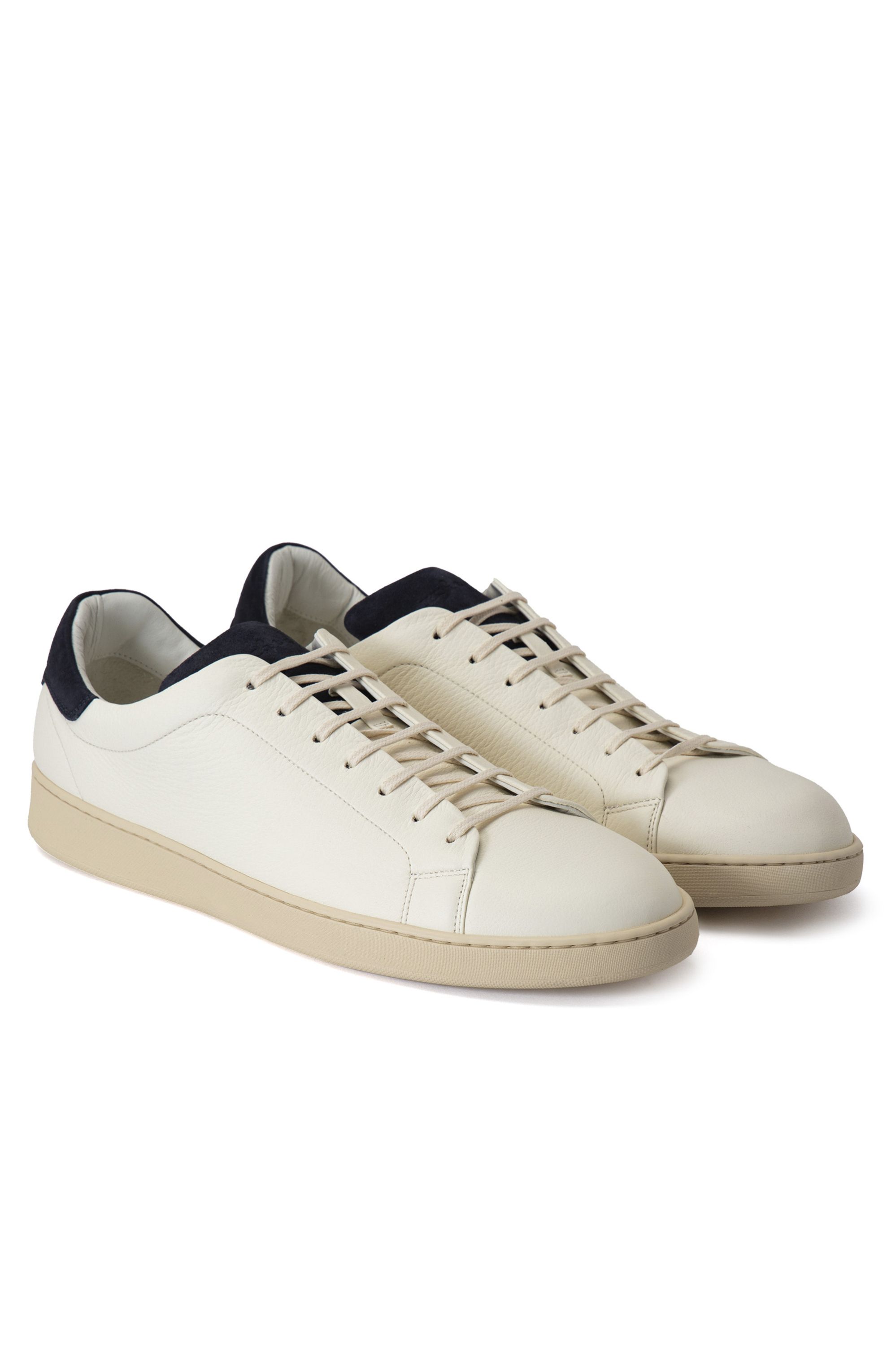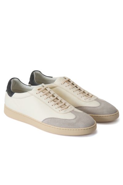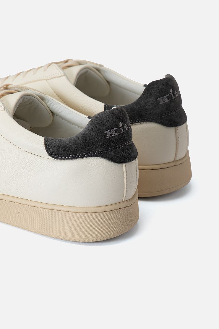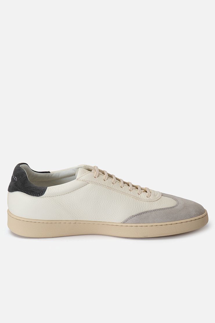 Кеды на резиновой подошве выполнили из гладкой кожи, дополнив контрастными замшевыми вставками на мысе и заднике. Пара дополнена внутренней кожаной отделкой и шнуровкой.