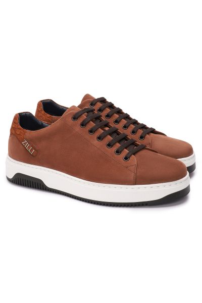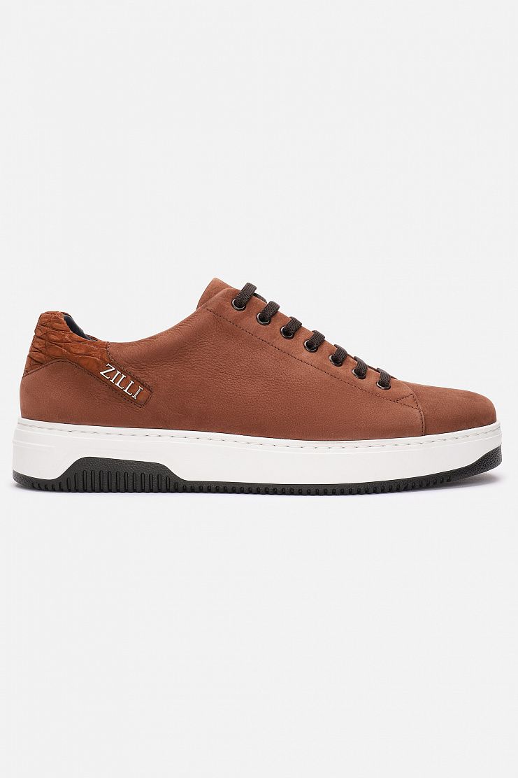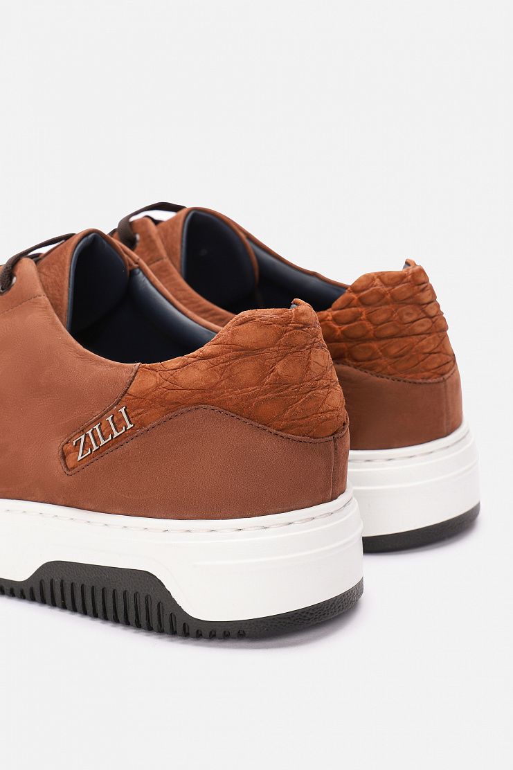 Кеды из нубука с вставками из кожи каймана и металлическим логотипом Zilli по бокам. Модель имеет кожаную подкладку и резиновую подошву.